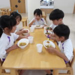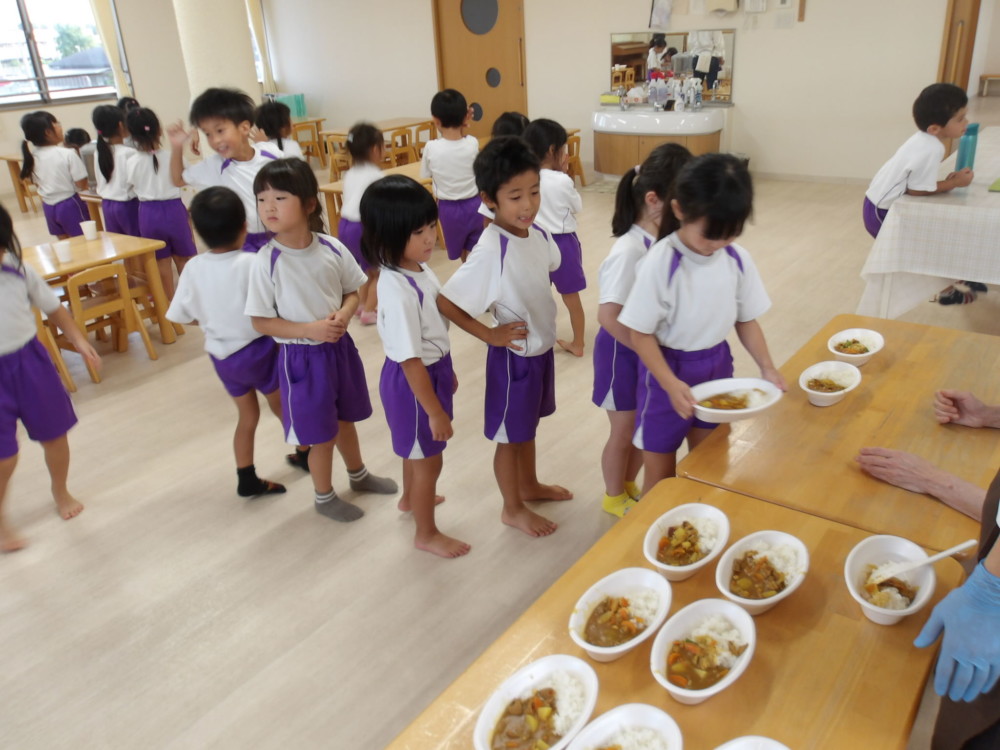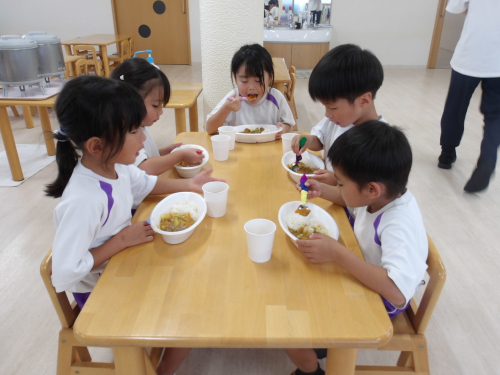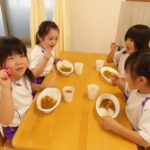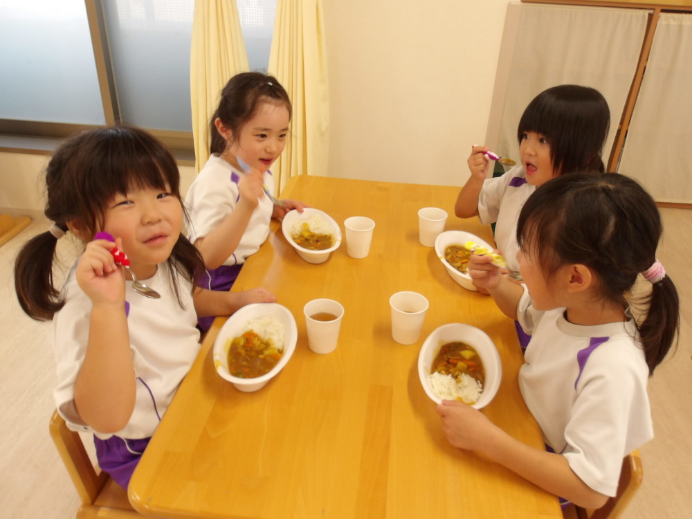 お腹ペコペコでカレーライスをいただきます。スプーンは、アクティ森で作ったオリジナルのマイスプーン! 美味しくって箸、いやスプーンがすすみます。