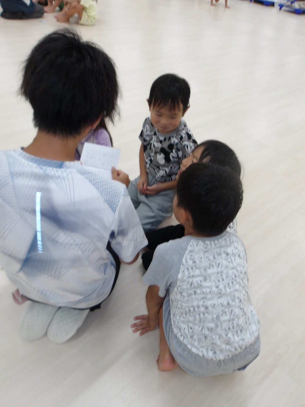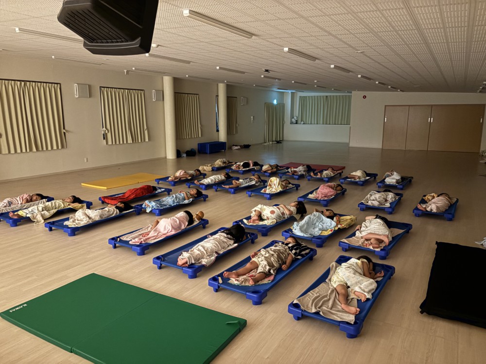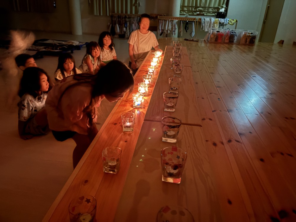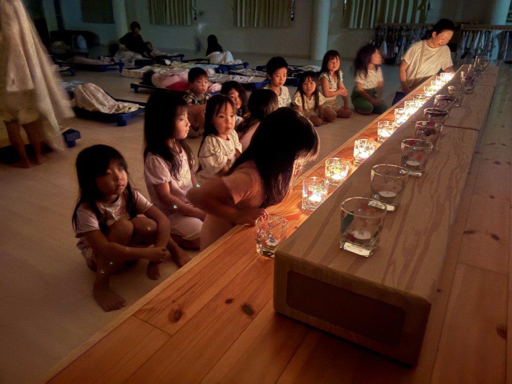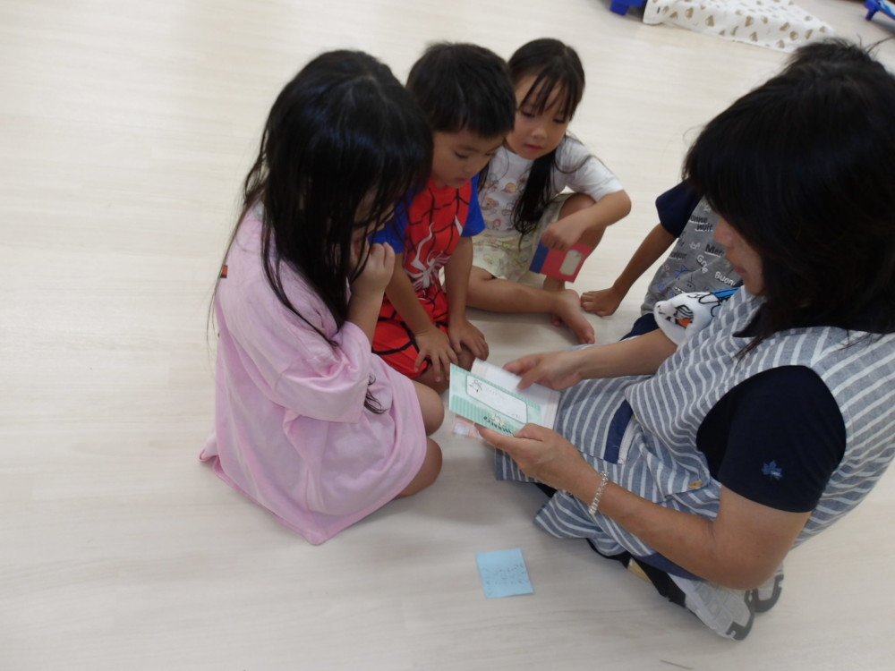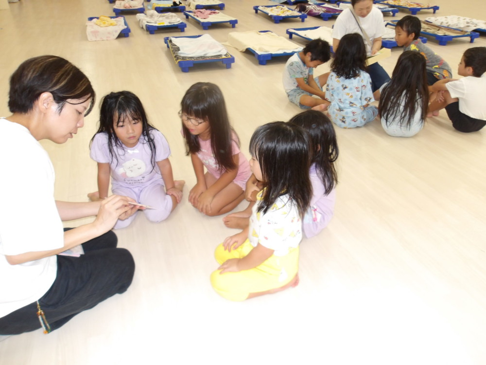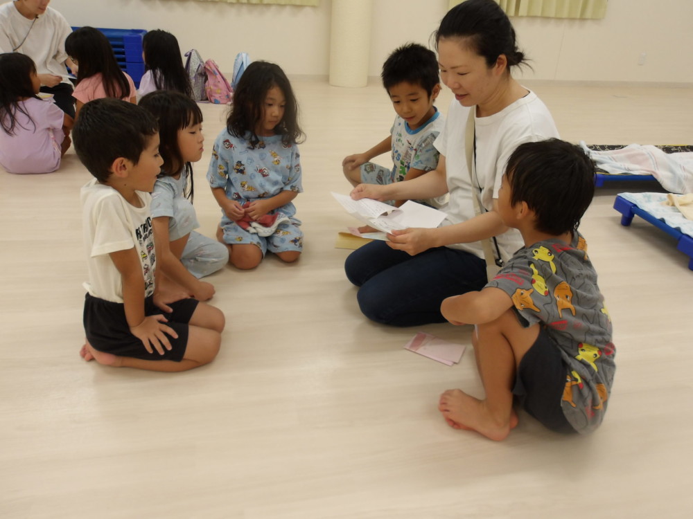 小さい子たちのプールにお湯を張り、お風呂の完成。汗を流したその後は、パジャマに着替えていよいよ就寝。保護者からの皆様から、いただいた手紙を職員が代読です。サプライズの手紙。ありがとうございました。
