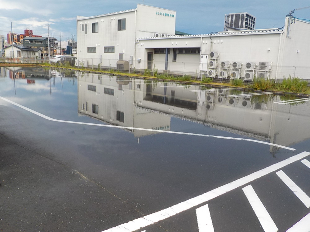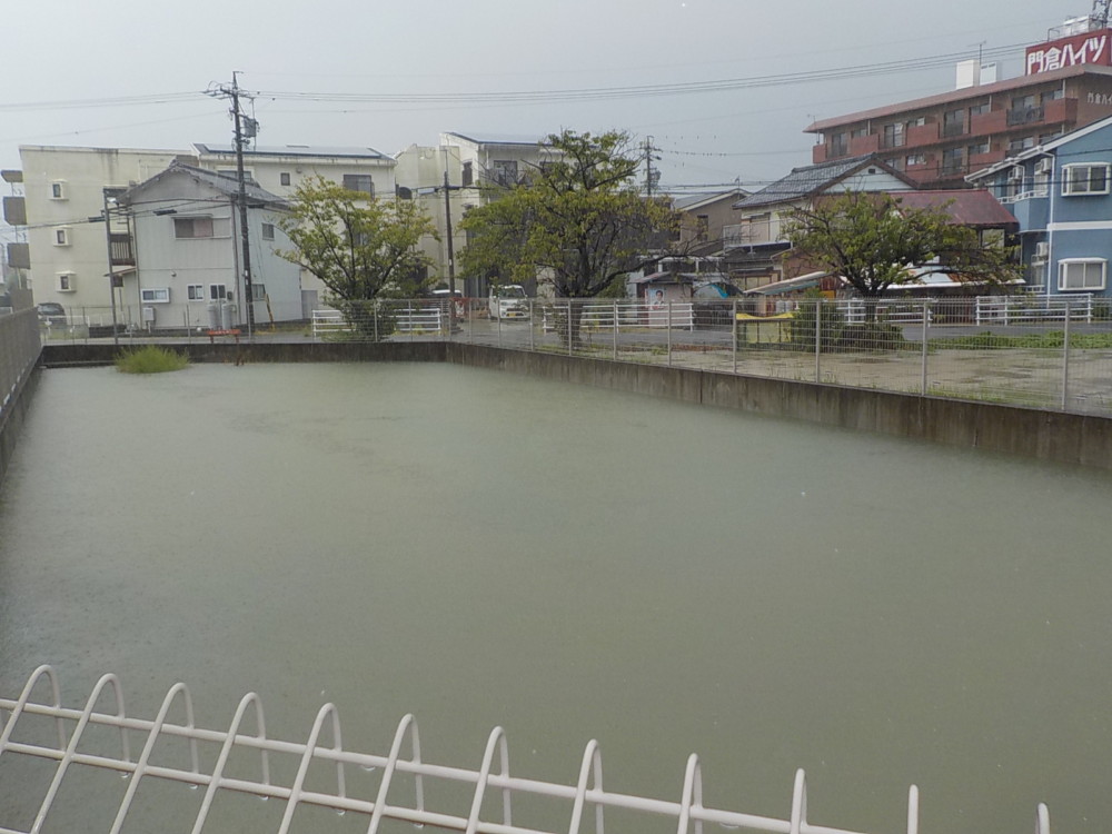 調整池の水位が下がらないので、雨が上がった後も駐車場の水も引かず…。めろん組さんからは、水のたっぷり入った調整池で「泳ぎたい!」なんて声もあがっていたようです。保護者の方のお迎えも、迂回して大変だったと思います。災害時の対応を改めて考えないといけませんね。