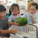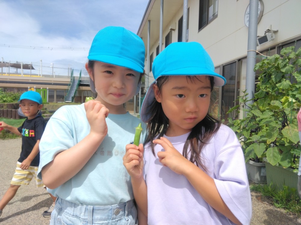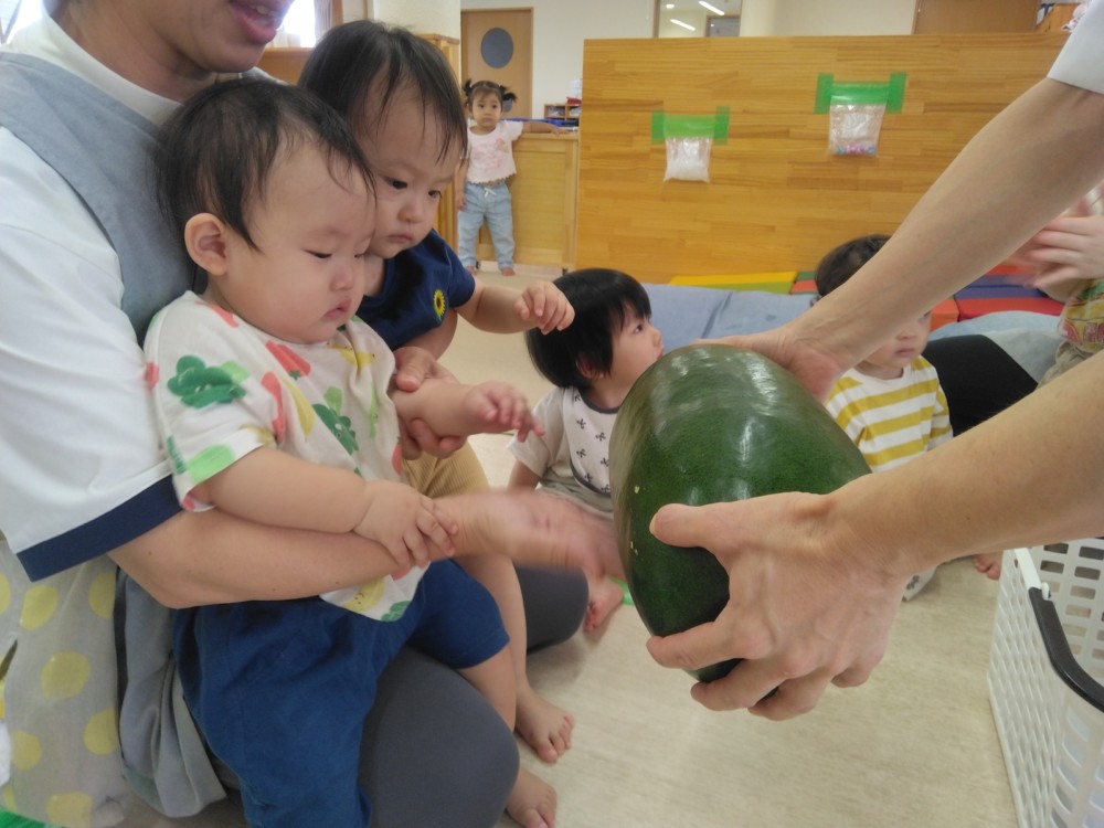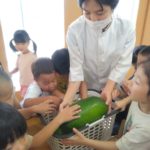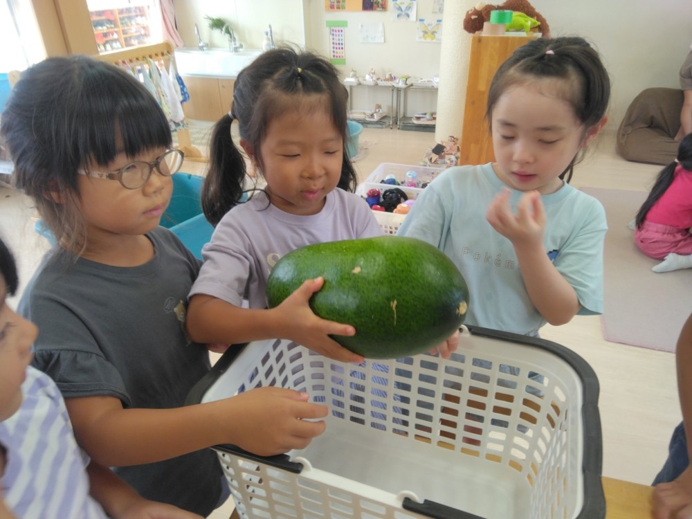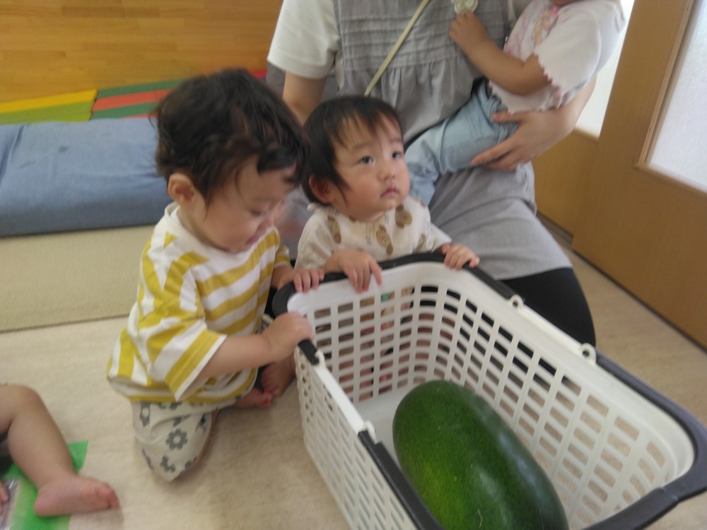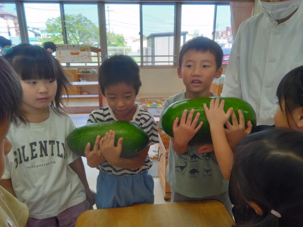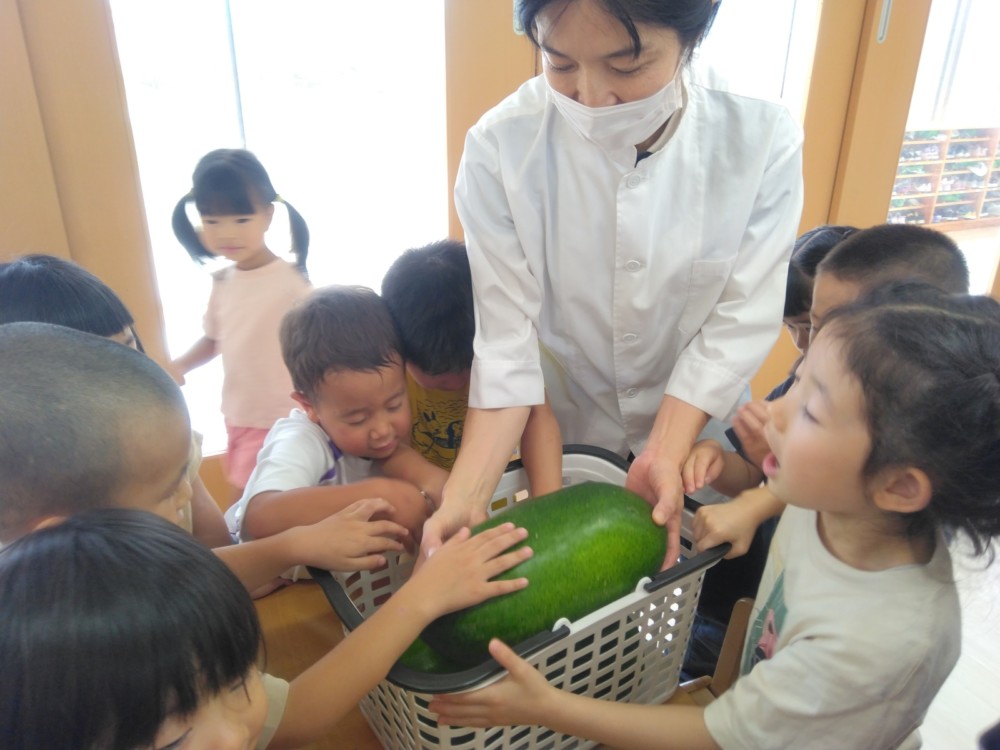 夏の野菜 part3 2025年09月08日 8月に入ってからも夏野菜の収穫は続きました。プランターだけでなく、めろん組さんの個人の鉢からオクラも収穫! ガマの穂 こちらの冬瓜は給食の食材で、納品されたものです。ちなみに「冬の瓜」と書きますが、旬は7~9月です。冷暗所に置けば冬まで日持ちすることから「冬瓜」と呼ばれるようになったそうです。大きいねぇ。