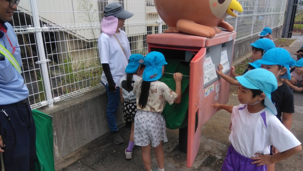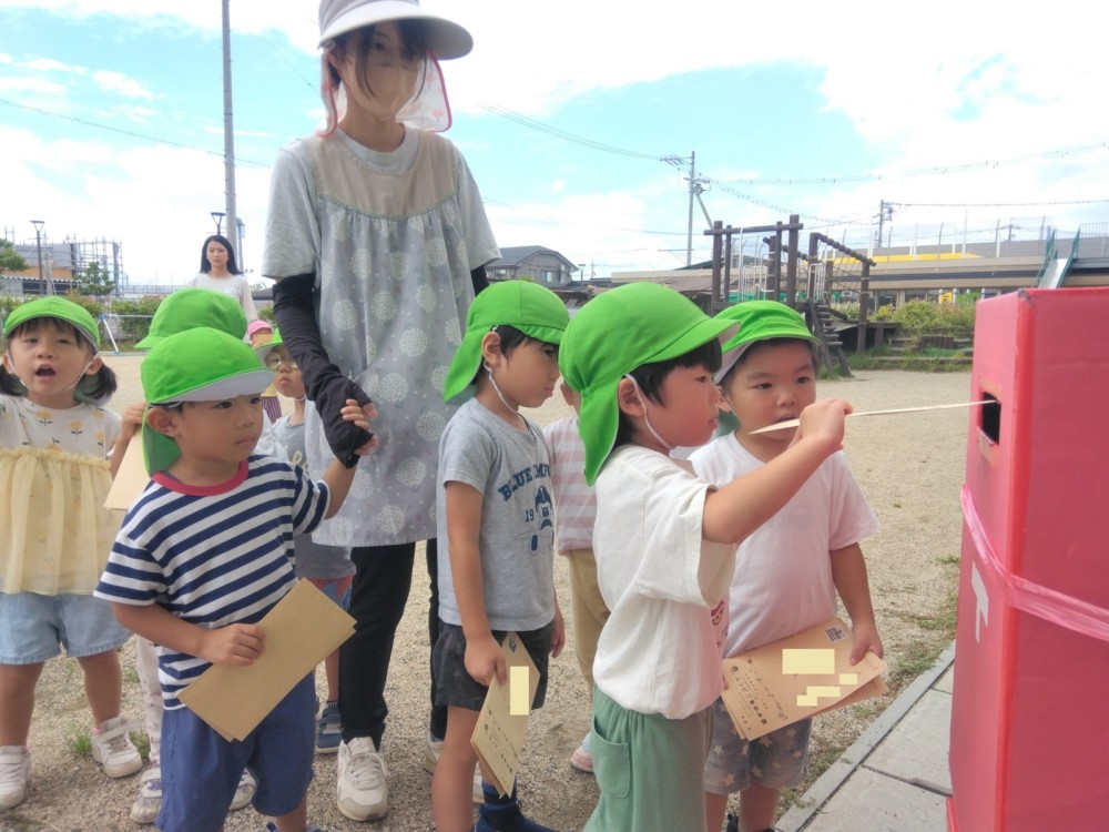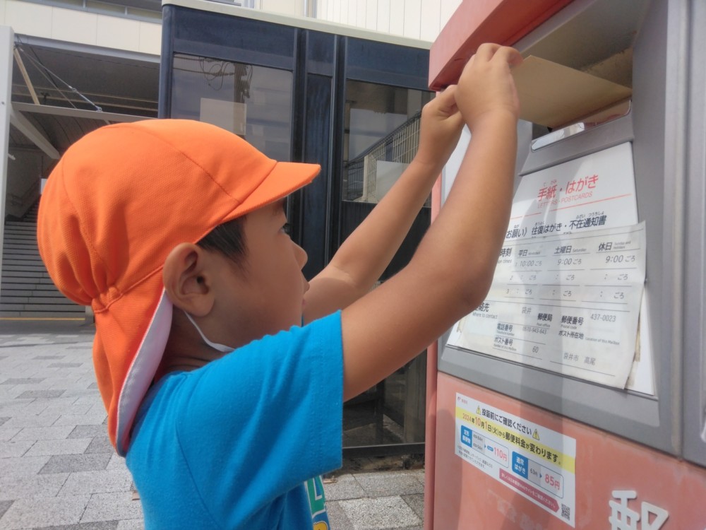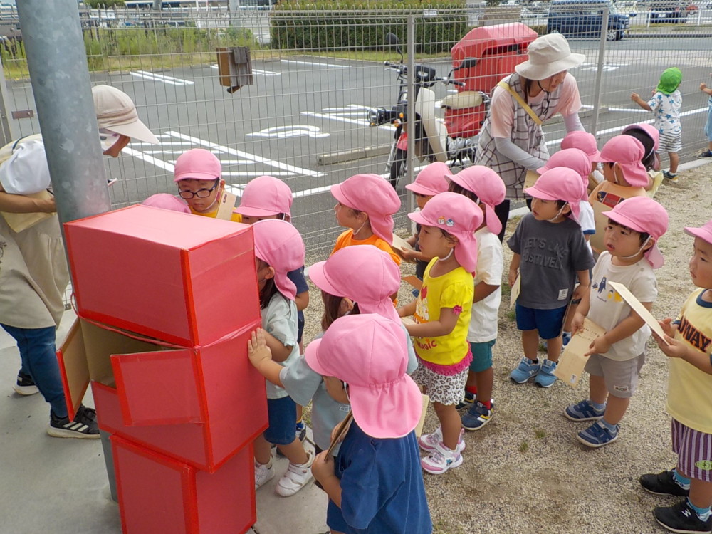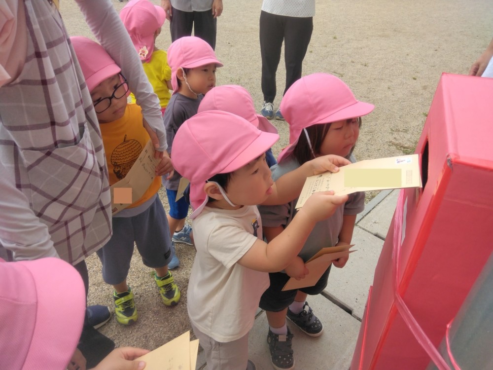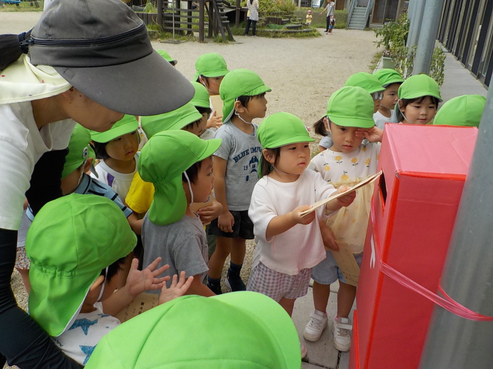 ばなな組さん、ぶどう組さんは、園庭に出てごっこ遊び用のポストに投函。すぐ回収してくれました。