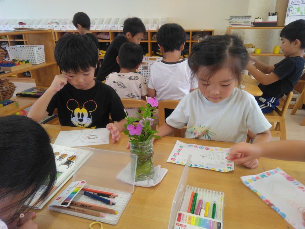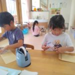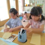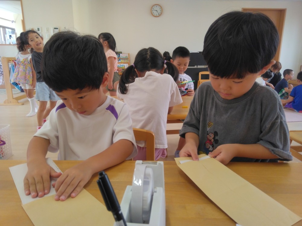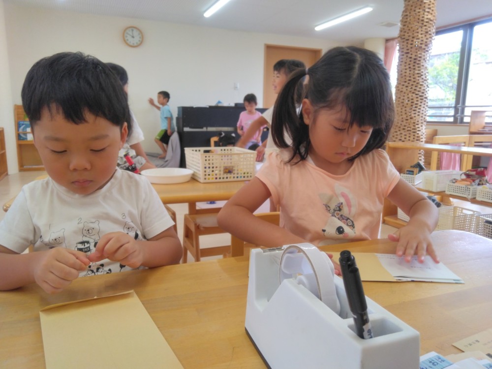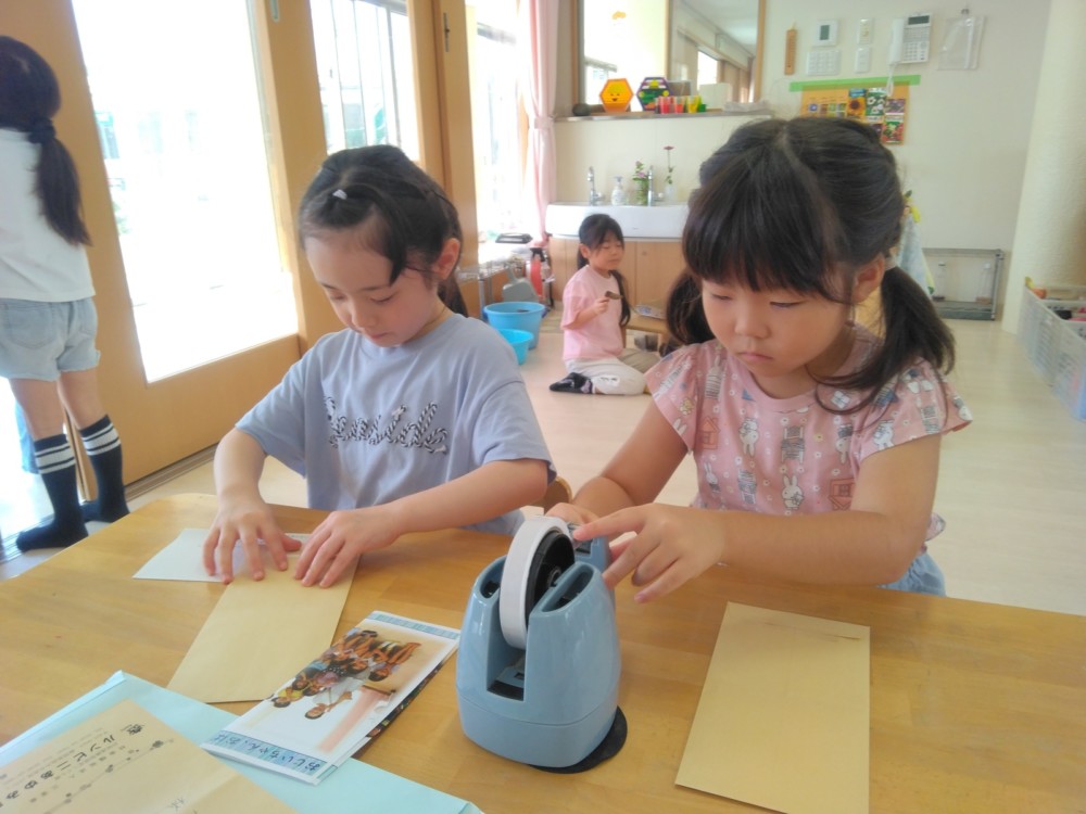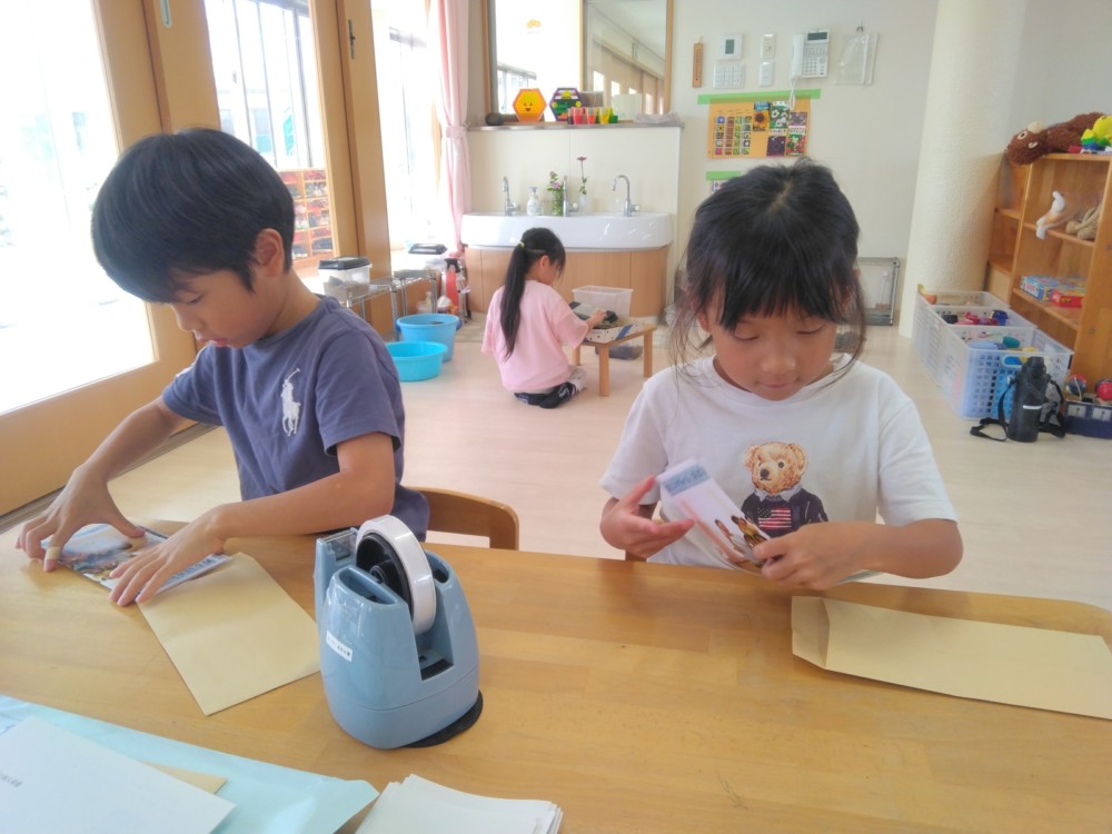 みかん、めろん組は、前日までに手紙の用意を自分たちでおこないます。封筒に手紙、写真を入れ、封をし、切手を貼ります。
