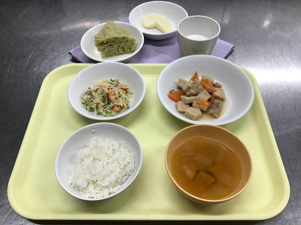 10月15日の給食 2025年10月15日 10月15日(水) 七分づきごはん みそ汁(かぼちゃ) 高野豆腐煮 はるさめサラダ(マヨネーズ) おやつ 牛乳 蒸しパン(お茶) りんご 写真は3歳児の分量です。