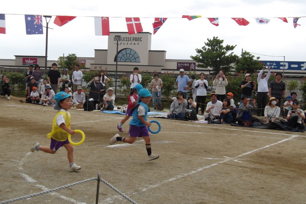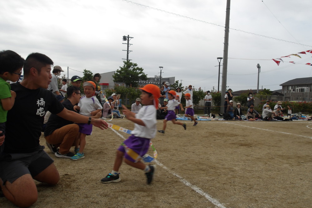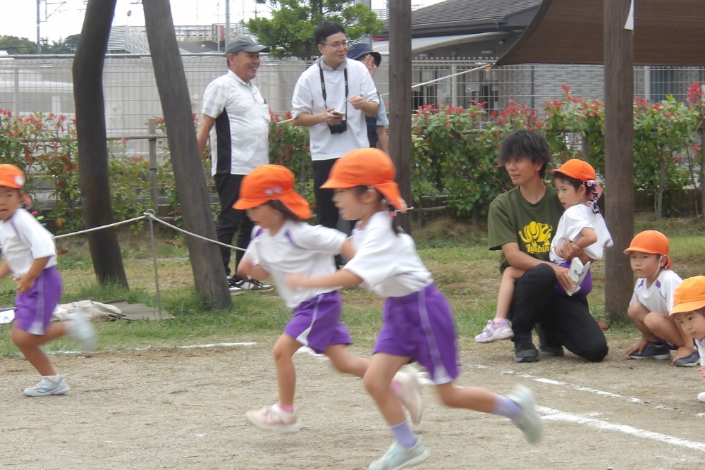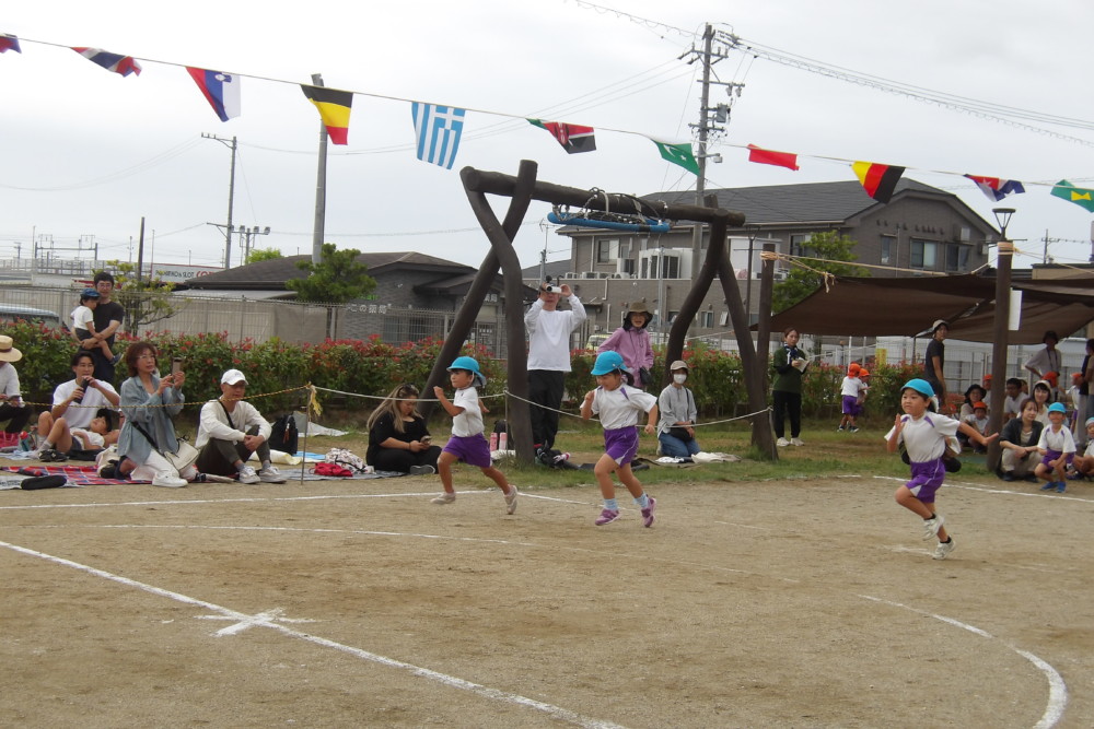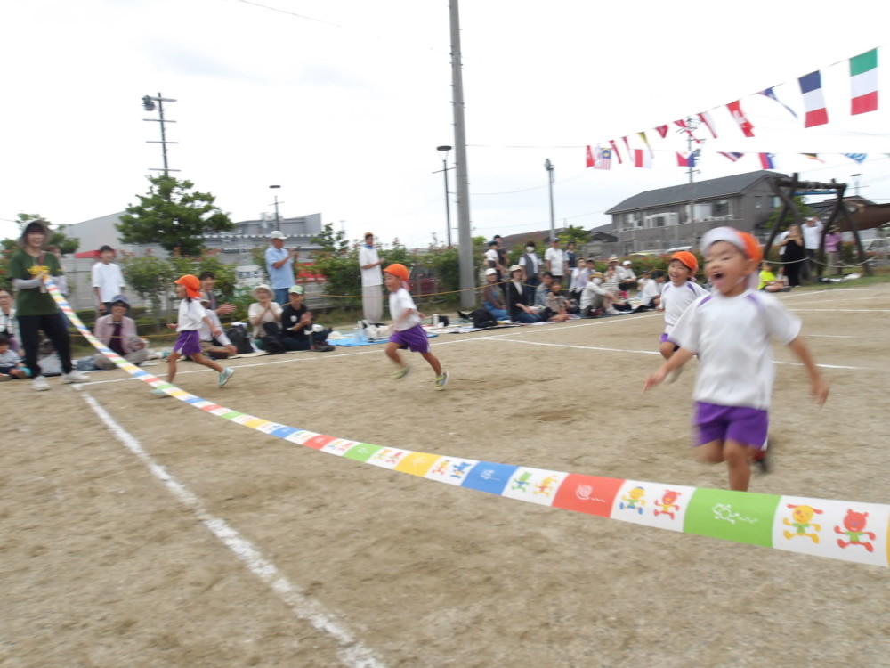 「あゆみリトルランナー」徒競走です。コースの描かれていない園庭を真っ直ぐ走るのは難しいので、ゴール地点にいるお父さん、お母さんを目指して走ります。