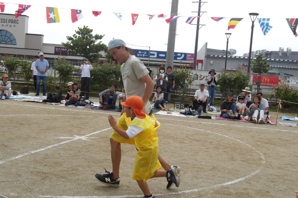 「でかパンツリレー」みかん組の親子競技です。親子で足並みをそろえて走ります。デカパンがズリ落ちないようにね!