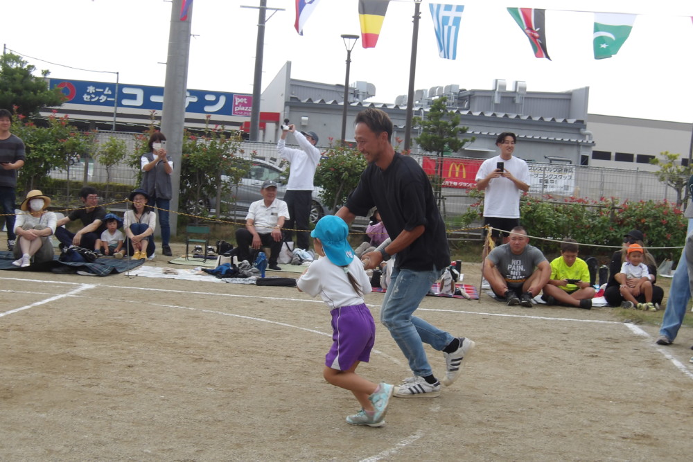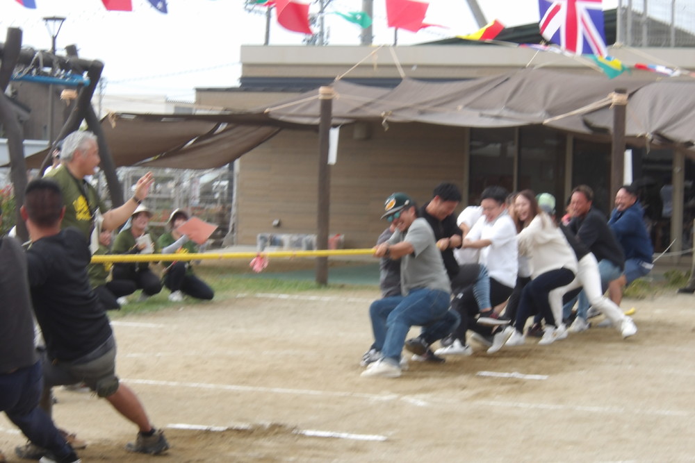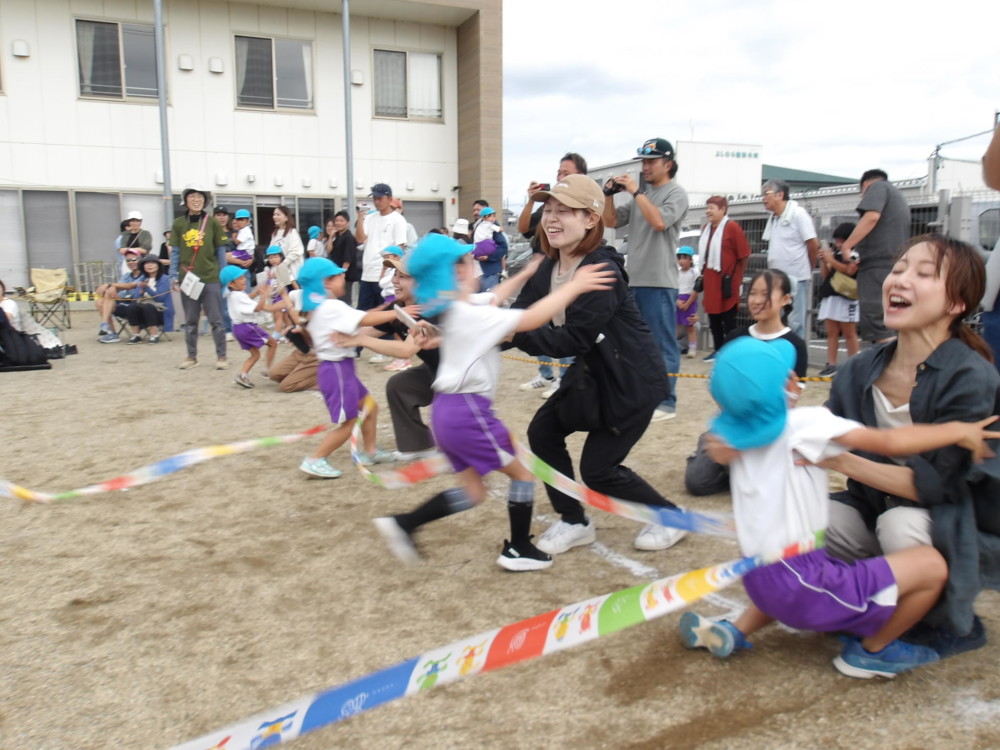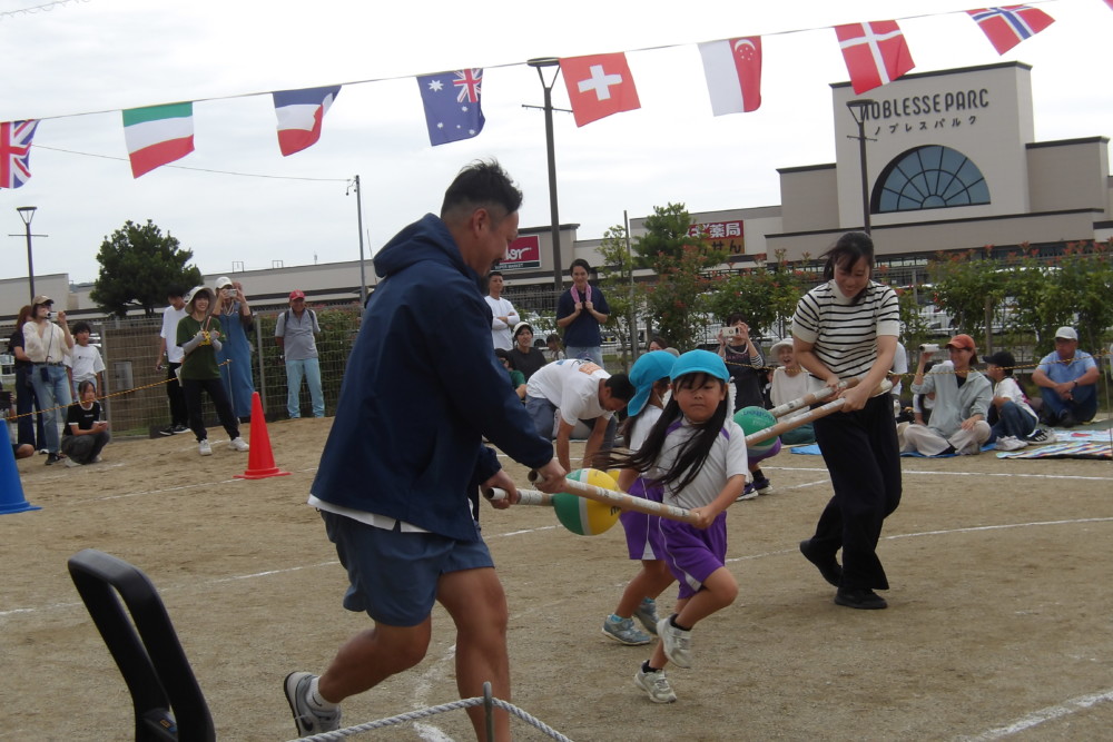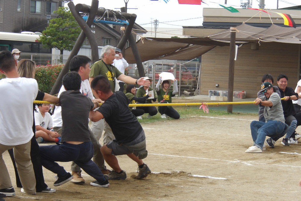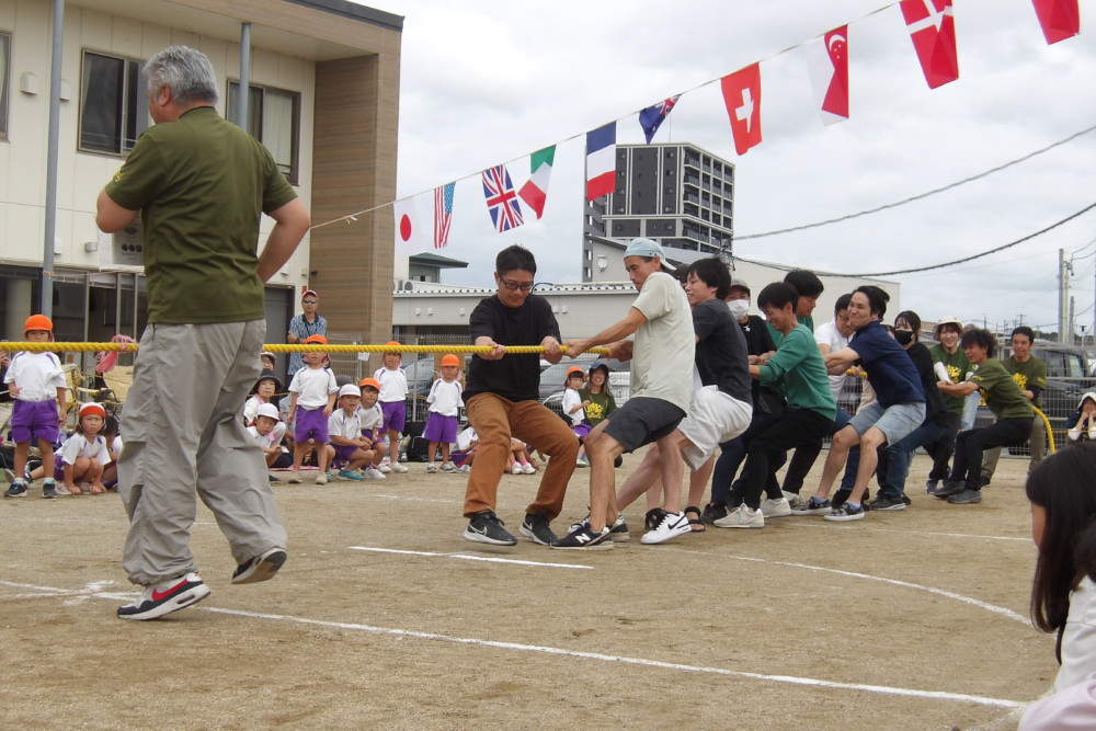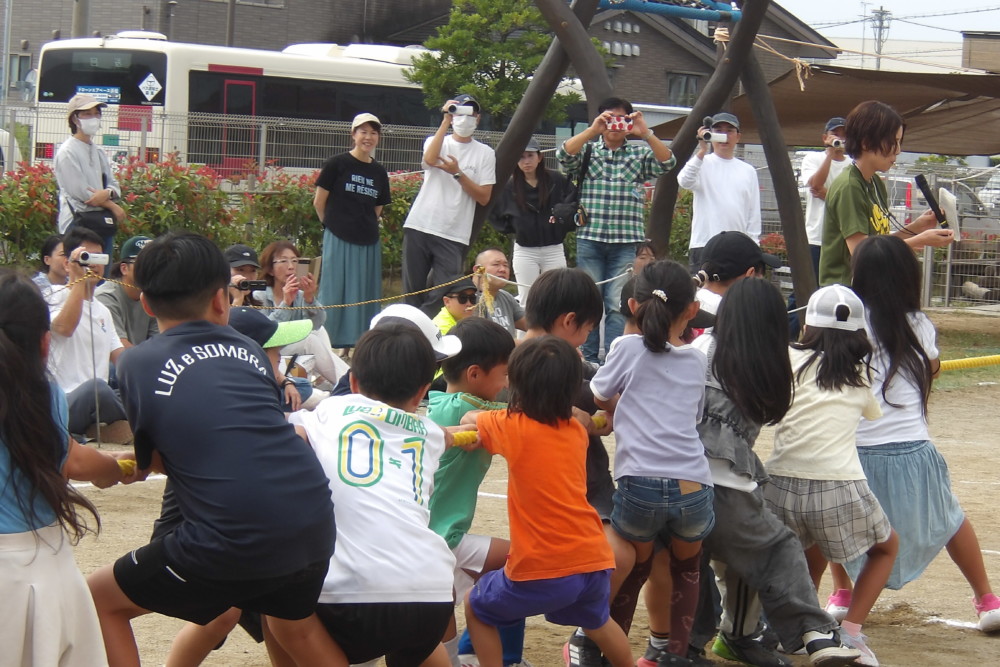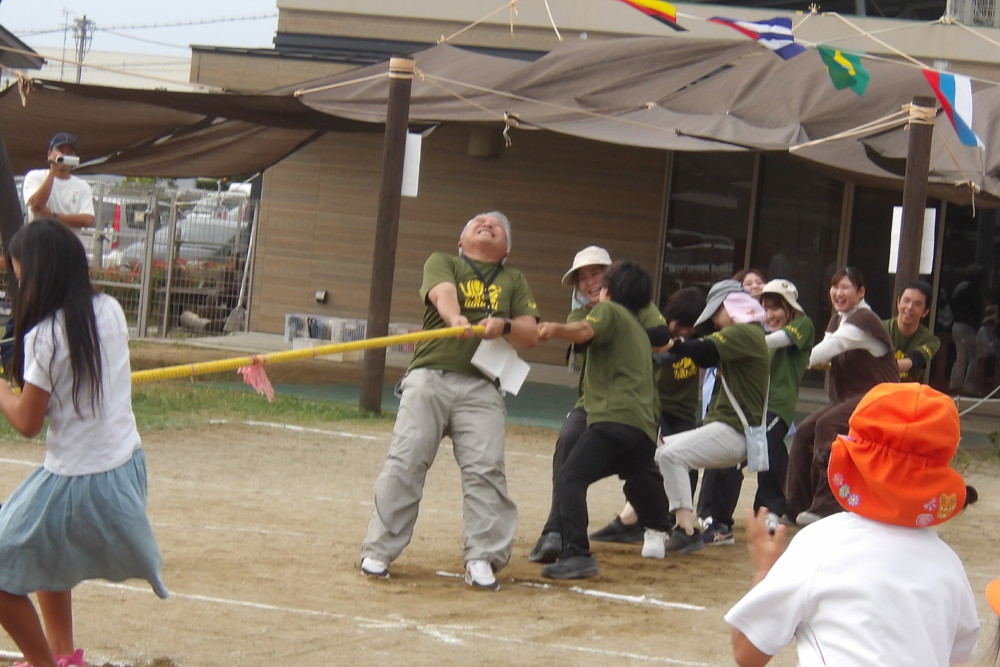 「みんなで つな げよう」保護者競技の綱引きです。小学生vs職員のエキシビジョンマッチもおこなわれました。大人が真剣に頑張る姿は、子どもたちの心に熱く刺さります!