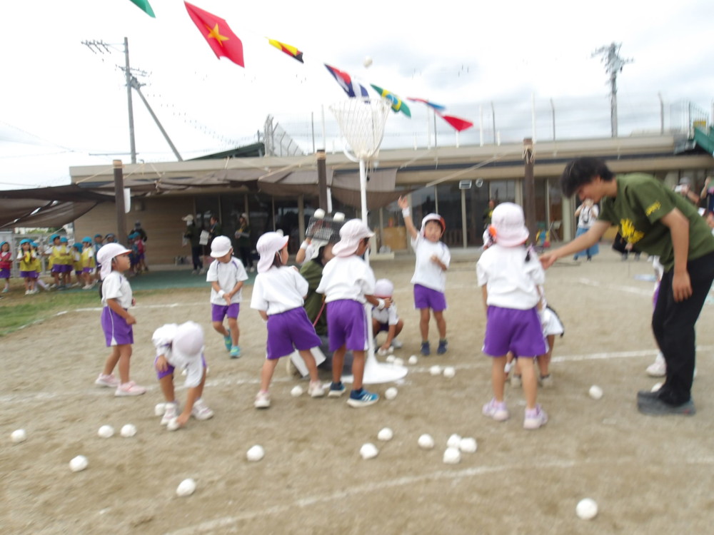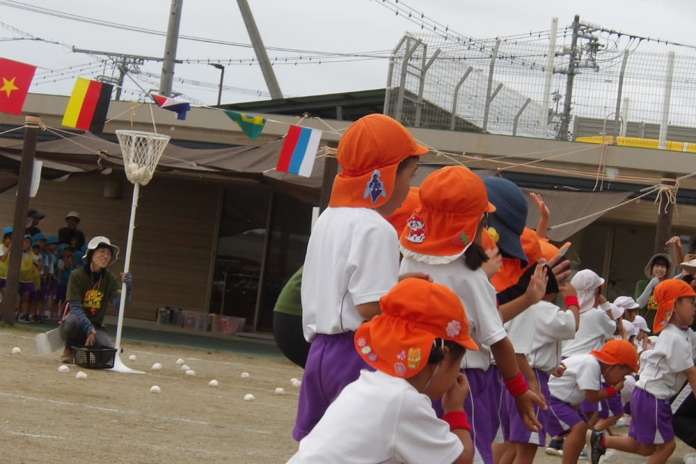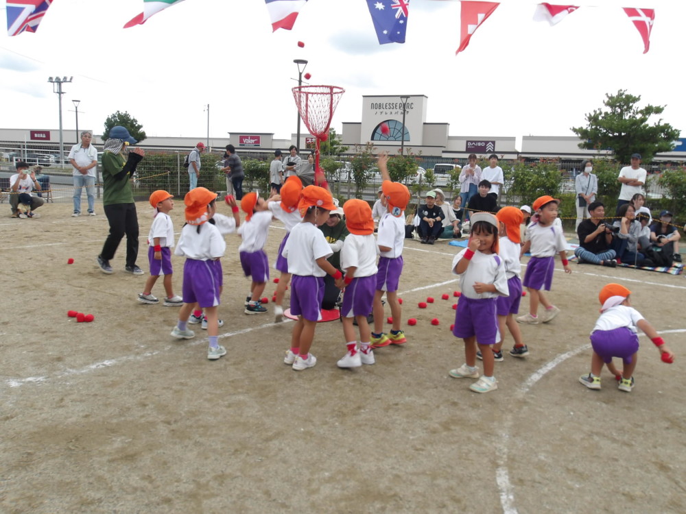 「まじめ忍者」みかん組の玉入れです。曲に合わせてダンス&玉入れです。