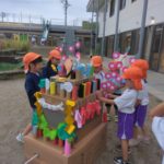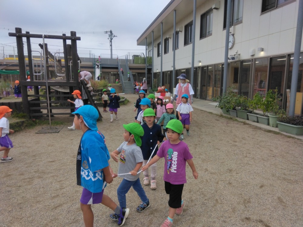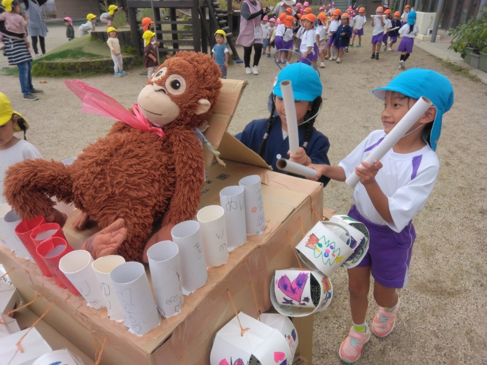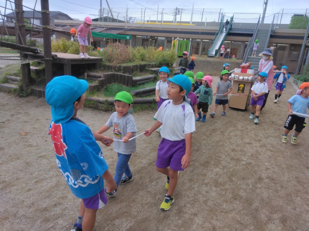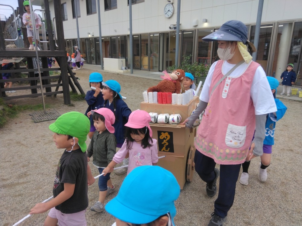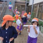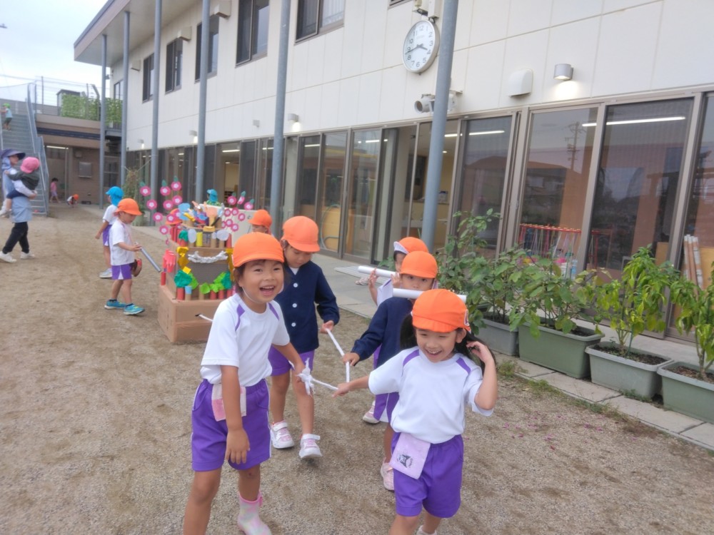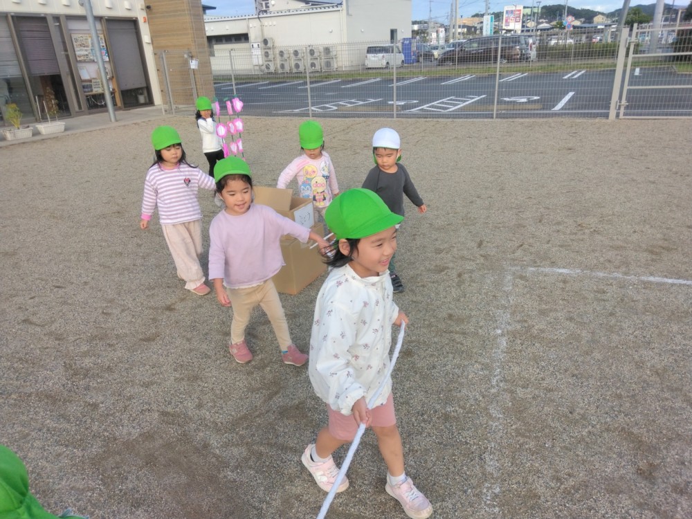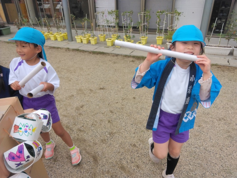 お祭りごっこ 2025年10月27日 お祭りを経験した子どもたちのお祭りごっこを紹介します。みかん、めろん組さんでは屋台作りが始まりました。 さあ、屋台が登場すると小さいクラスの子も寄ってきます。お囃子も聞こえてきましたよ。 室内でも 「おいそりゃ!」ピーピッピ♪