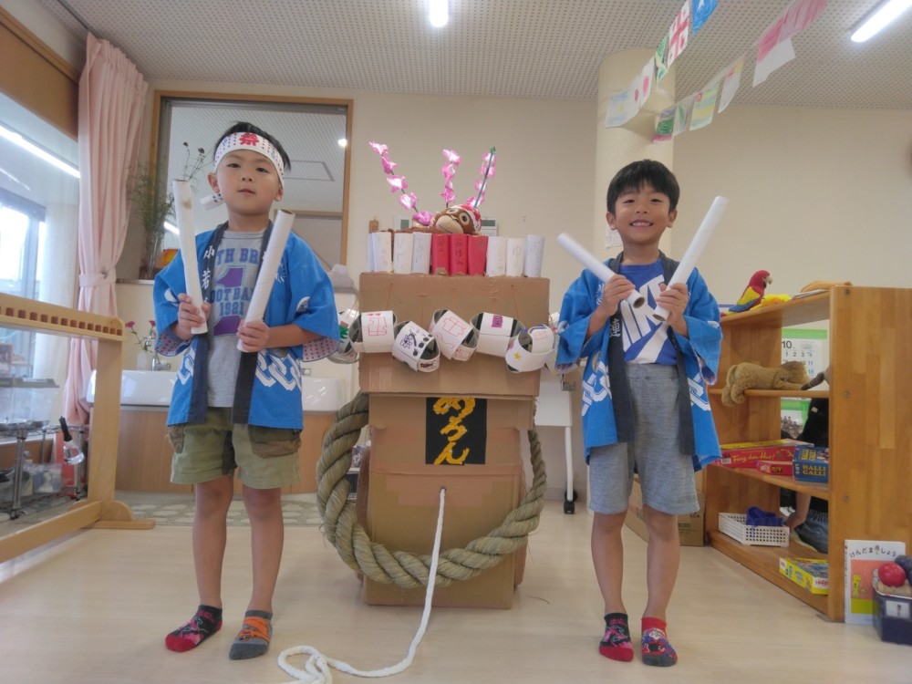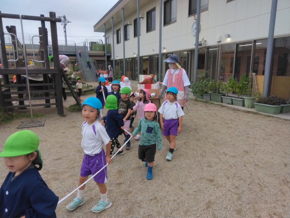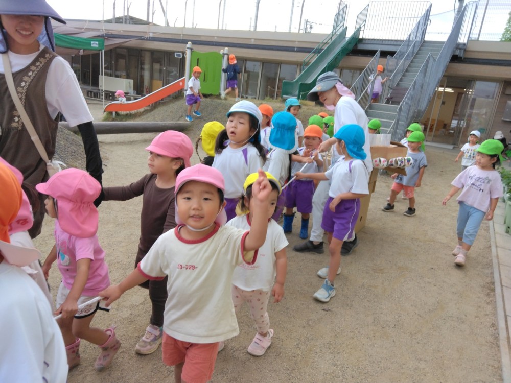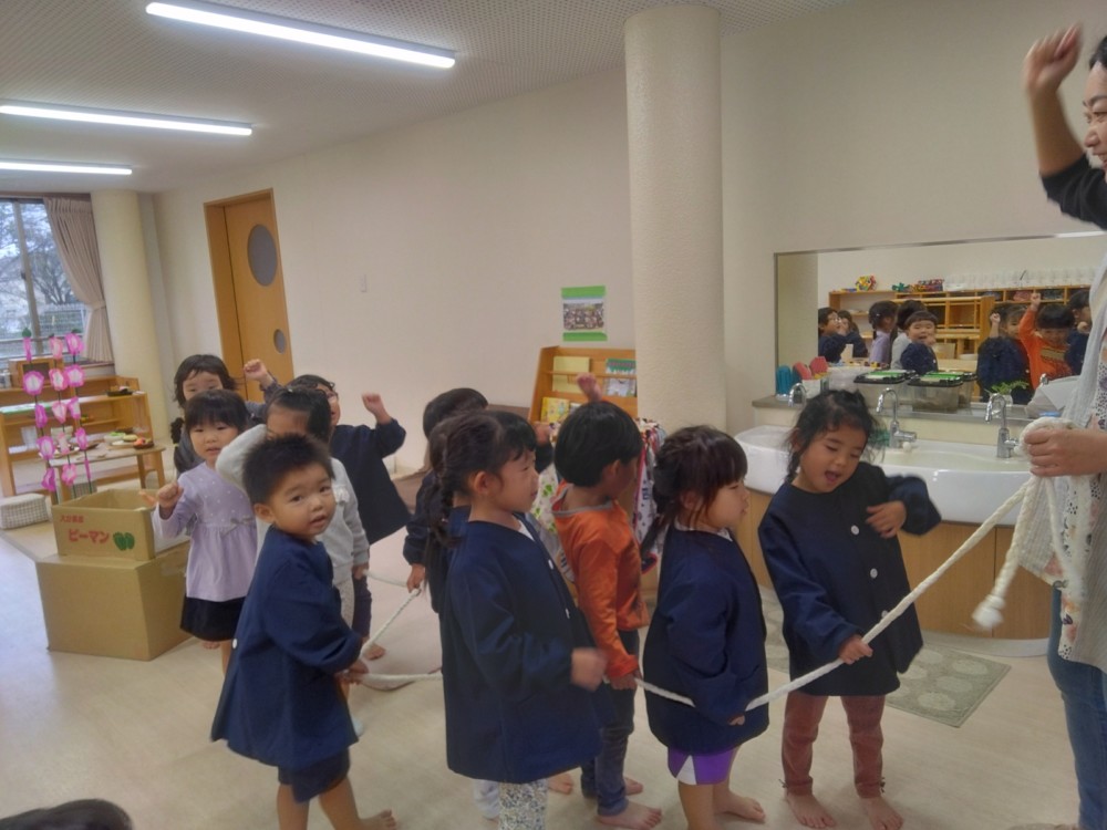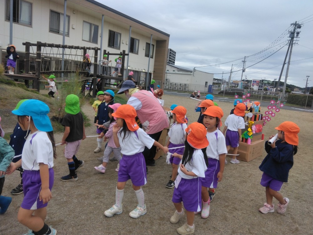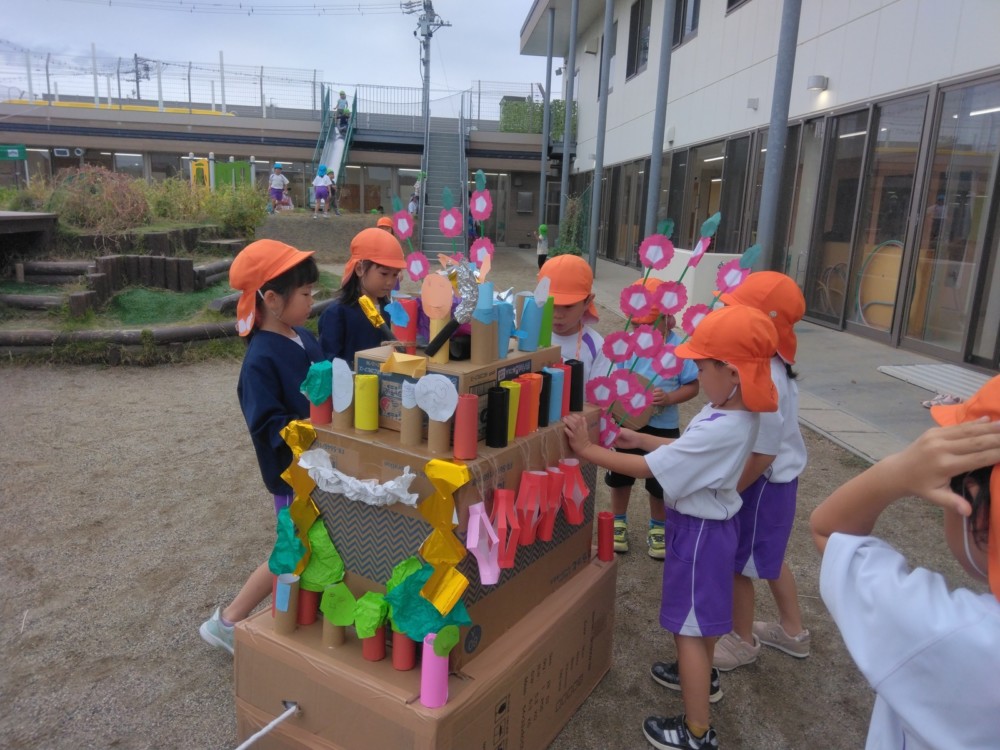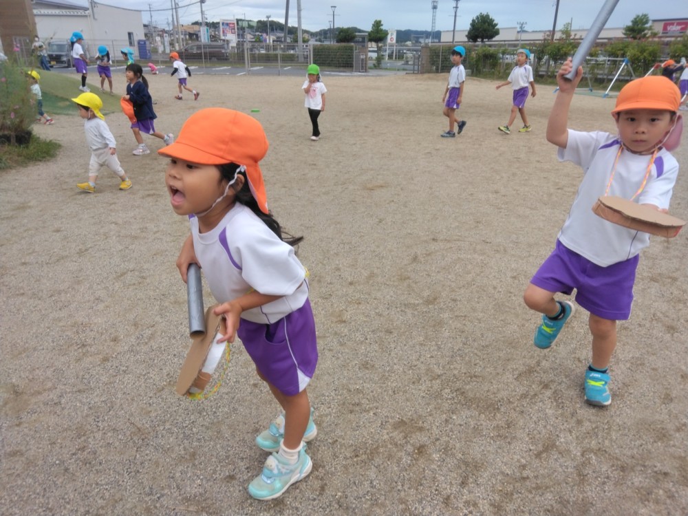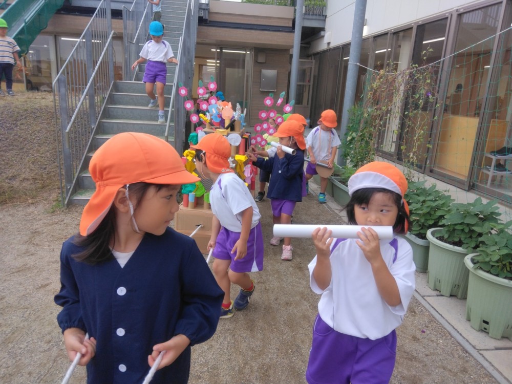 お祭りごっこ 2025年10月27日 お祭りを経験した子どもたちのお祭りごっこを紹介します。みかん、めろん組さんでは屋台作りが始まりました。 さあ、屋台が登場すると小さいクラスの子も寄ってきます。お囃子も聞こえてきましたよ。 室内でも 「おいそりゃ!」ピーピッピ♪