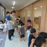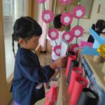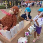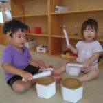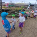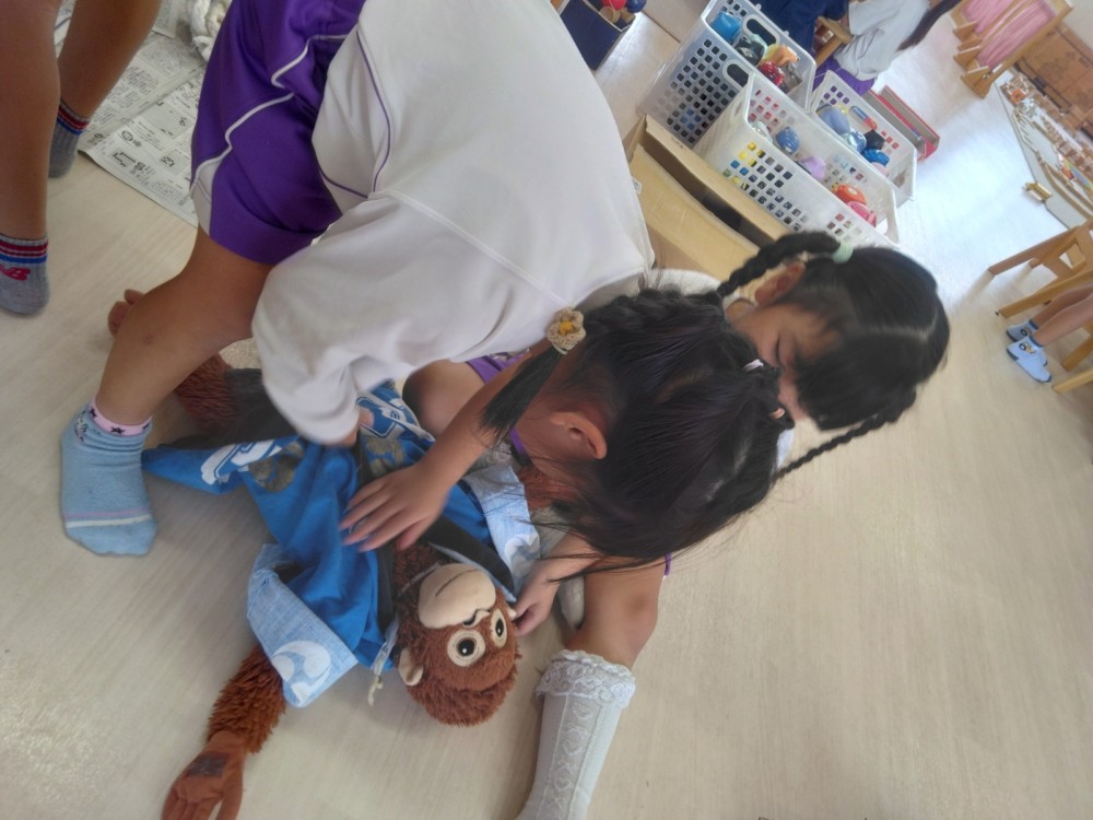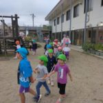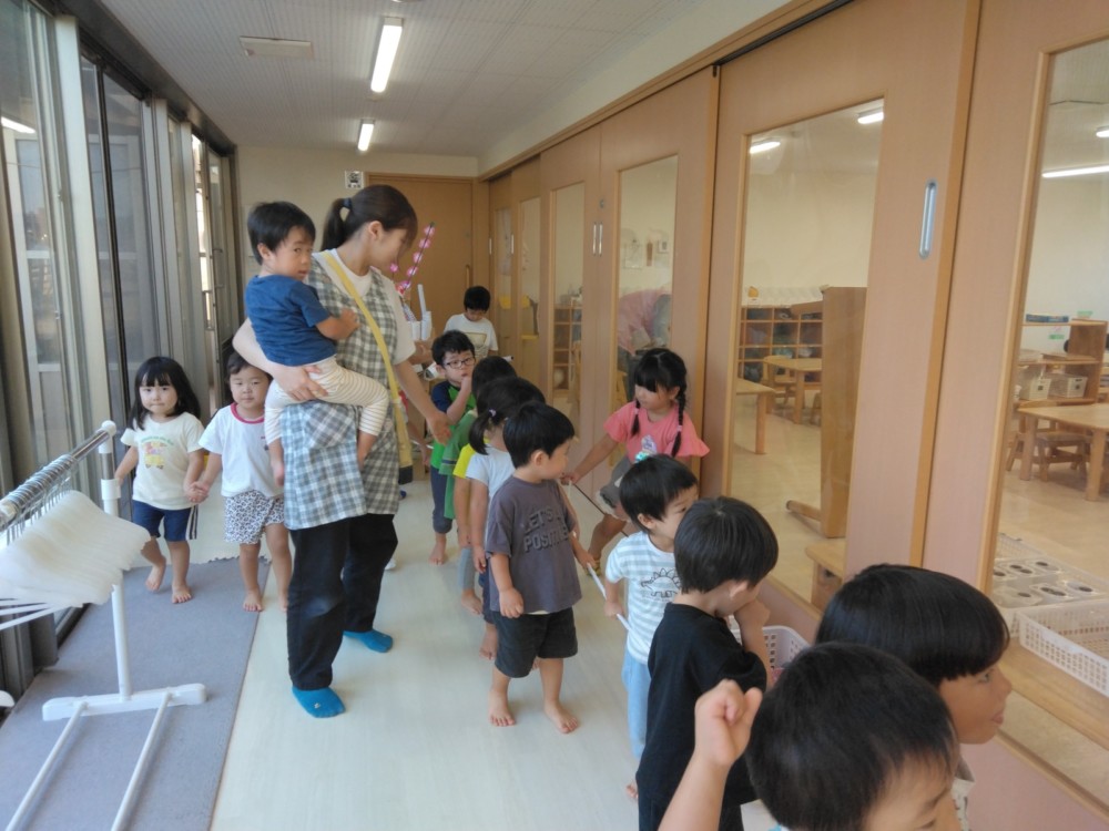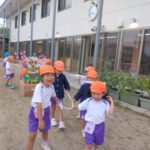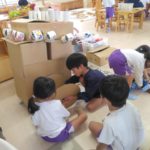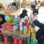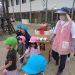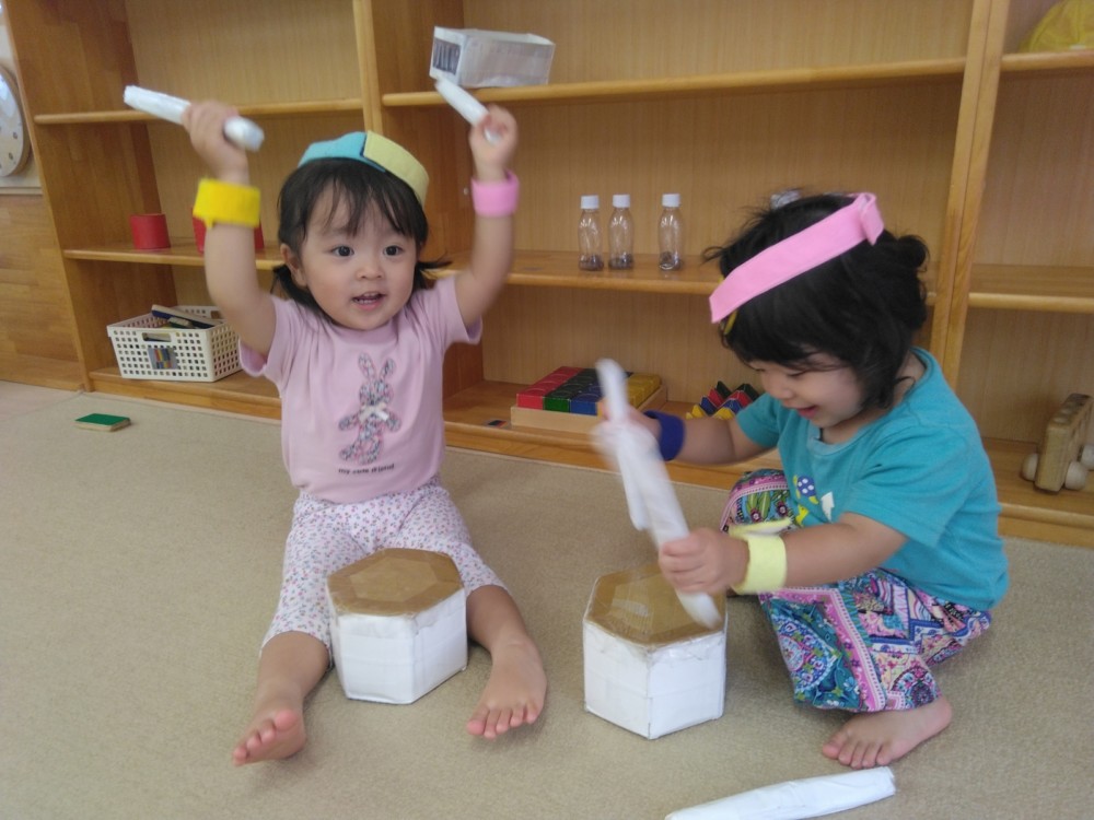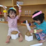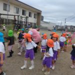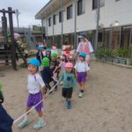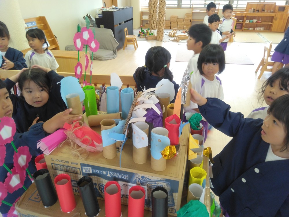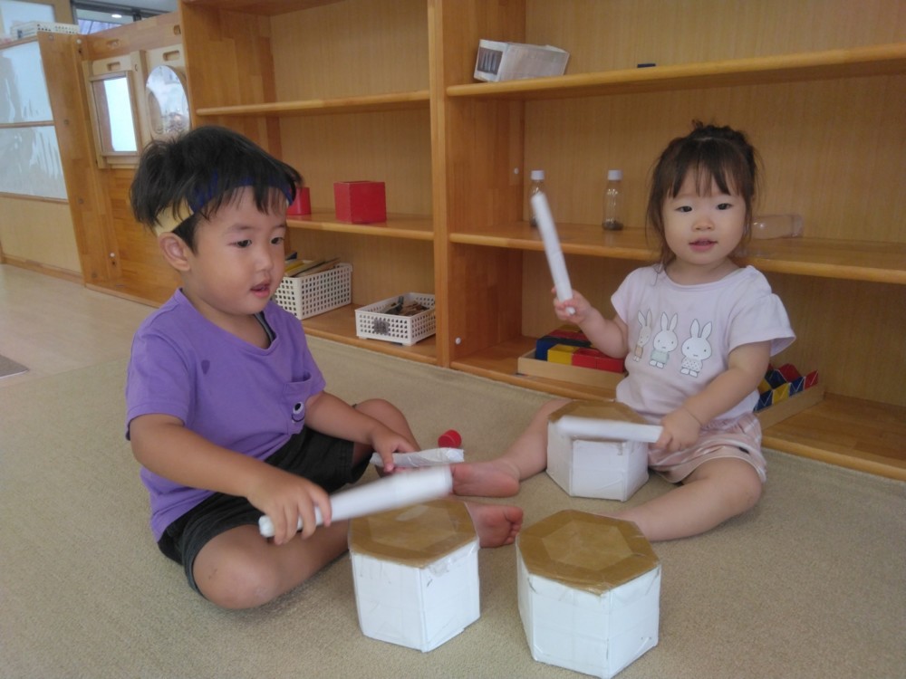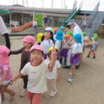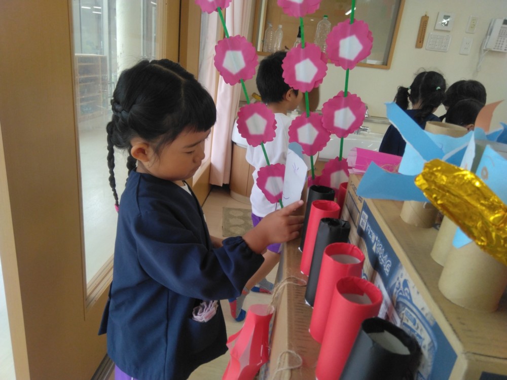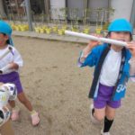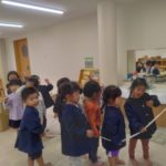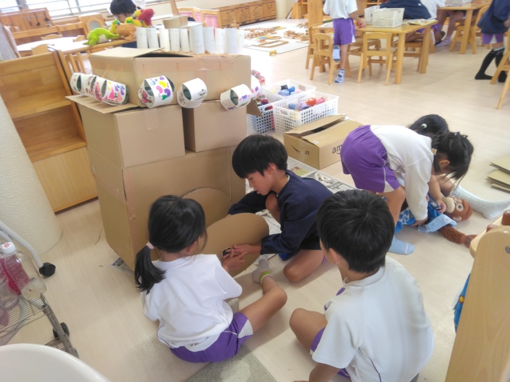 お祭りごっこ 2025年10月27日 お祭りを経験した子どもたちのお祭りごっこを紹介します。みかん、めろん組さんでは屋台作りが始まりました。 さあ、屋台が登場すると小さいクラスの子も寄ってきます。お囃子も聞こえてきましたよ。 室内でも 「おいそりゃ!」ピーピッピ♪