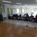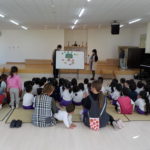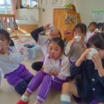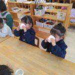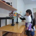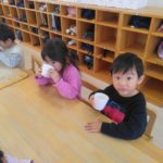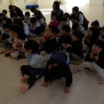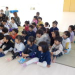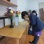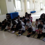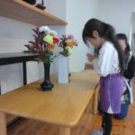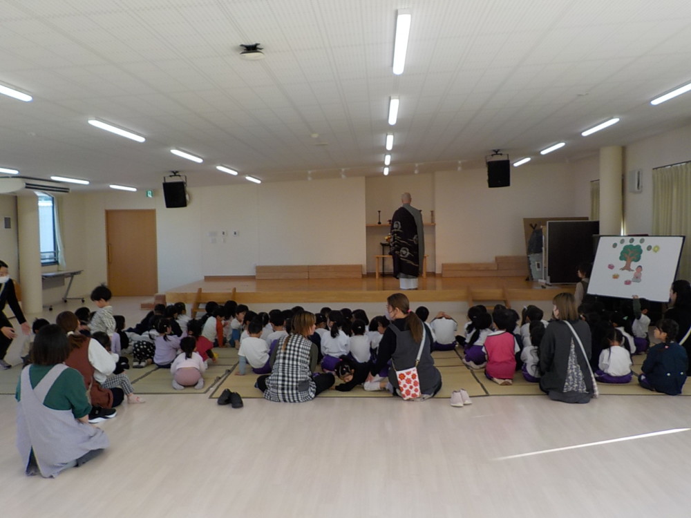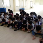 礼拝(らいはい)。おりんの音に合わせ、手を合わせて拝みます。ぶどう組さんは、初めての礼拝。めろん、みかん組さんは上手ですね。
