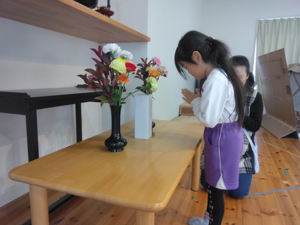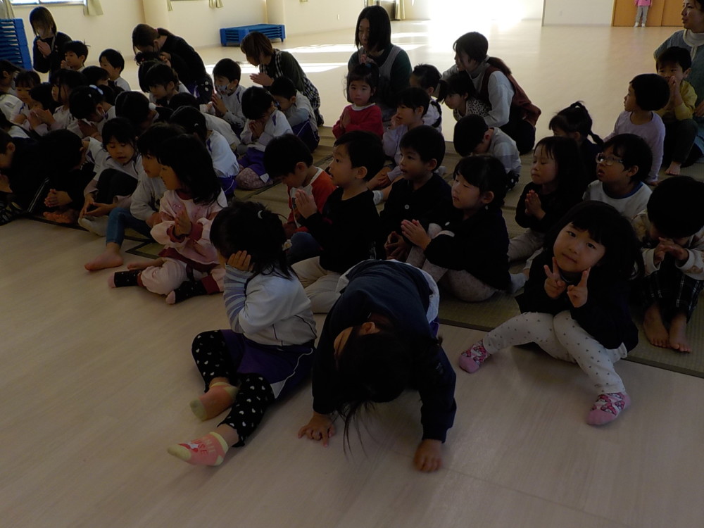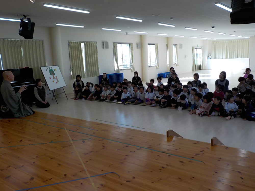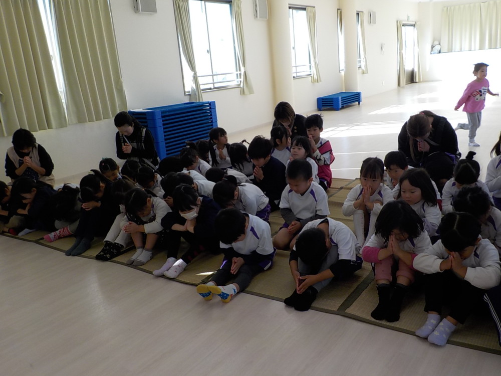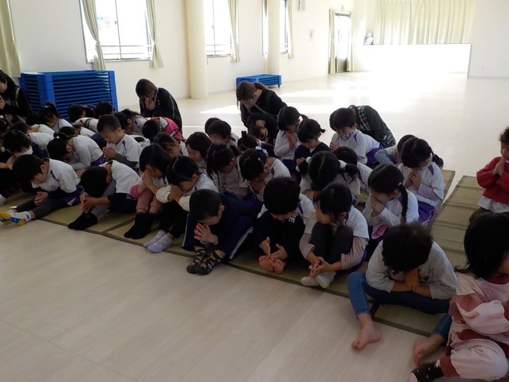 礼拝(らいはい)。おりんの音に合わせ、手を合わせて拝みます。ぶどう組さんは、初めての礼拝。めろん、みかん組さんは上手ですね。