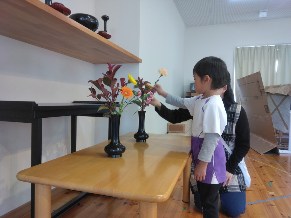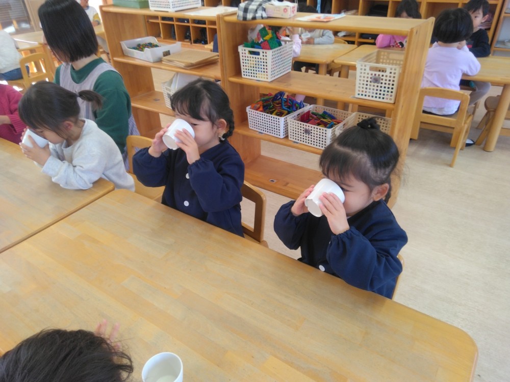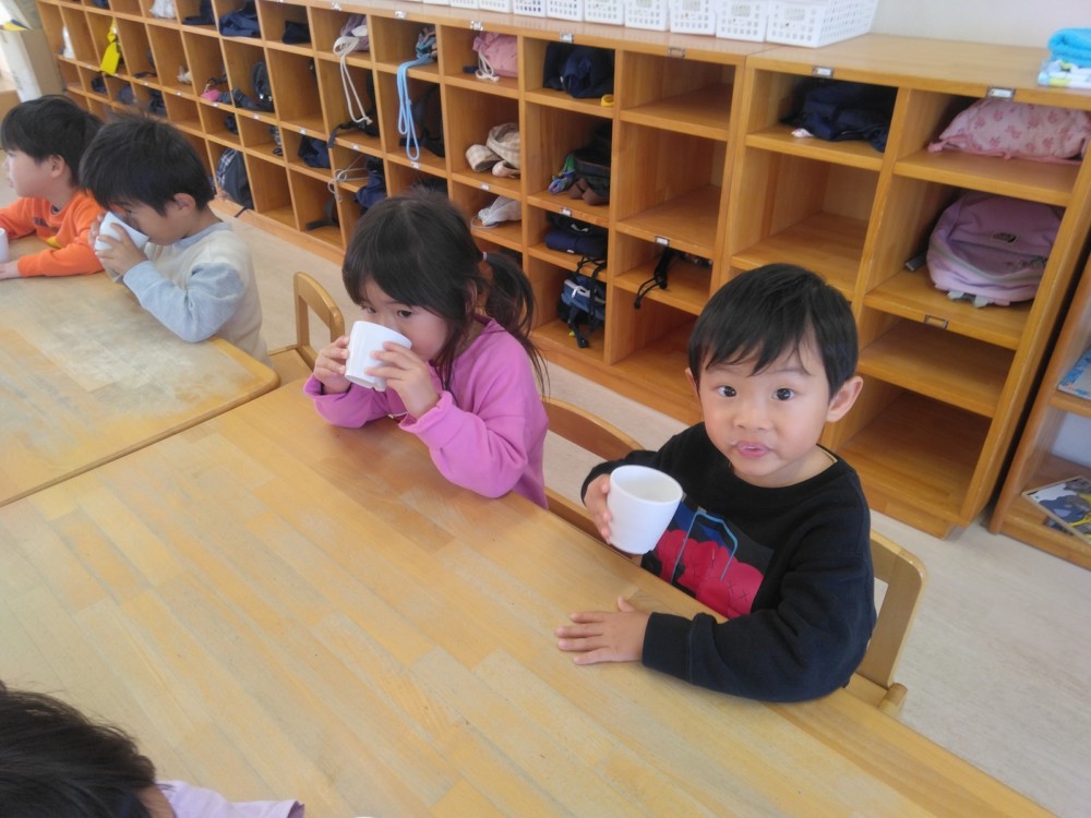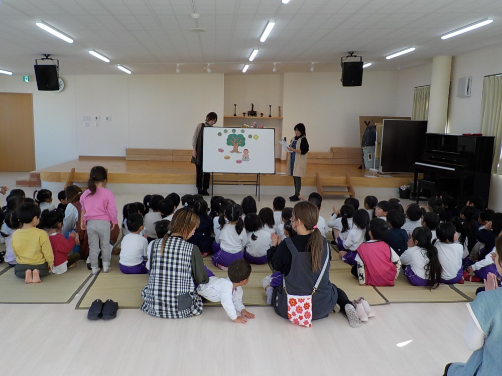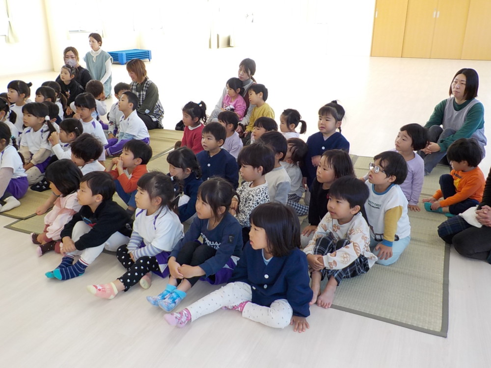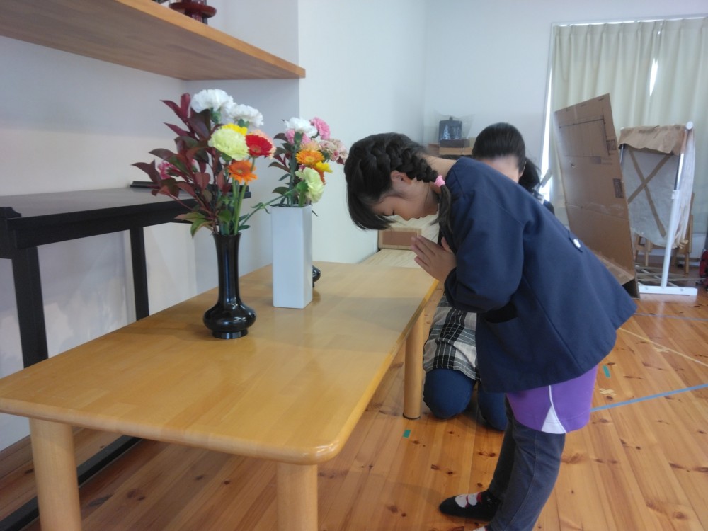 礼拝(らいはい)。おりんの音に合わせ、手を合わせて拝みます。ぶどう組さんは、初めての礼拝。めろん、みかん組さんは上手ですね。