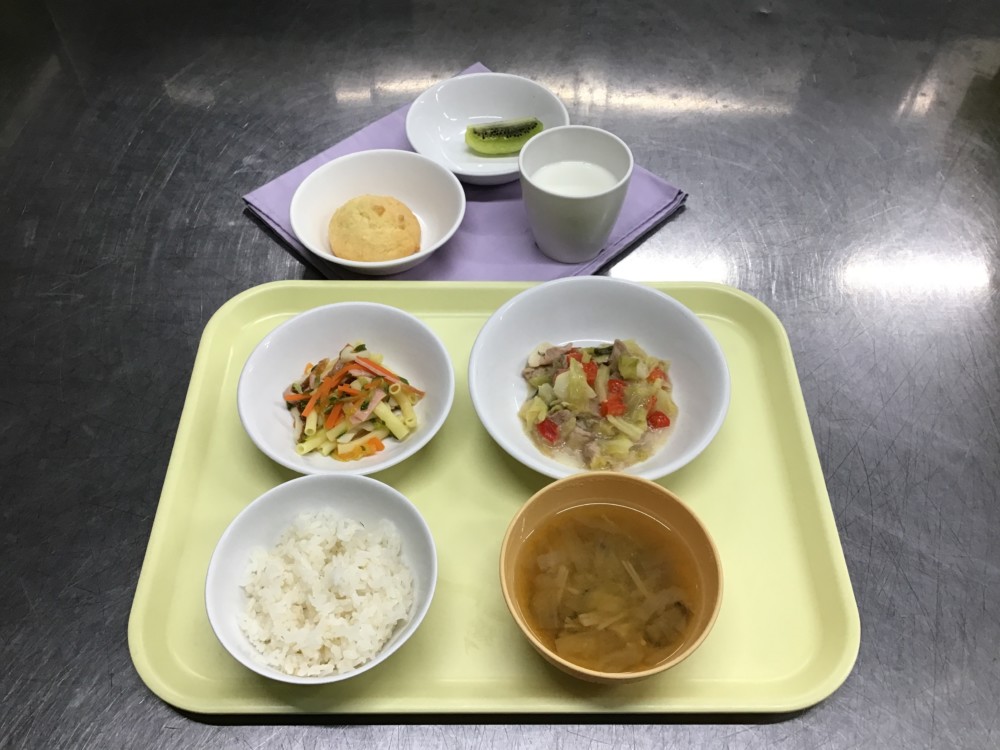 12月10日の給食 2025年12月10日 12月10日(水) 七分づきごはん みそ汁(しいたけ) 豚肉とキャベツのみそ風味 マカロニサラダ(カレードレッシング) おやつ 牛乳 甘食 キウイフルーツ 写真は3歳児の分量です。