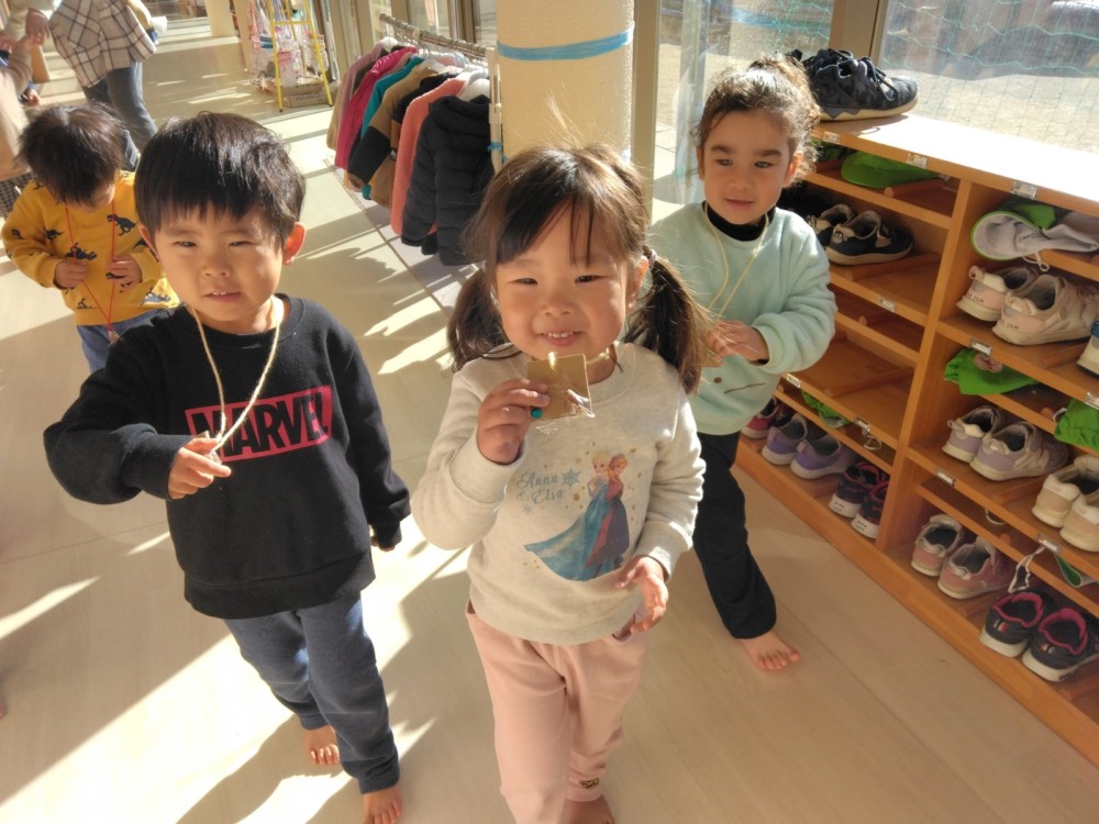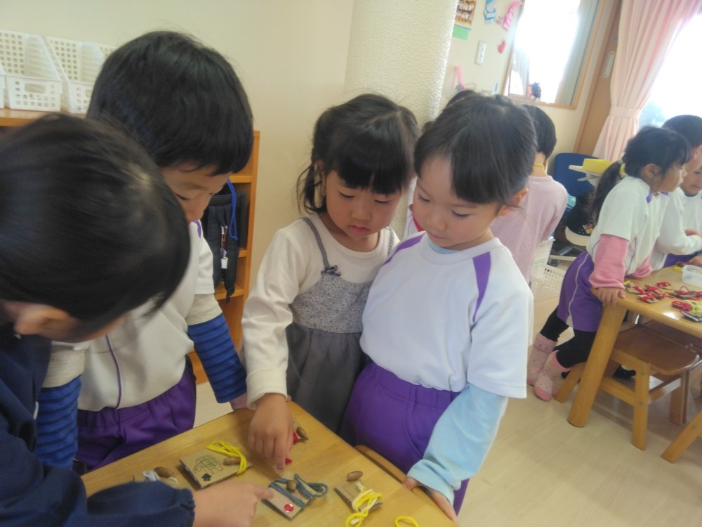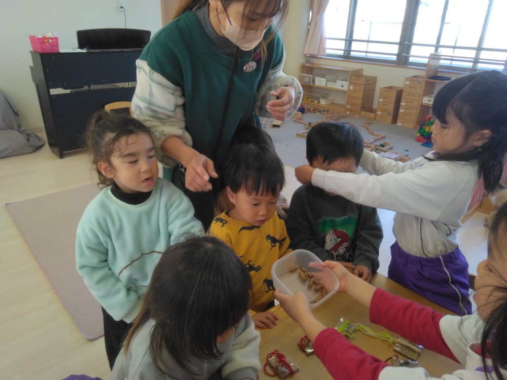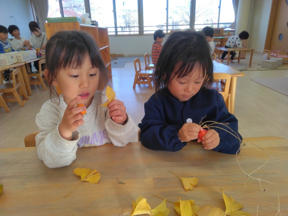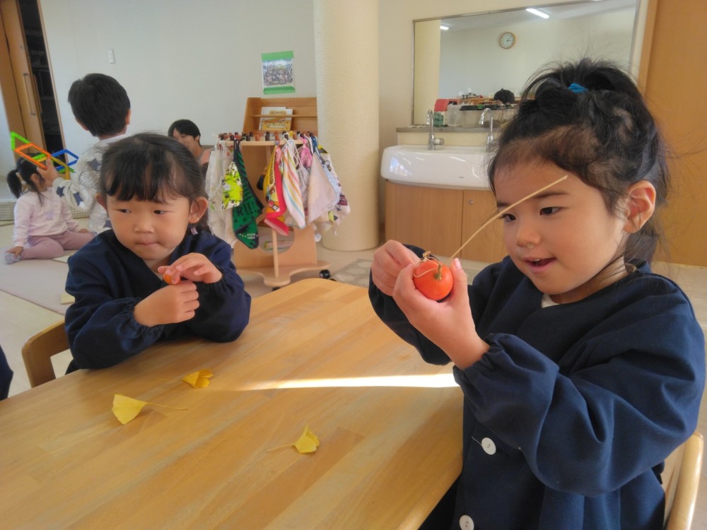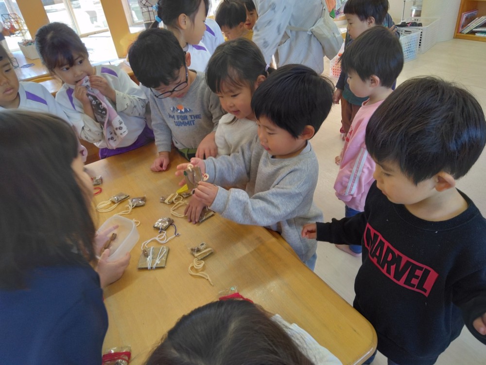 みかん組さんでは、自然物を使ってペンダントを作りました。ばなな組さん、ぶどう組さんが買いに来てくれましたよ。