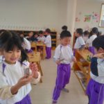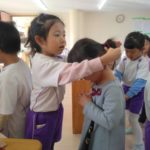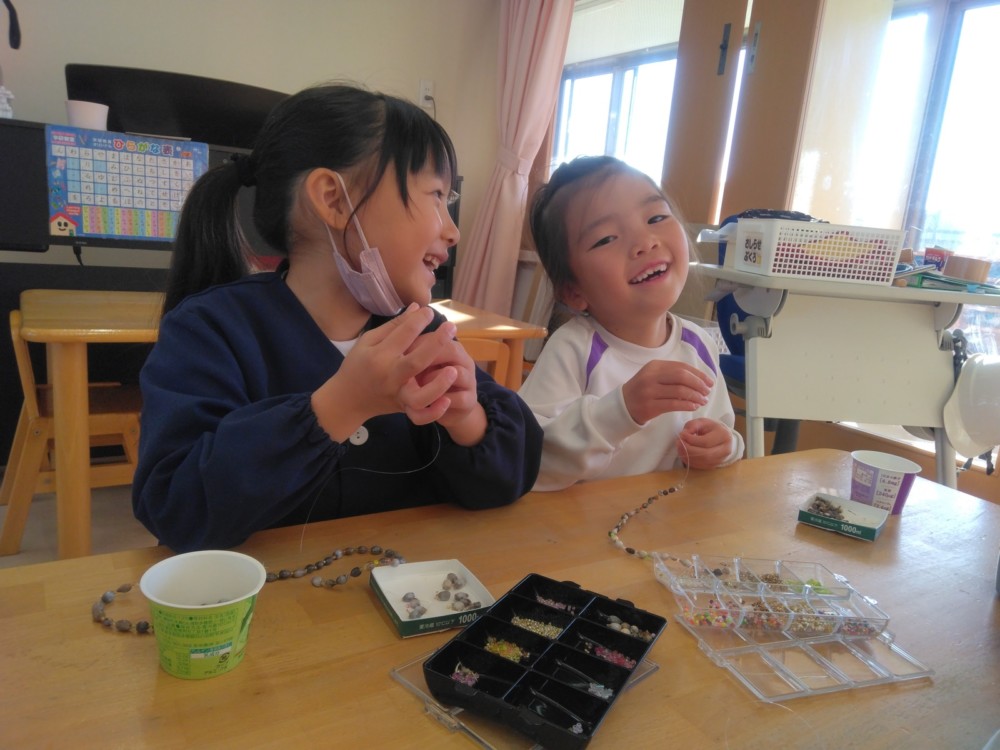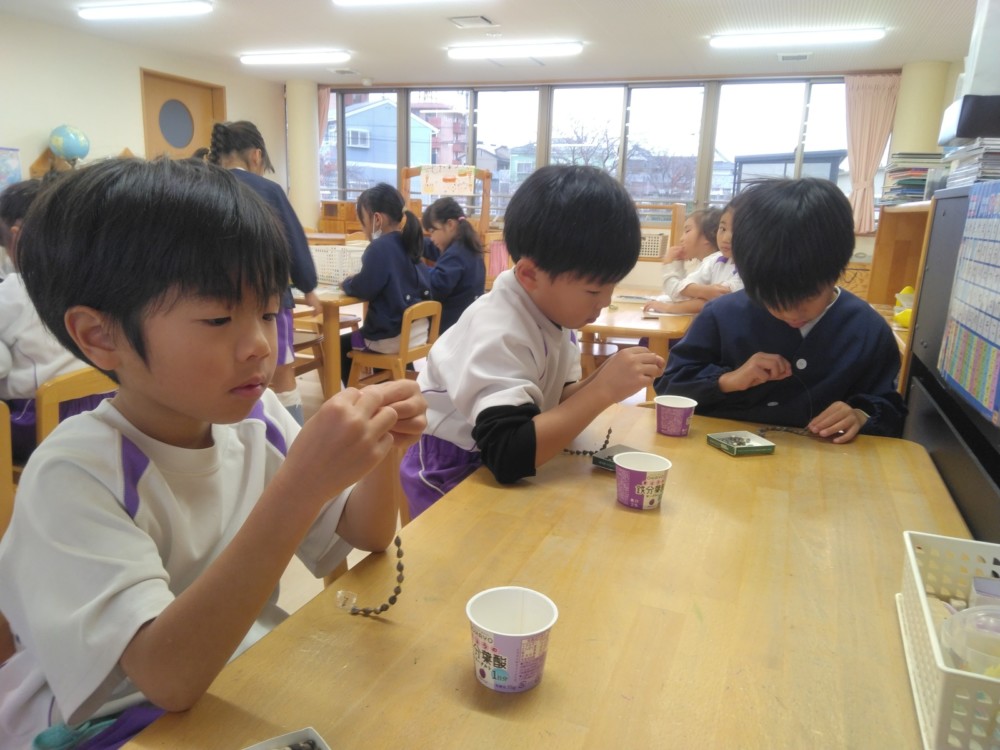 めろん組さんでは、数珠玉を使ってアクセサリー作り。