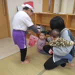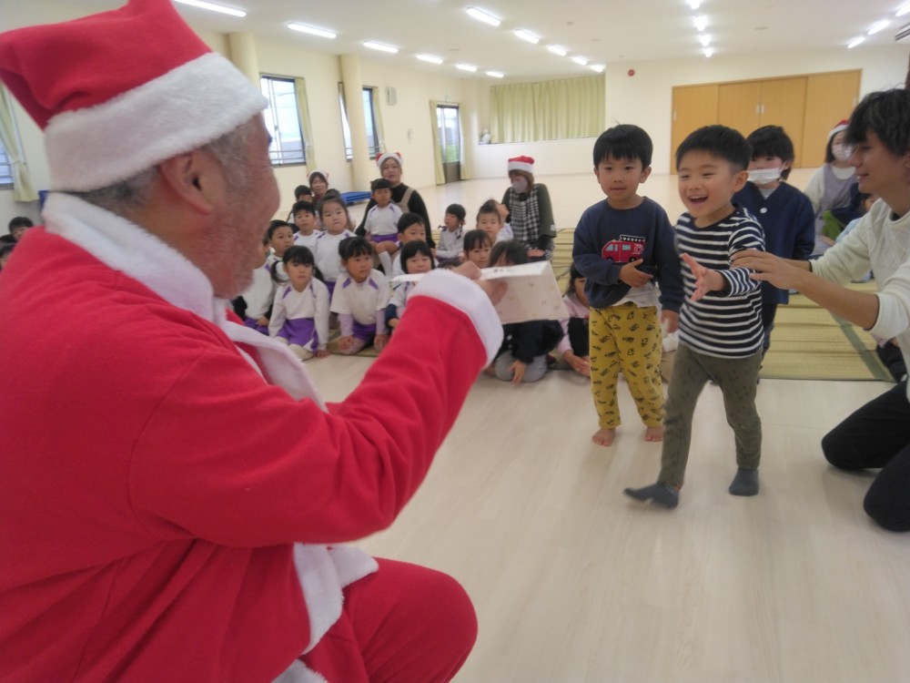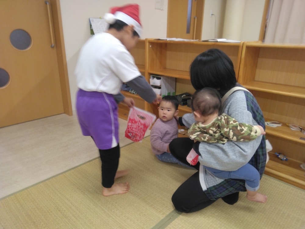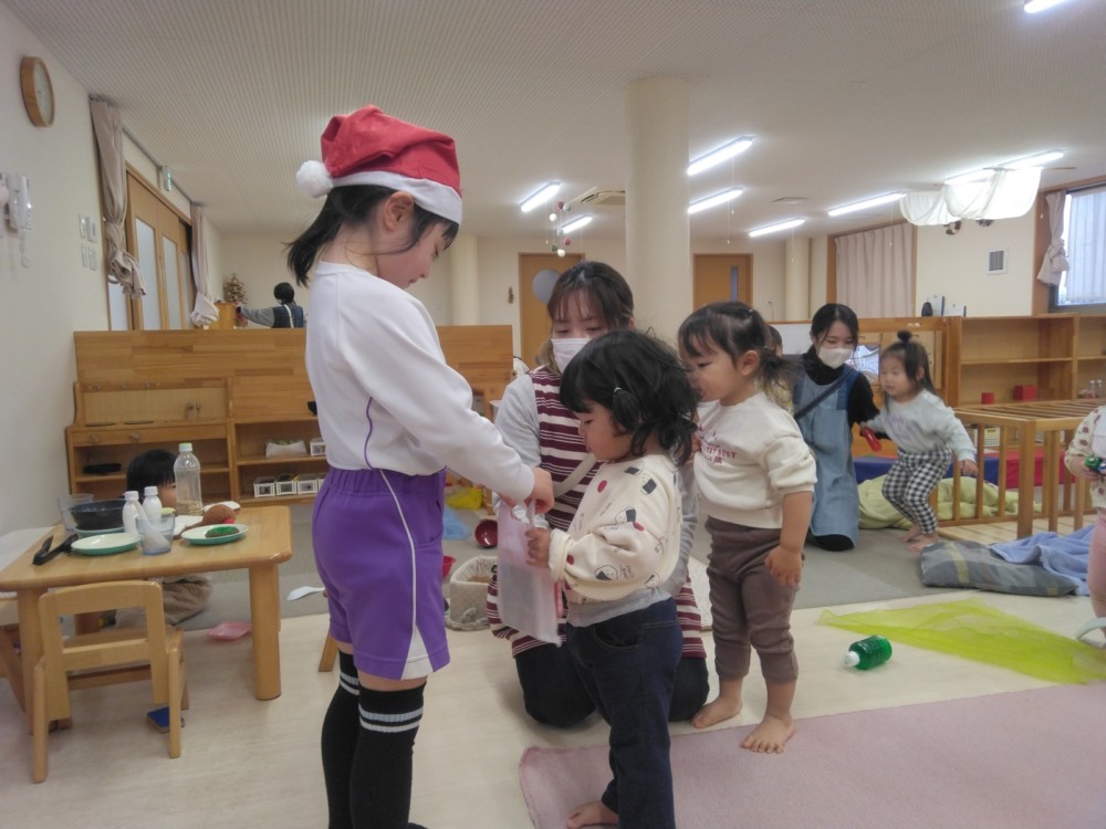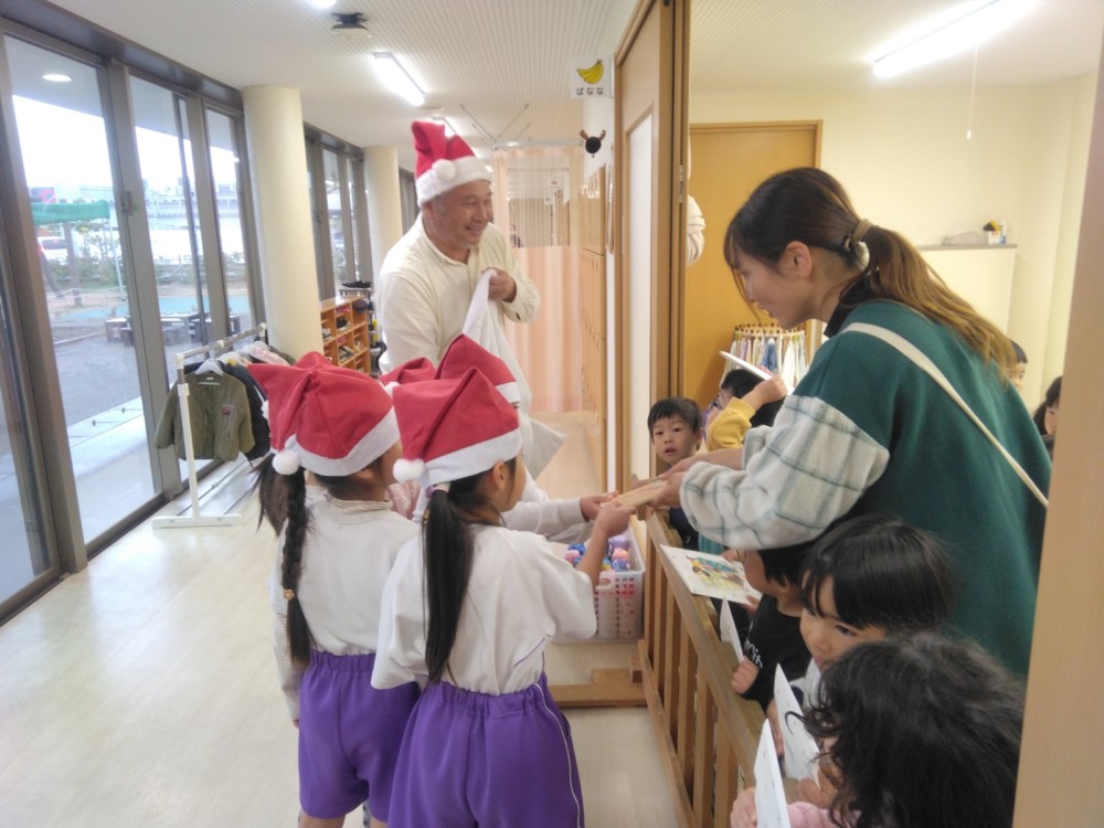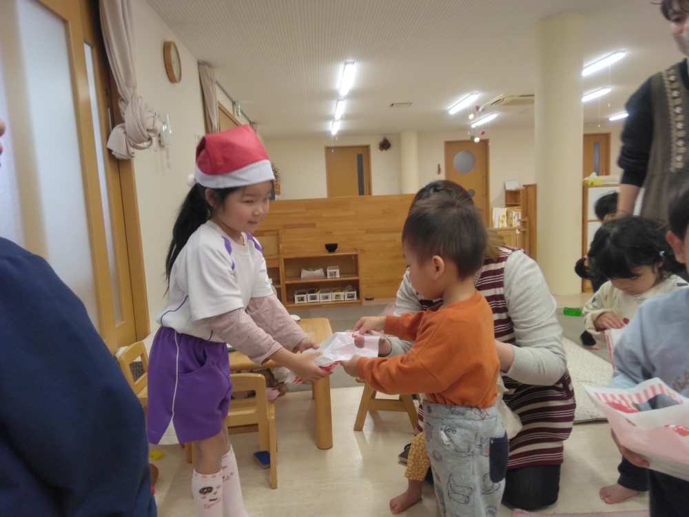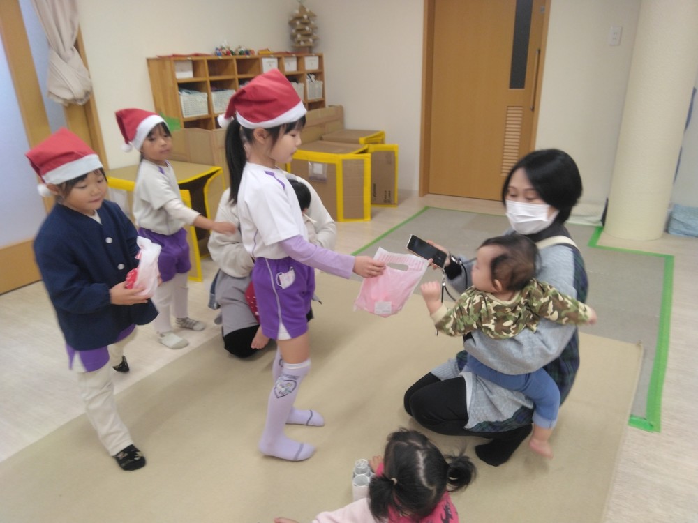 いちご、さくらんぼ、ばなな組さんもプレゼントをもらいました。めろん組さんが、サンタに扮して手伝ってくれましたね。