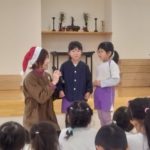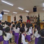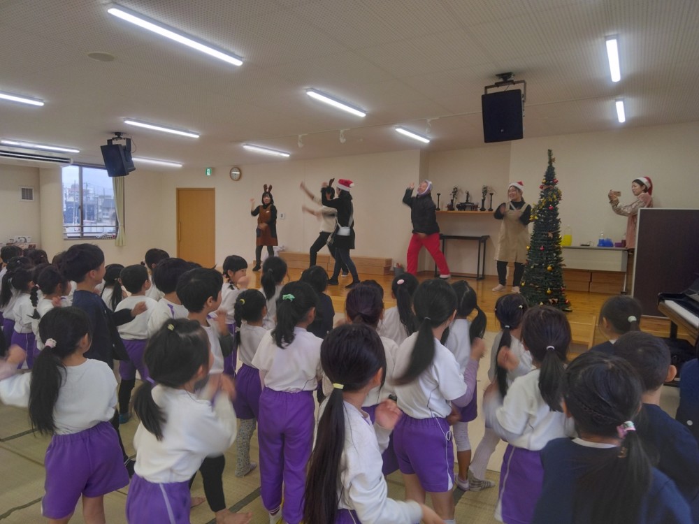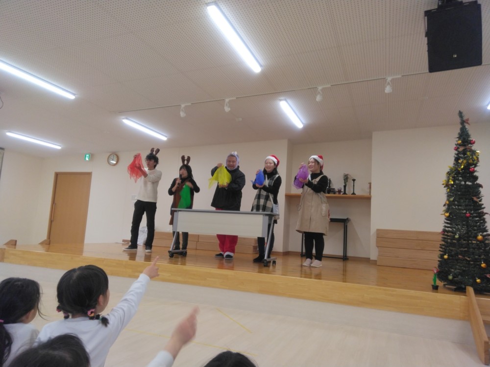 先生たちの劇(コント)「サンタさんと楽しいマジックショー ~It’s a SHOWTIME~」。手品を披露し、みんなと一緒にダンスもしました。