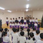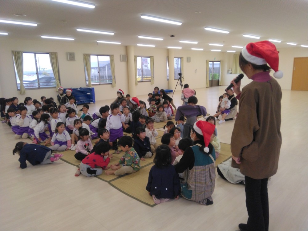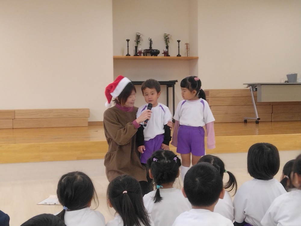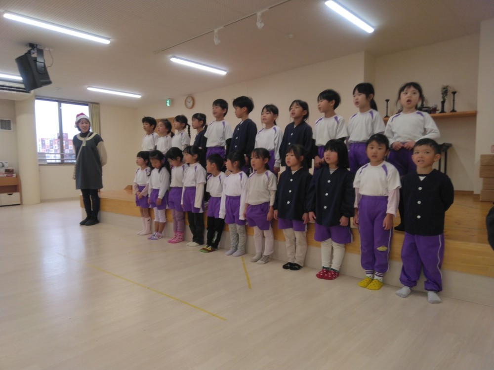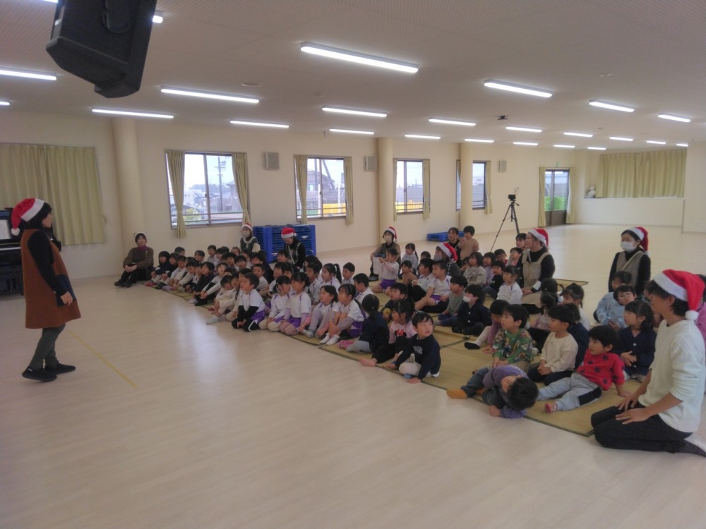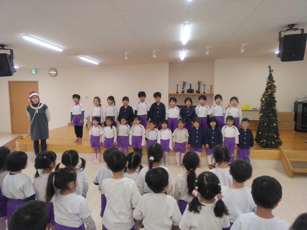 「クリスマスのうたがきこえてくるよ」。めろん組さんはステージで、みかん組、ぶどう組も大きな声で歌ってくれました。