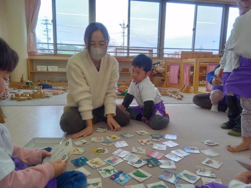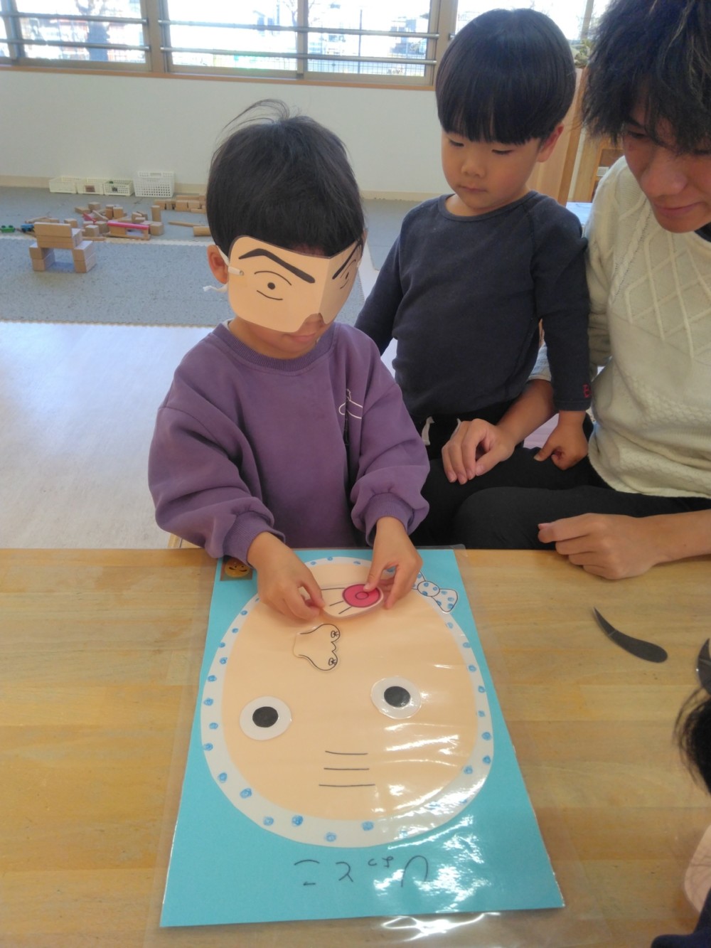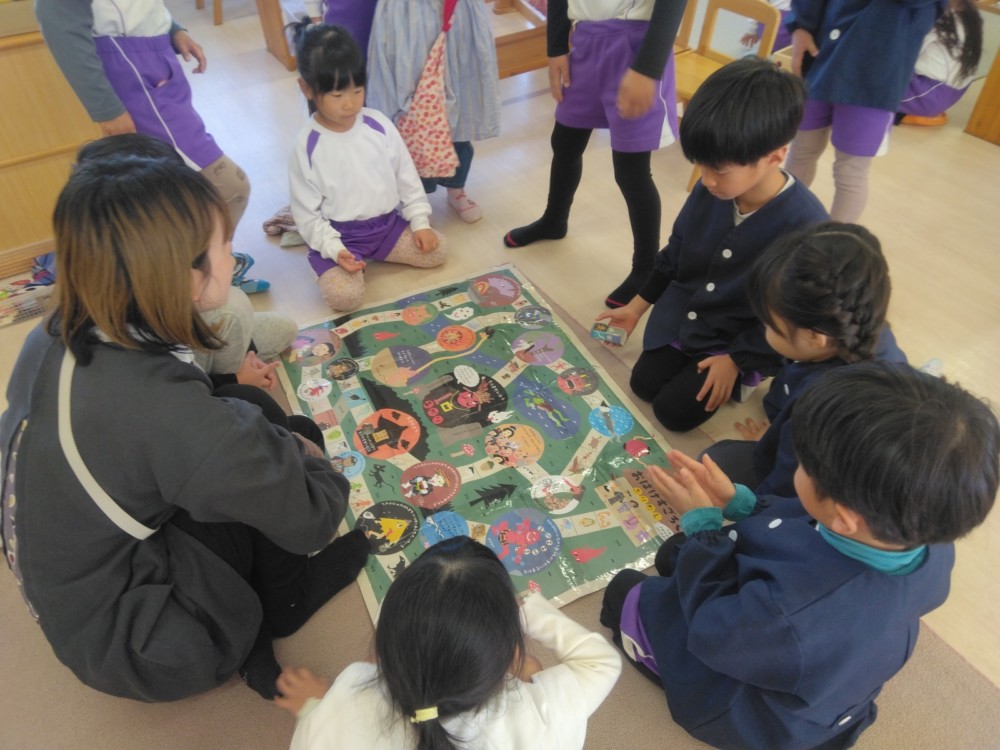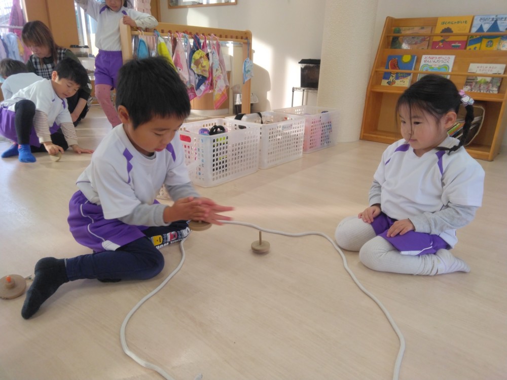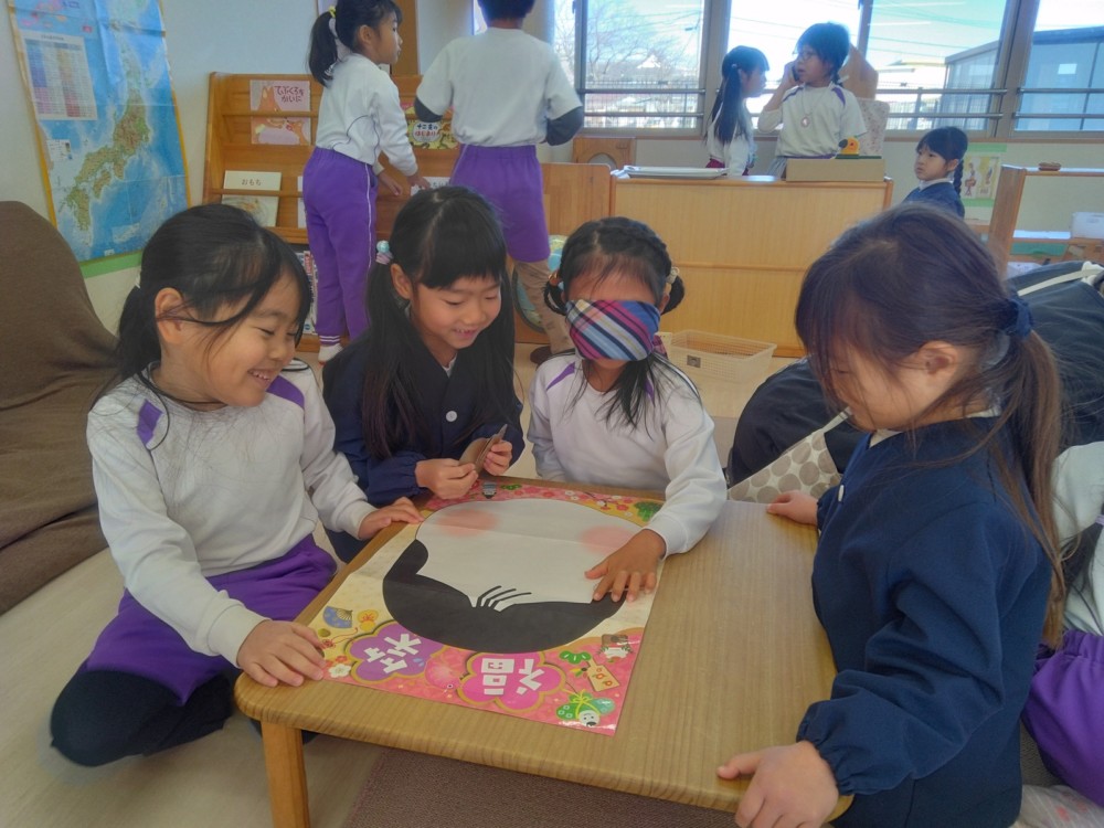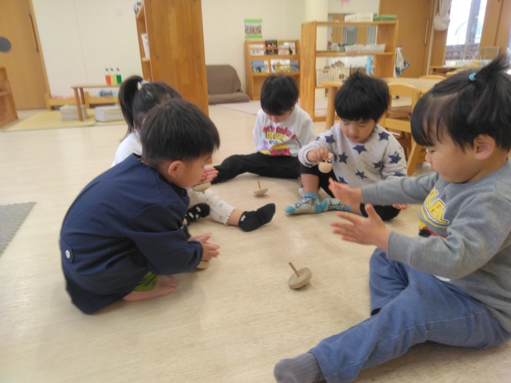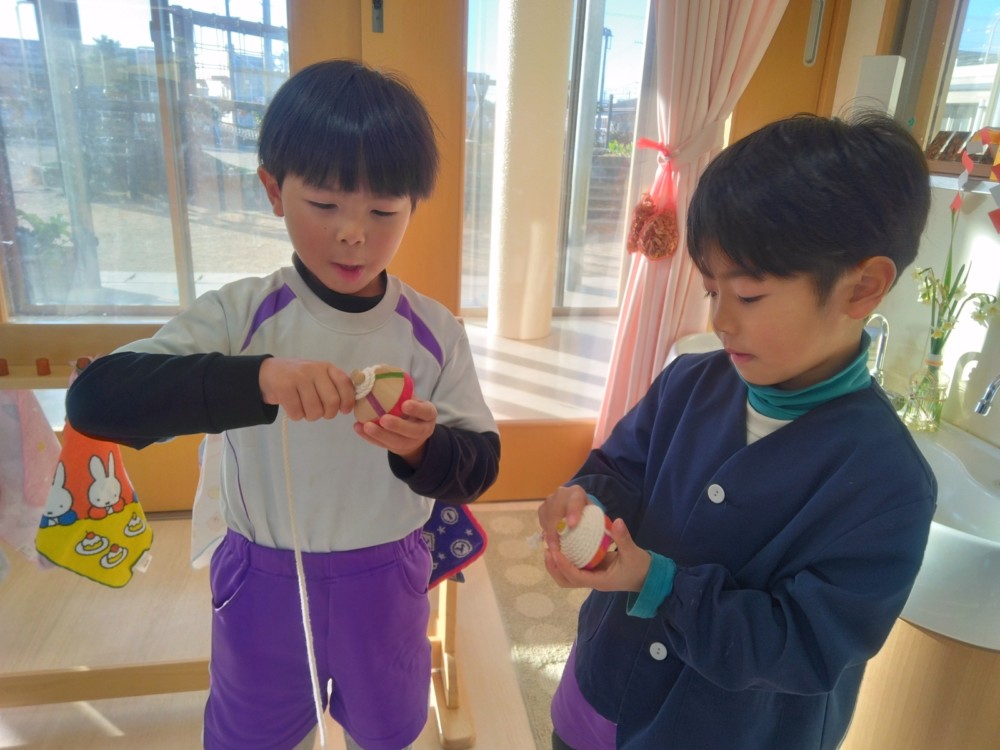 お正月遊び 2026年01月10日 冬休みが明け、1週間。子どもたちは、お正月遊びを楽しんでいます。 たこあげ、かるた、コマまわし、福笑い、すごろく、けん玉、だるま落とし…日本の伝統的な遊びや、ゲームを楽しんでいます。 寒い冬、お部屋の中でじっくりとルールのある遊びに取り組んでいます。
