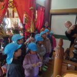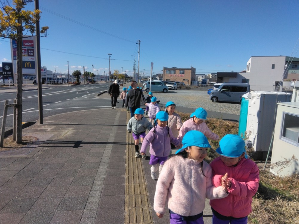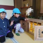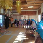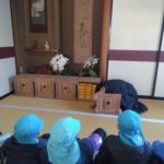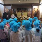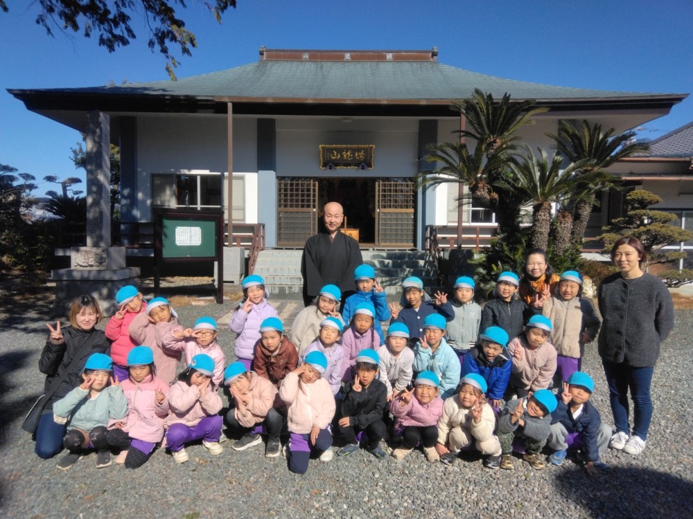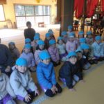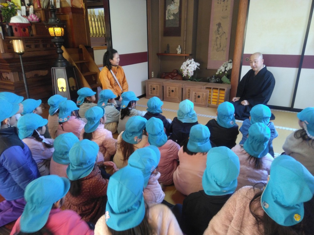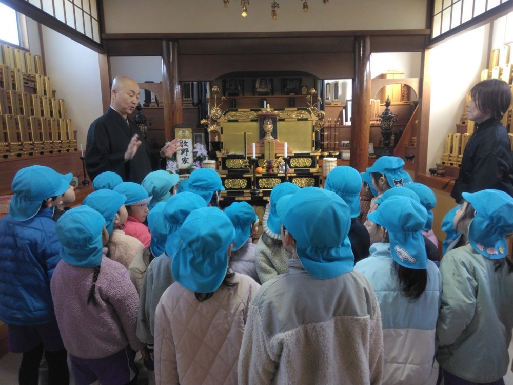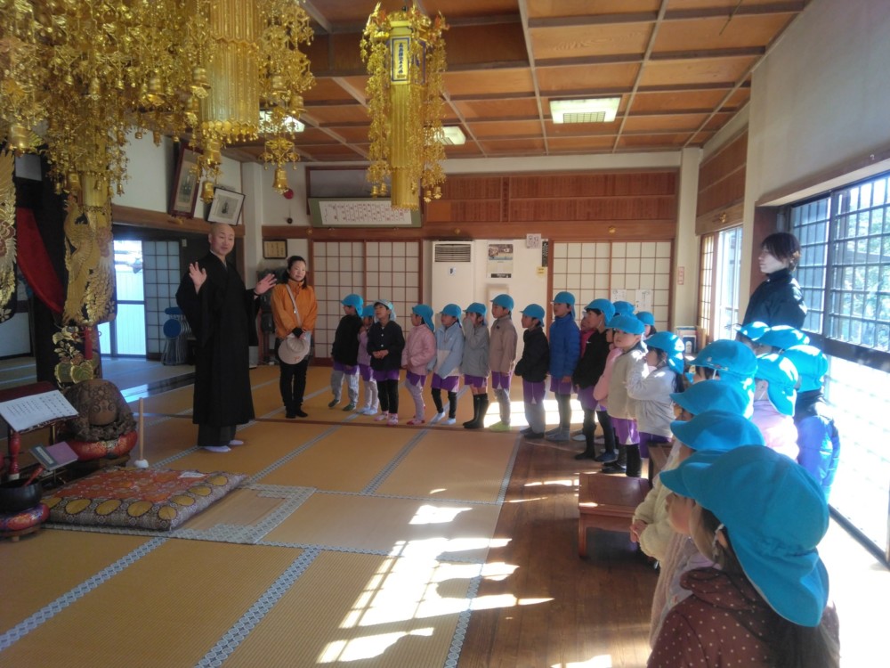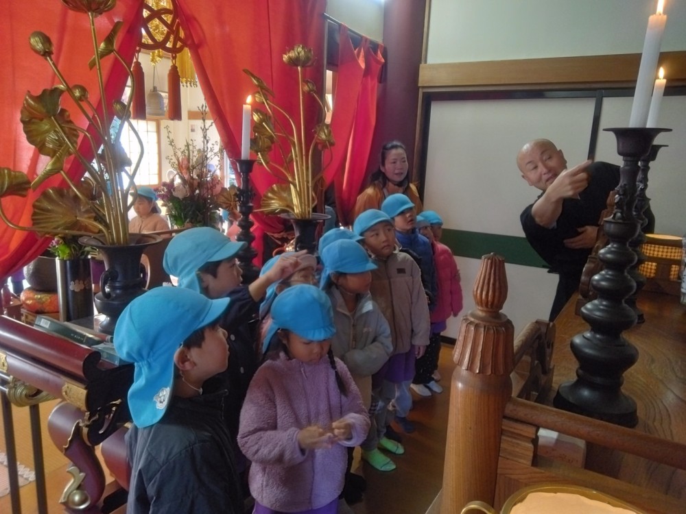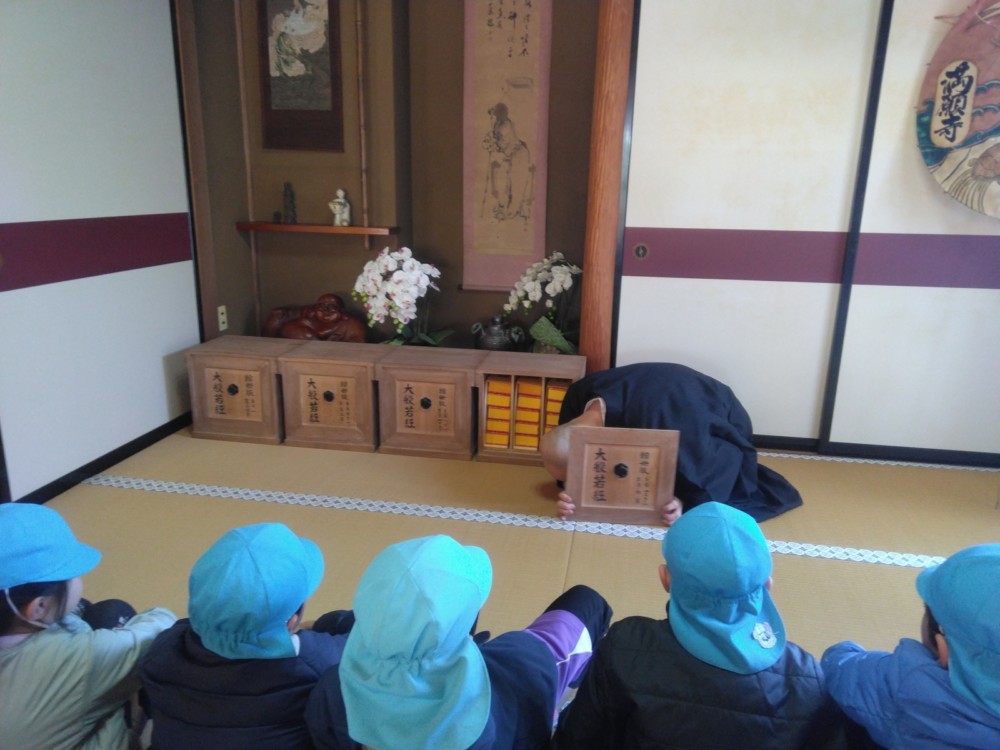 満願寺へ(めろん組) 2026年01月26日 1月23日(金) めろん組さんは、先日の成道会でも来ていただいたお坊さんのお寺「満願寺」へ出掛けました。本堂を見せてもらい、きれいな装飾に歓声があがります。「お寺には小僧さんはいるの?」「おばばが来たことある?」子どもたちから沢山の質問が出ました。 そして、「さんまいのおふだ」に登場する「経箱」を見せてもらいました。「小僧さんはどうやって隠れたのか」みんなの疑問が一つ解けましたね。
