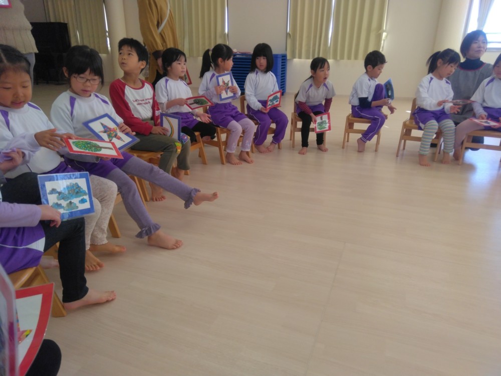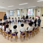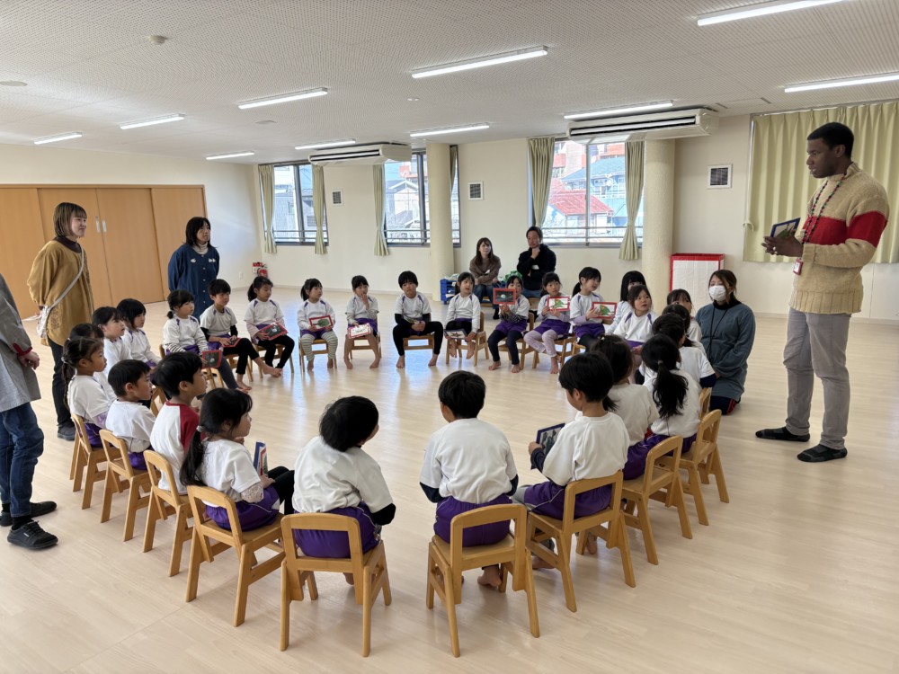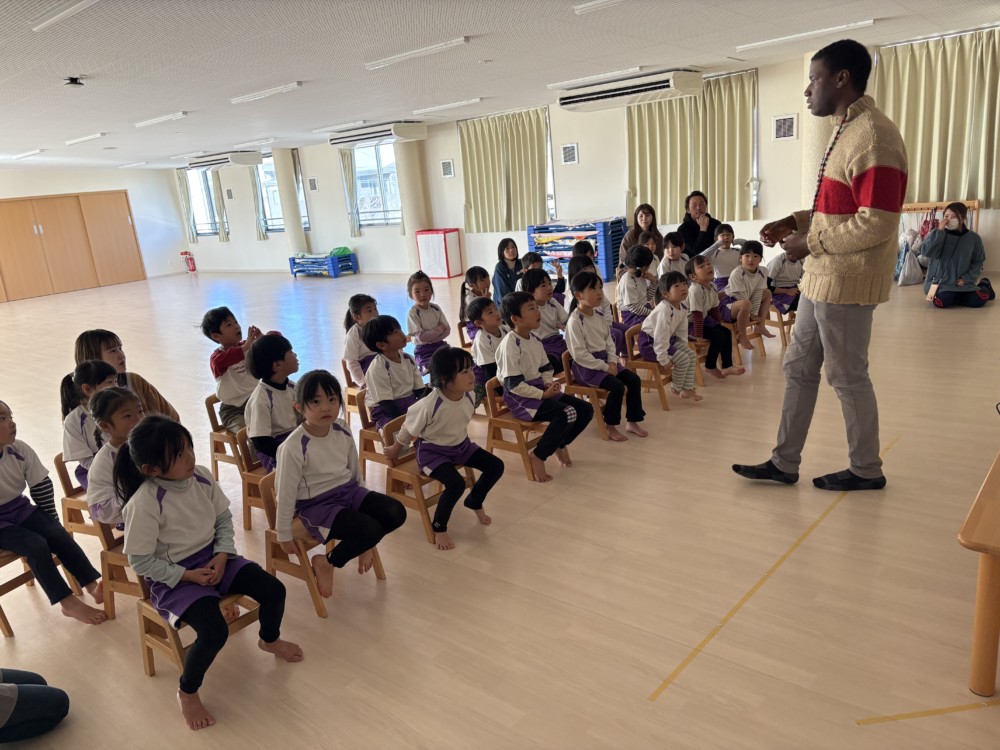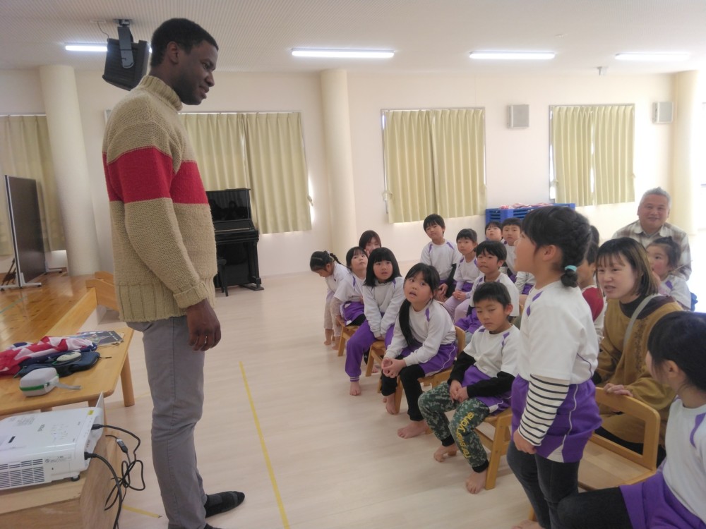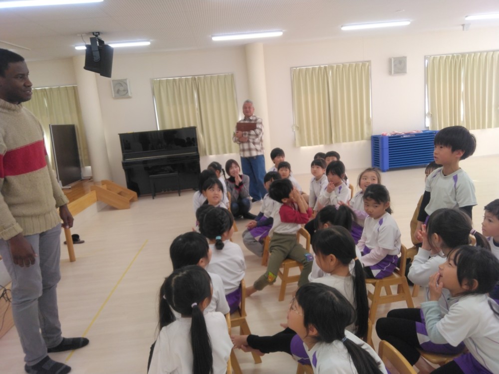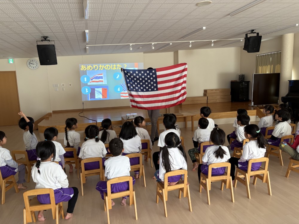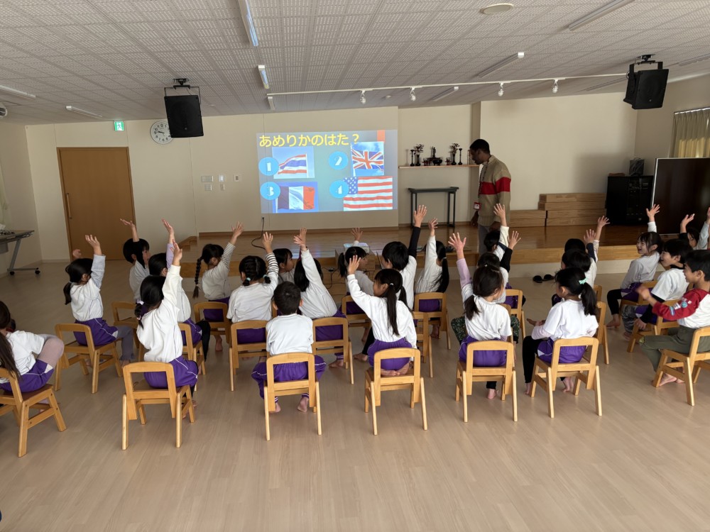 1月29日(木) ハローイングリッシュがおこなわれ、アメリカ・アトランタ出身のマイケルさんが英語で歌やゲームを紹介してくれました。カードを使って英語で「フルーツバスケット」。マイケルさんへの質問コーナーでは、ドキドキで手を挙げていました。