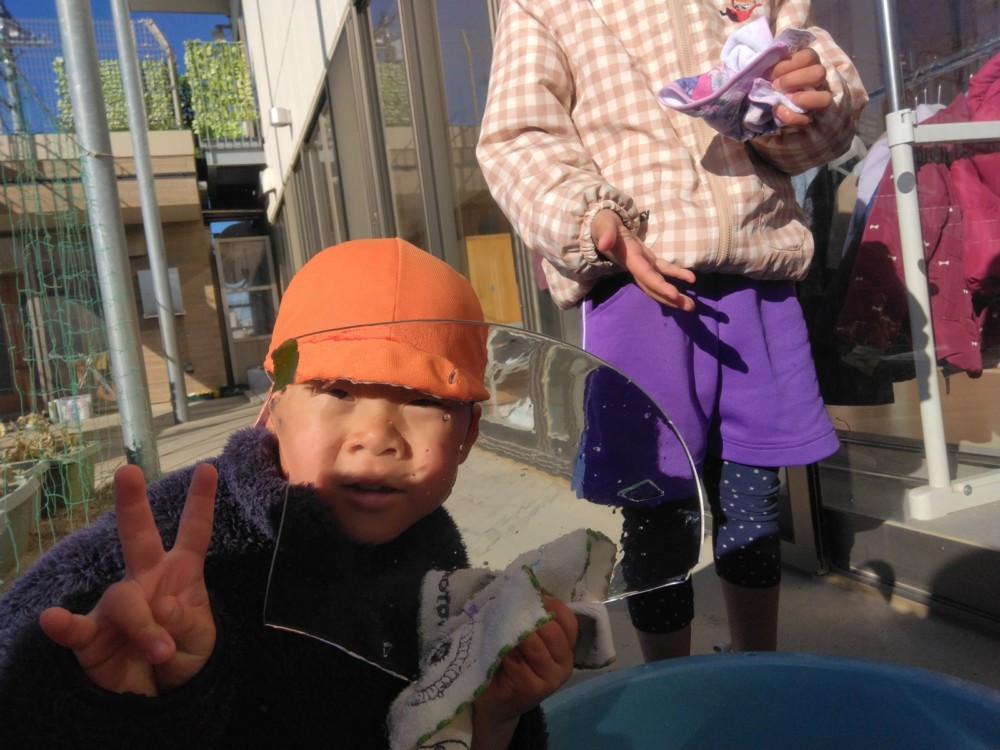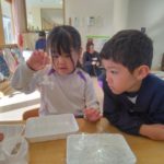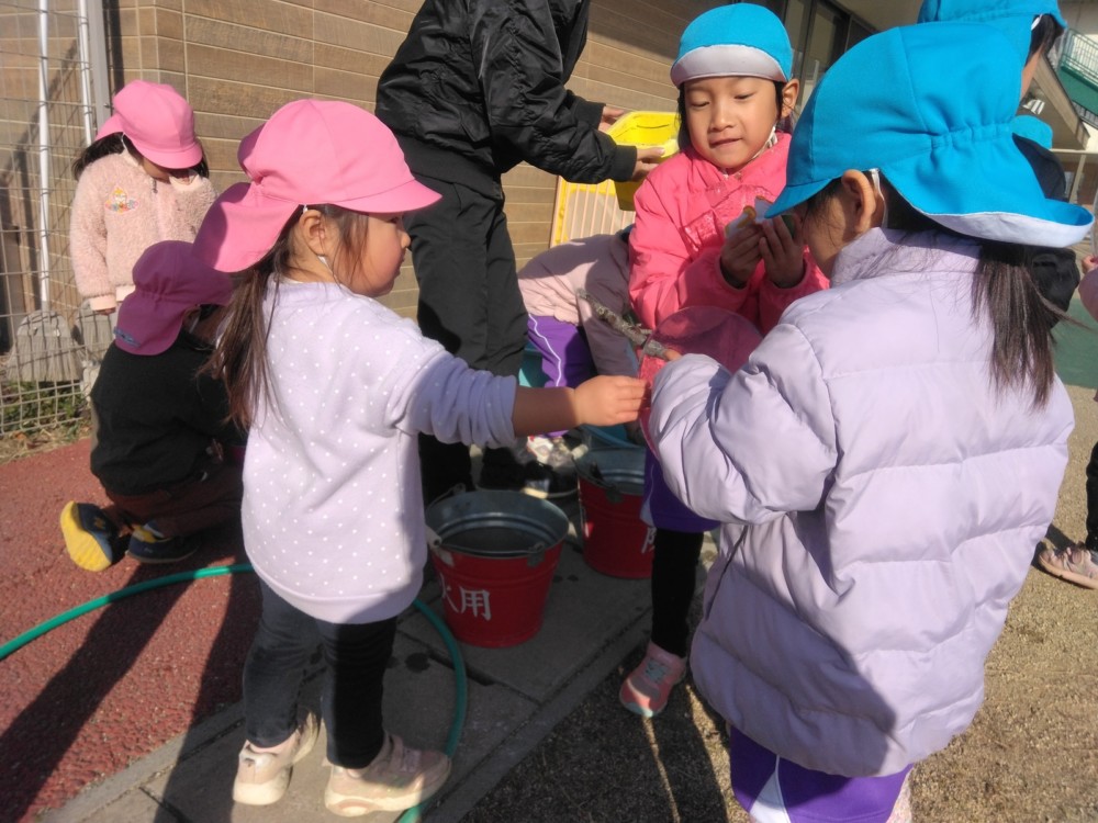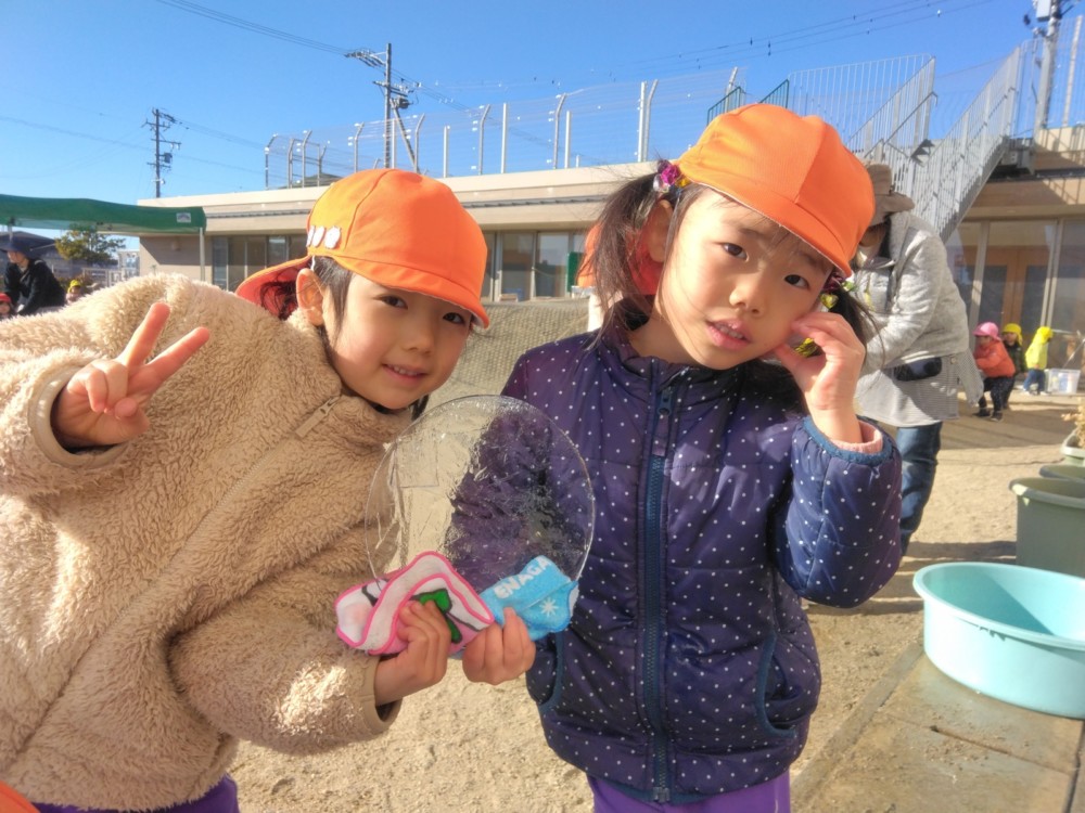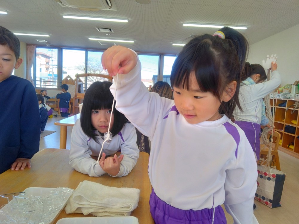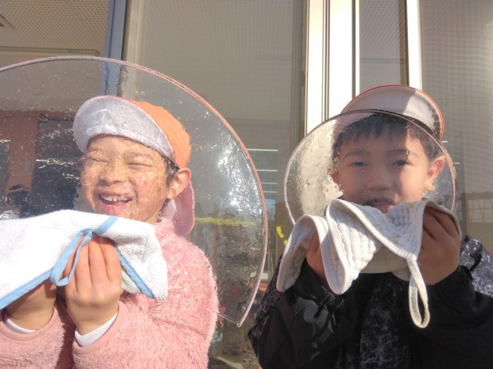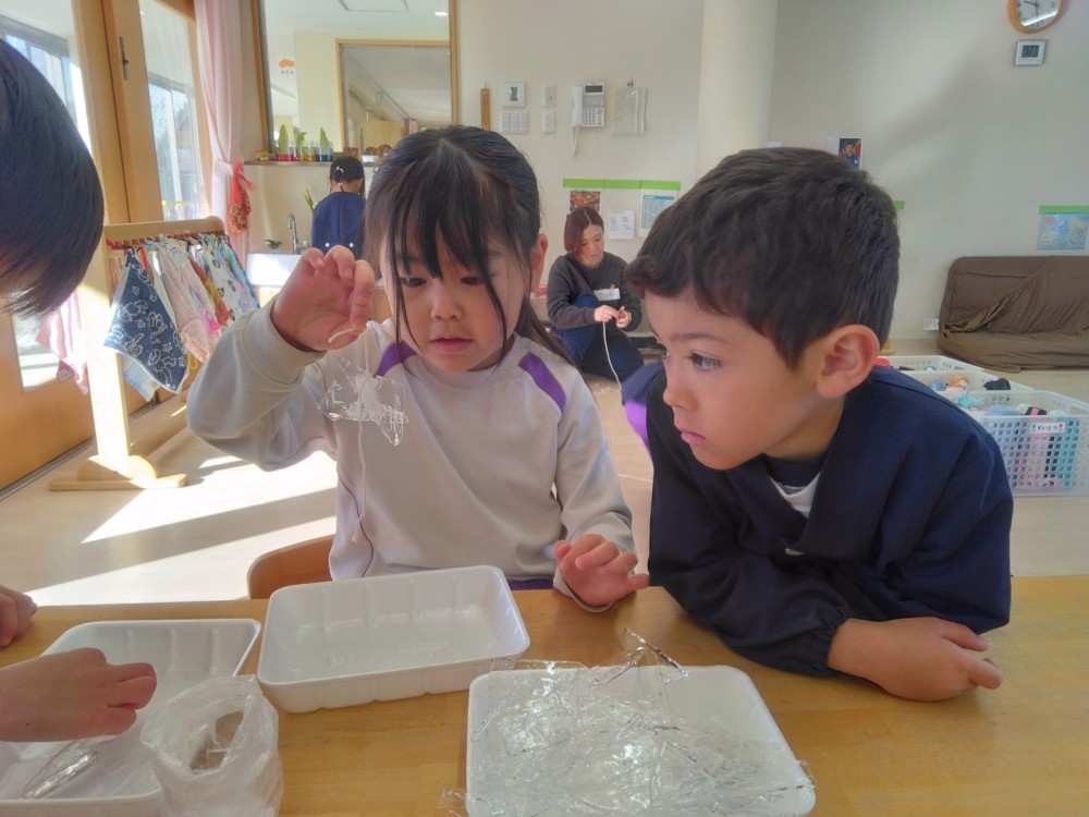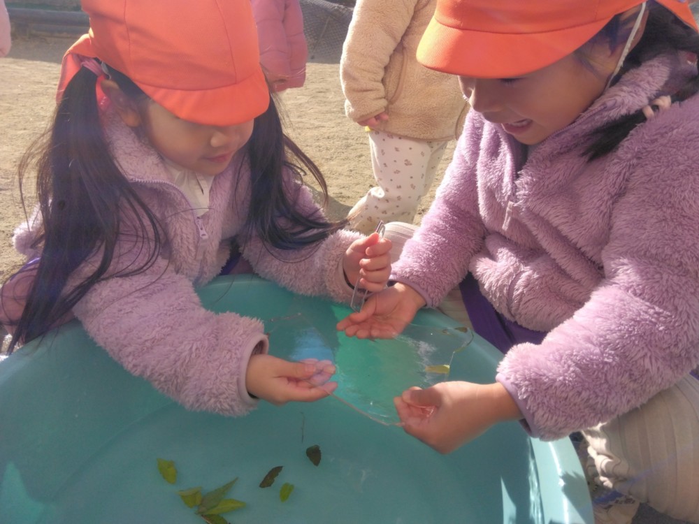 ちょーつめたーい! 2026年02月03日 この氷、前日に風の当たらない日陰に、水を張った容器を準備していたんですよ。翌朝に氷ができるのが楽しみです。 めろん組さんは、氷と塩を使ってちょっとした実験を…不思議なことが起きていますね。