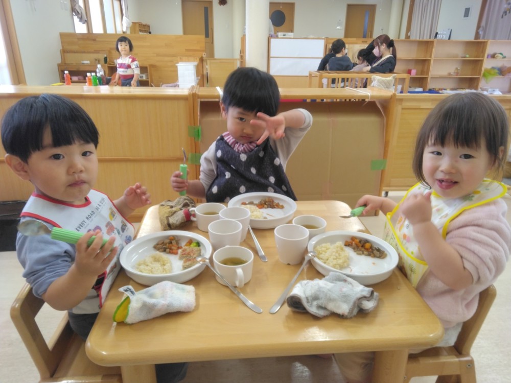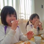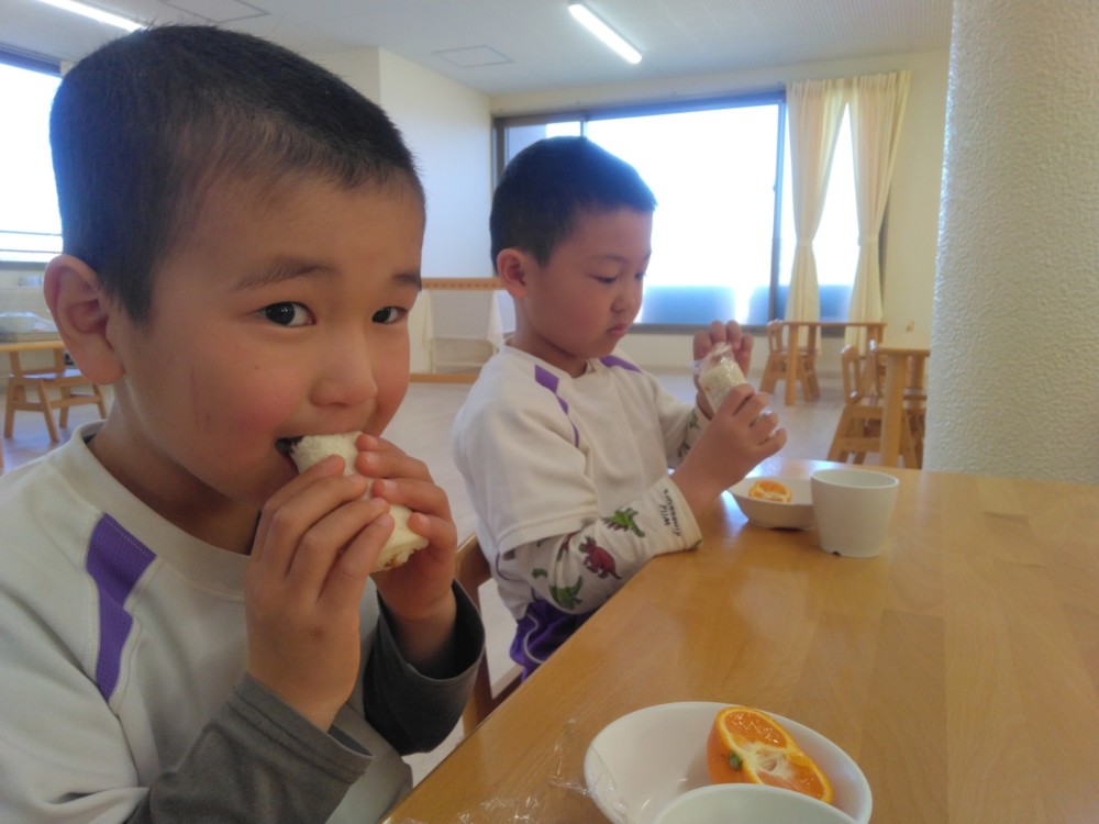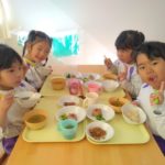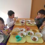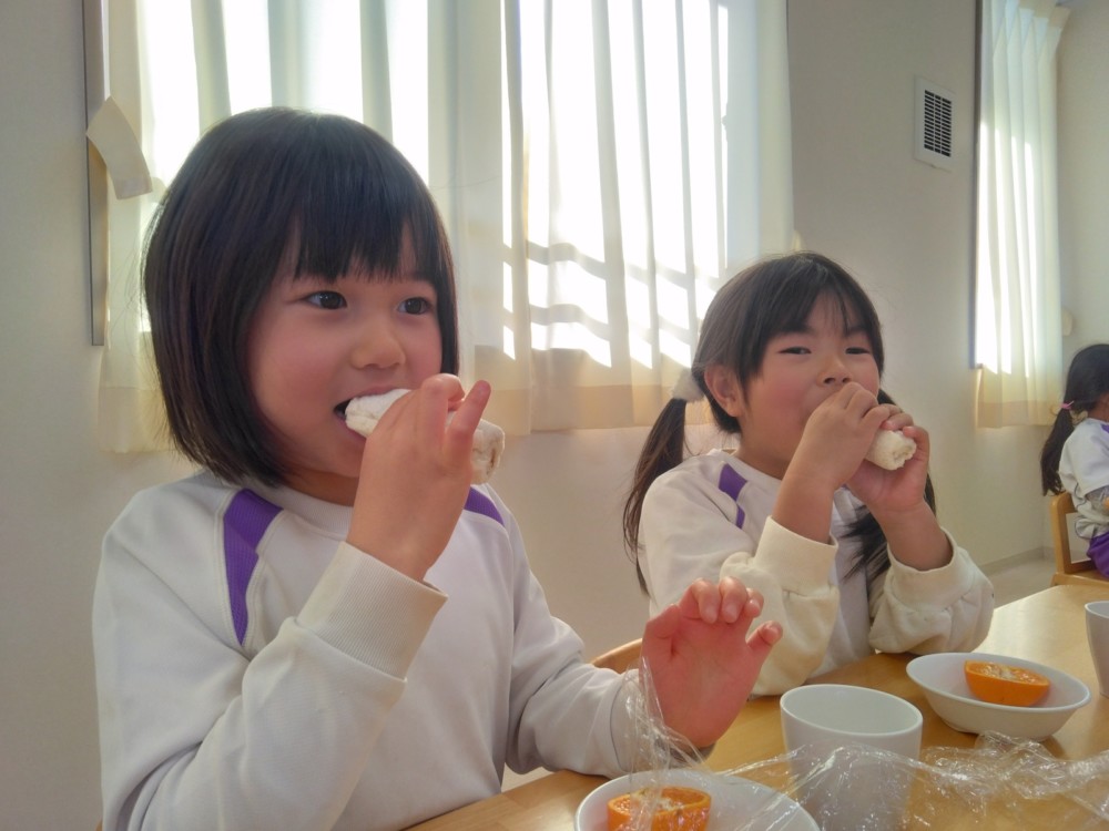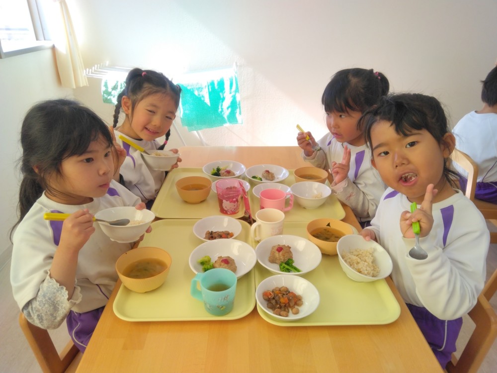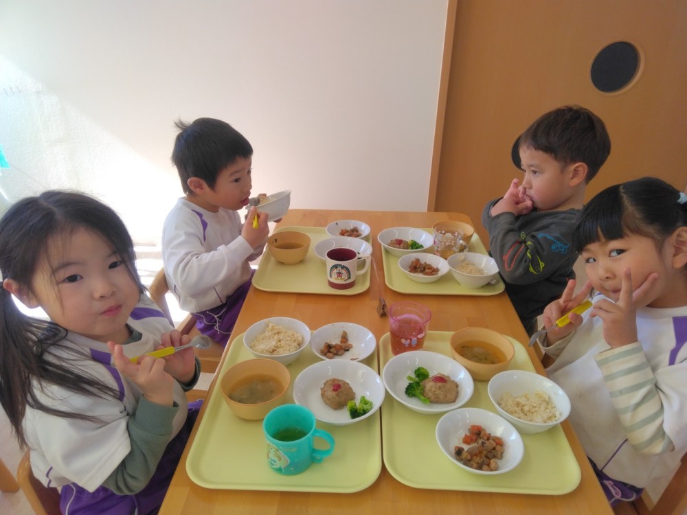 給食は、きびを使ったきびごはん、いわしのハンバーグ、豆を使った五目煮豆など。おやつは恵方ロール。これで厄を払って今年一年、鬼に負けずに過ごせますね。