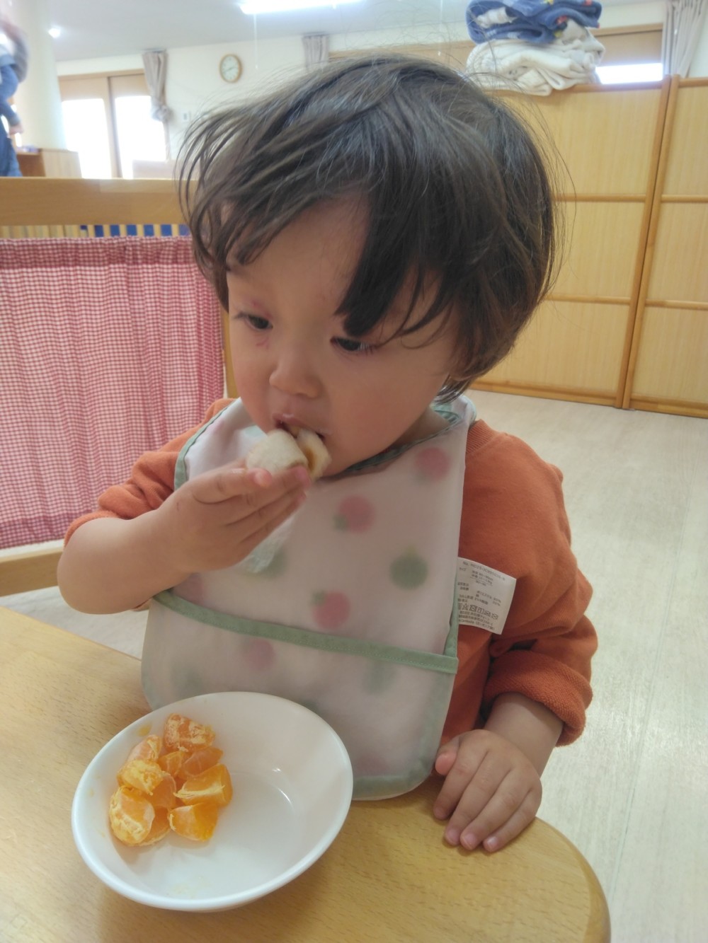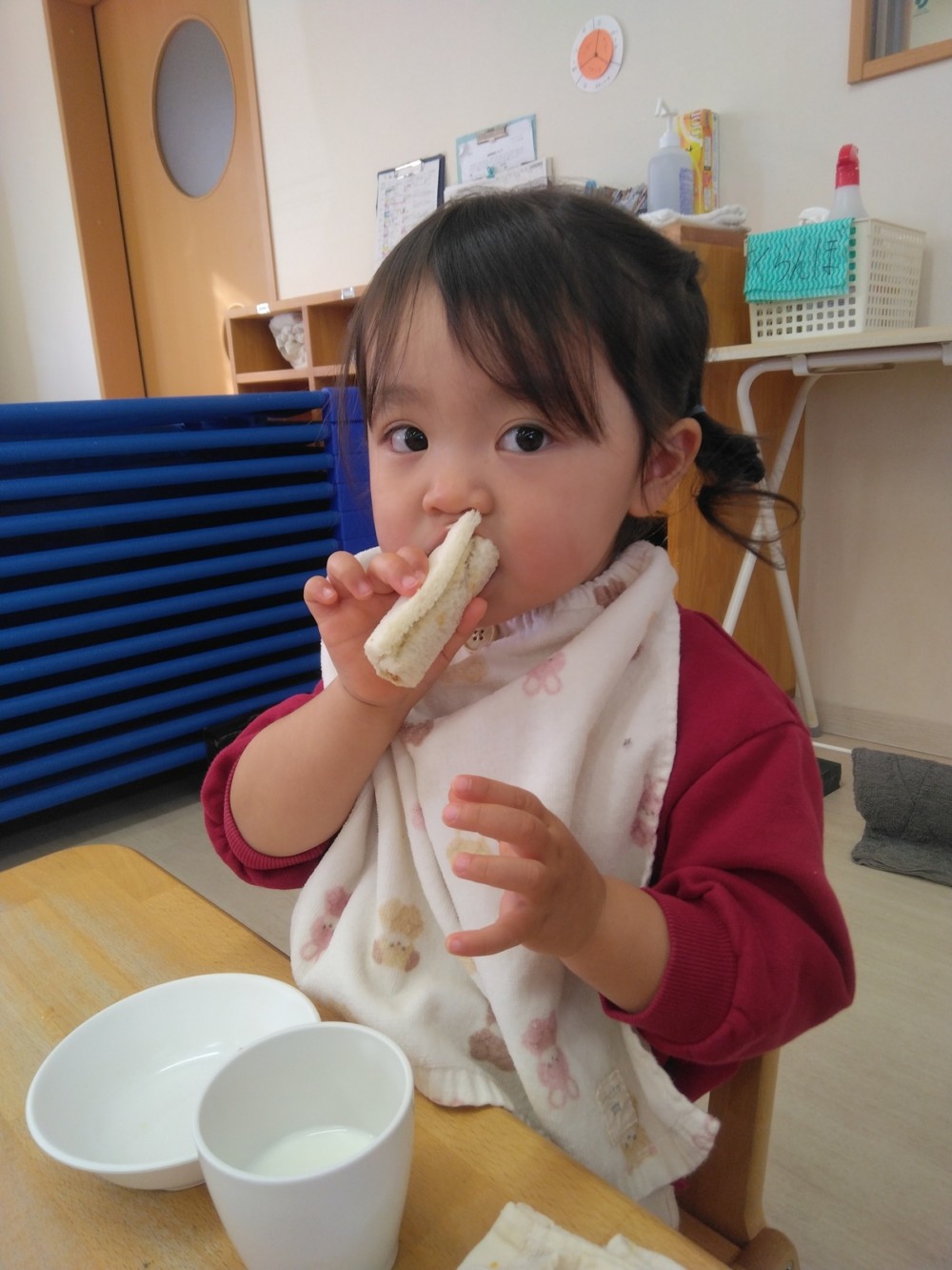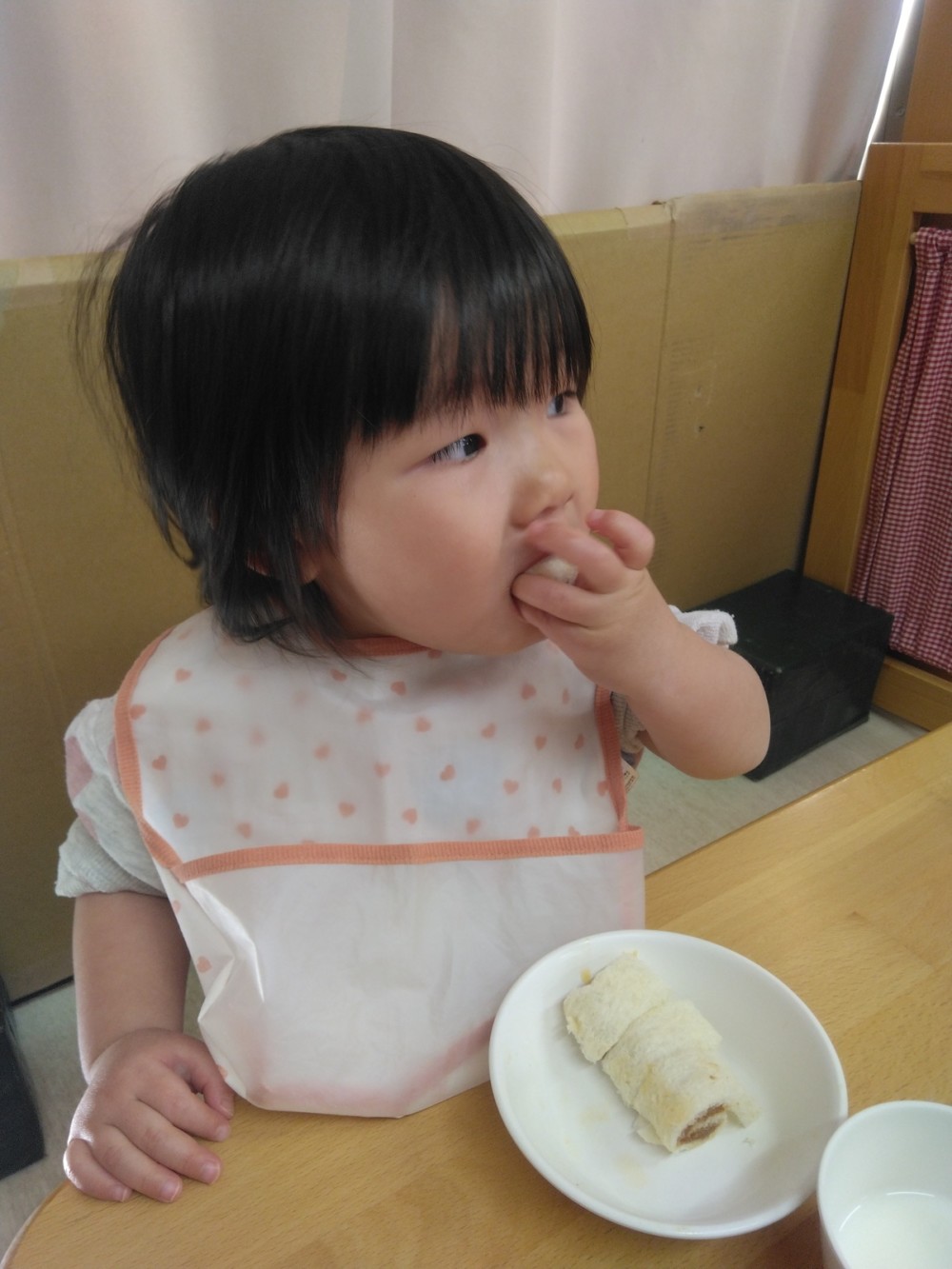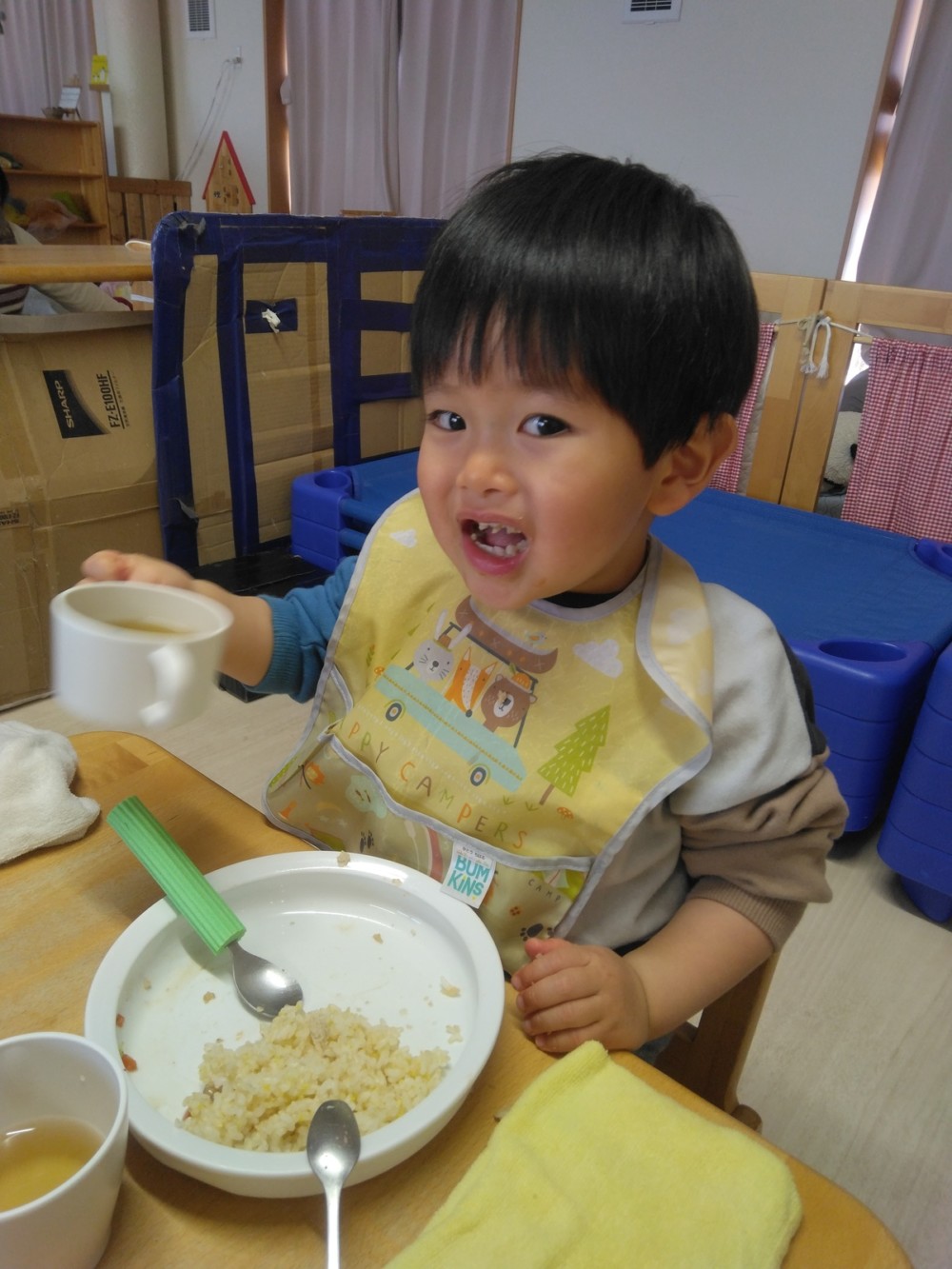 給食は、きびを使ったきびごはん、いわしのハンバーグ、豆を使った五目煮豆など。おやつは恵方ロール。これで厄を払って今年一年、鬼に負けずに過ごせますね。