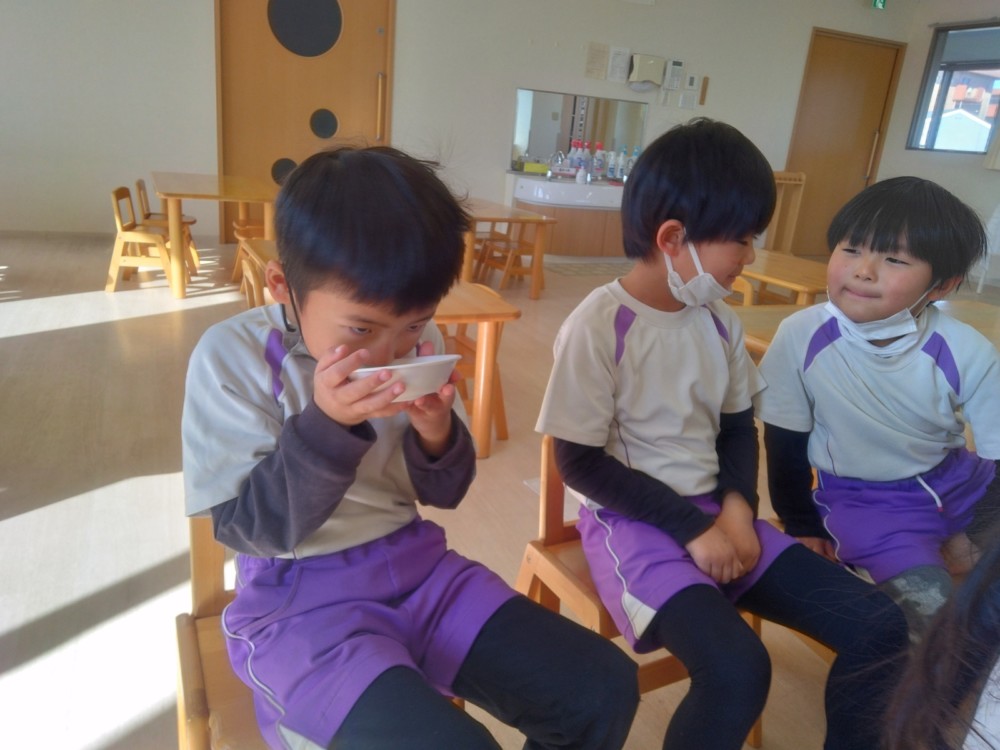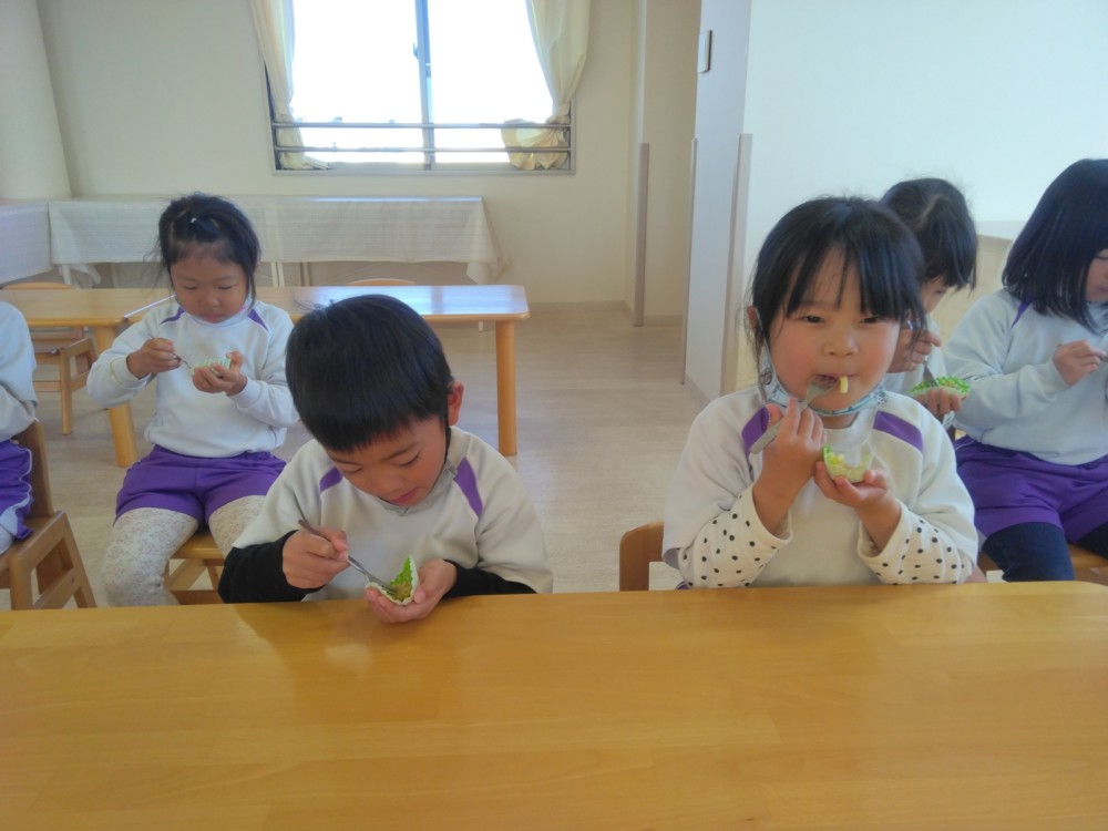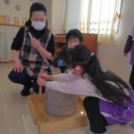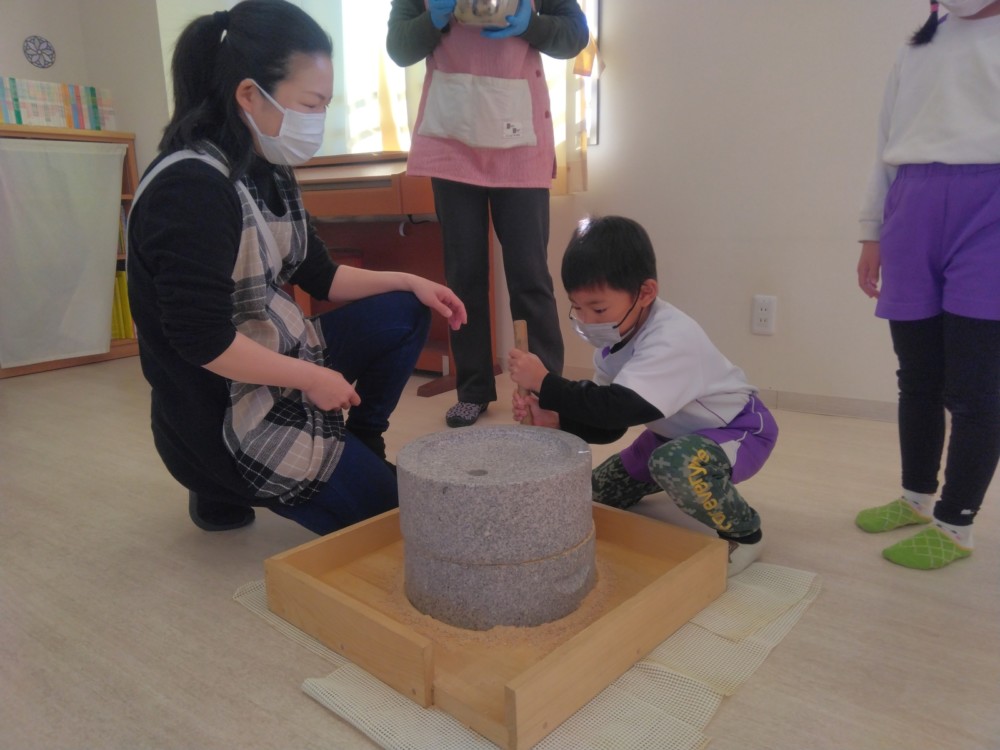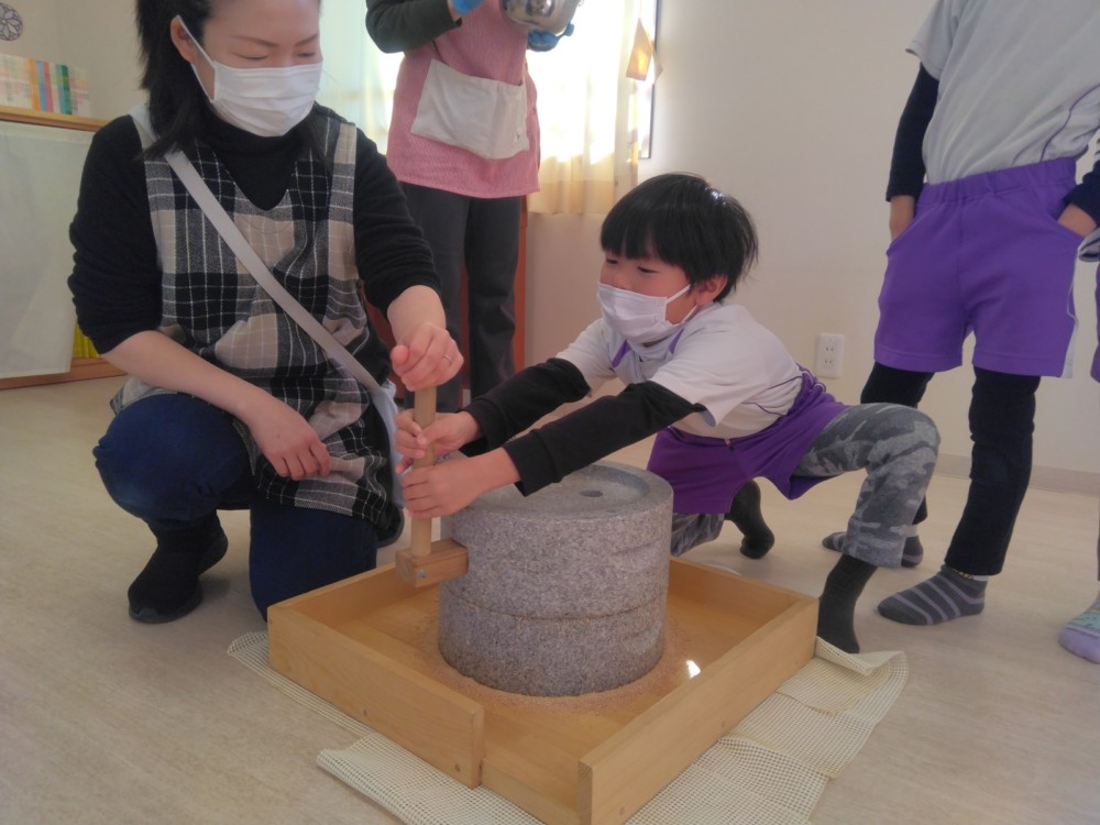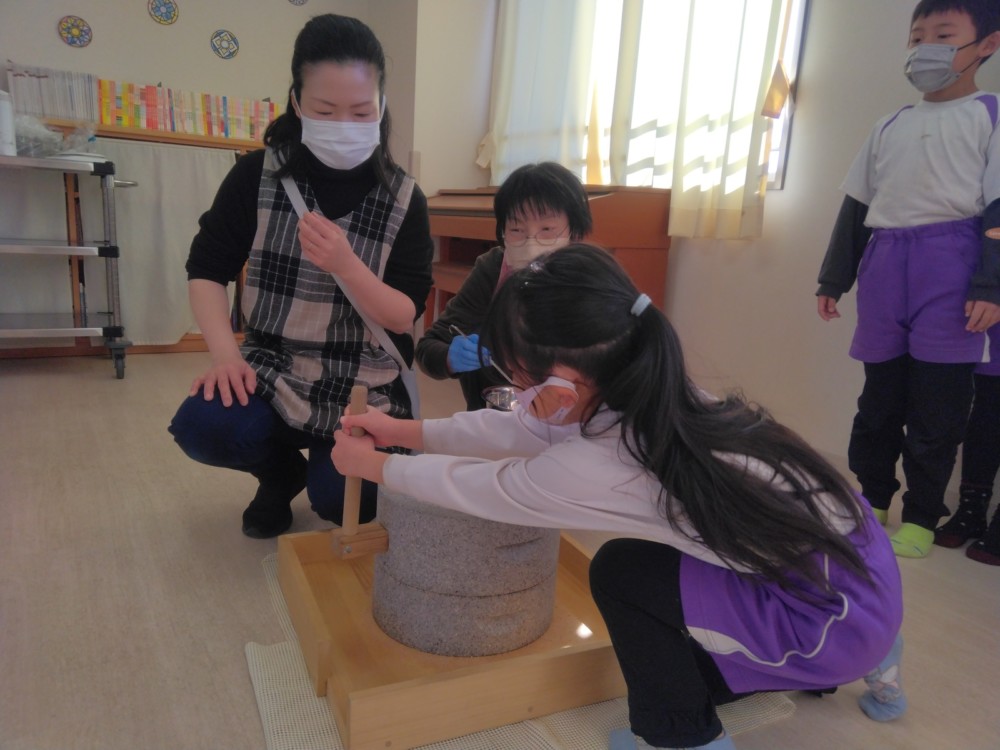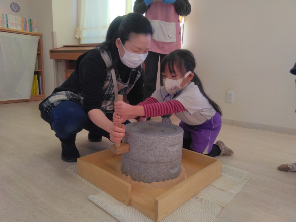 前日(2日)、めろん組さんは園で栽培した大豆(一部使用)からきな粉を作りました。炒った大豆を石臼でひいて、きな粉が完成。「安倍川うどん」を試食。あと、当日(3日)のおやつの「恵方ロール」に使うきな粉も作りました。
