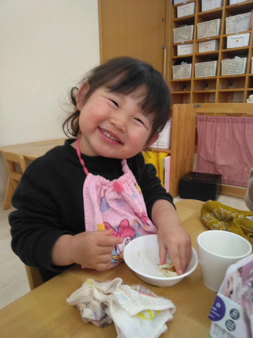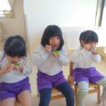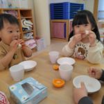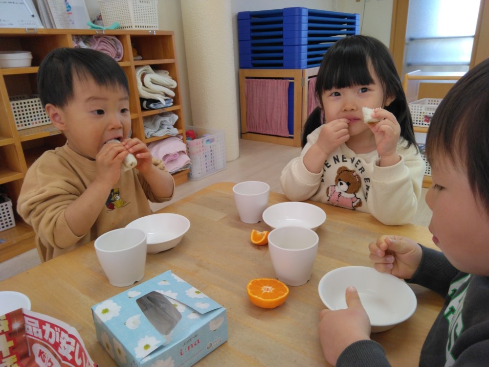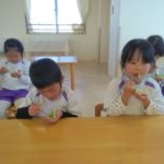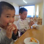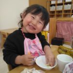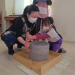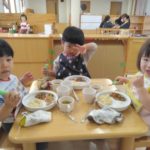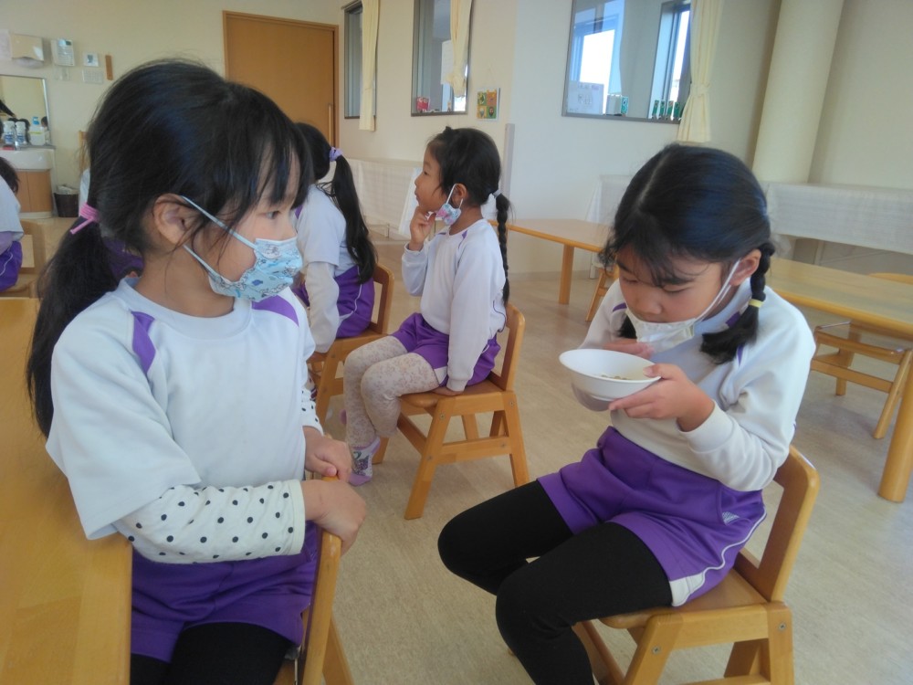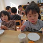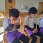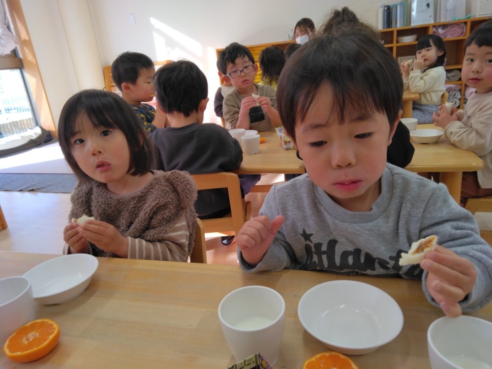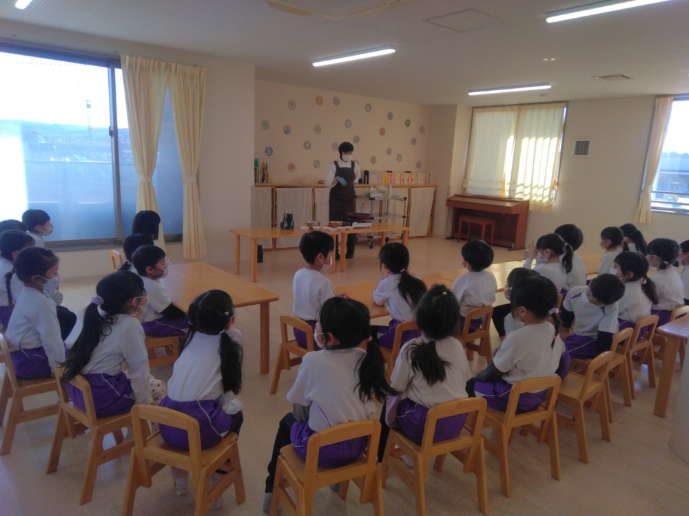 前日(2日)、めろん組さんは園で栽培した大豆(一部使用)からきな粉を作りました。炒った大豆を石臼でひいて、きな粉が完成。「安倍川うどん」を試食。あと、当日(3日)のおやつの「恵方ロール」に使うきな粉も作りました。