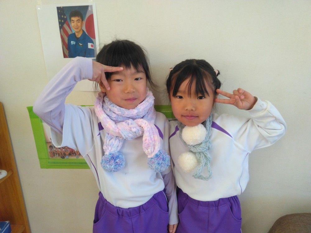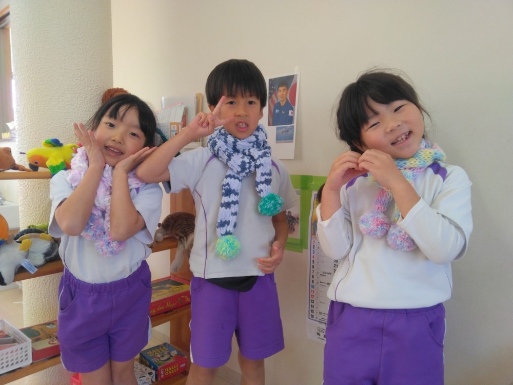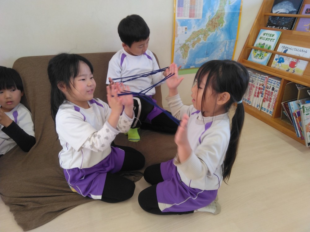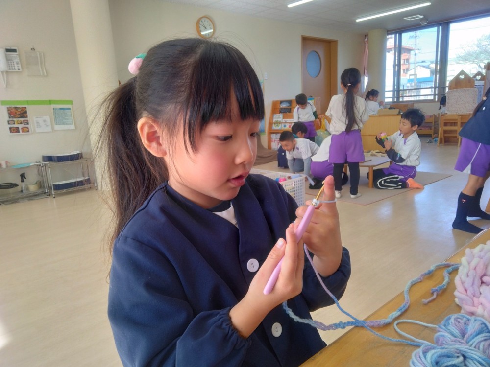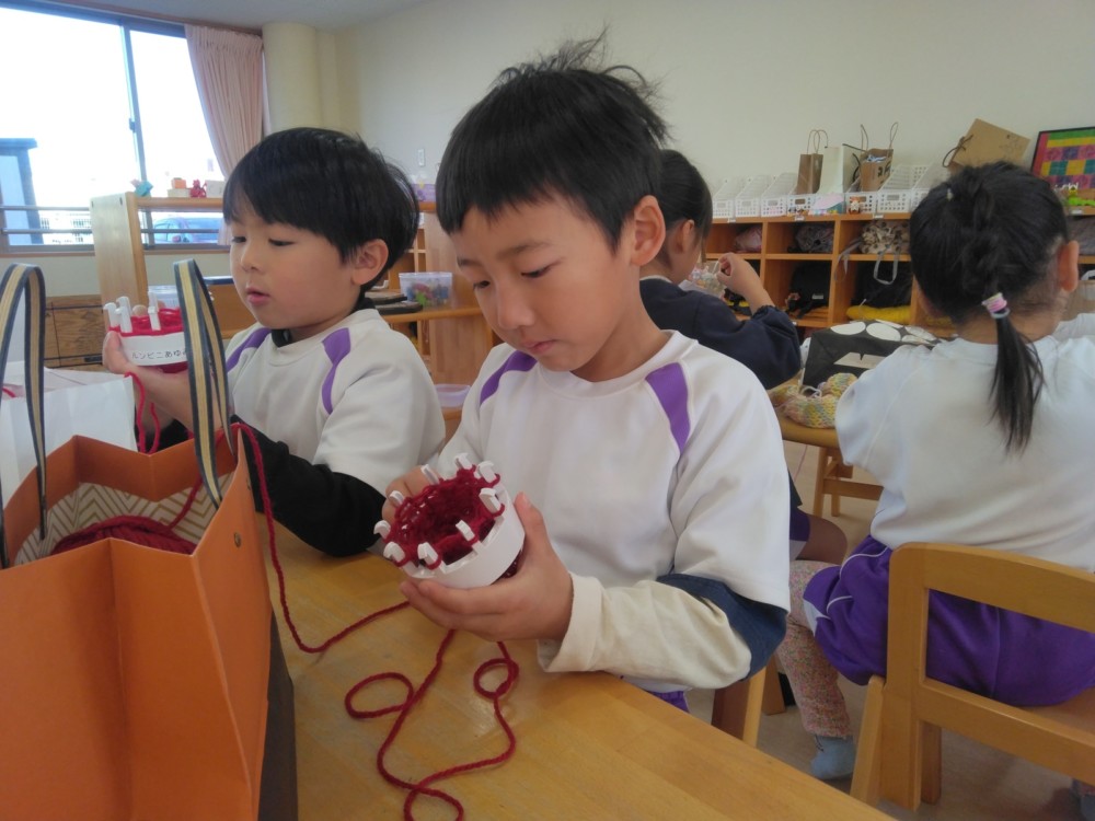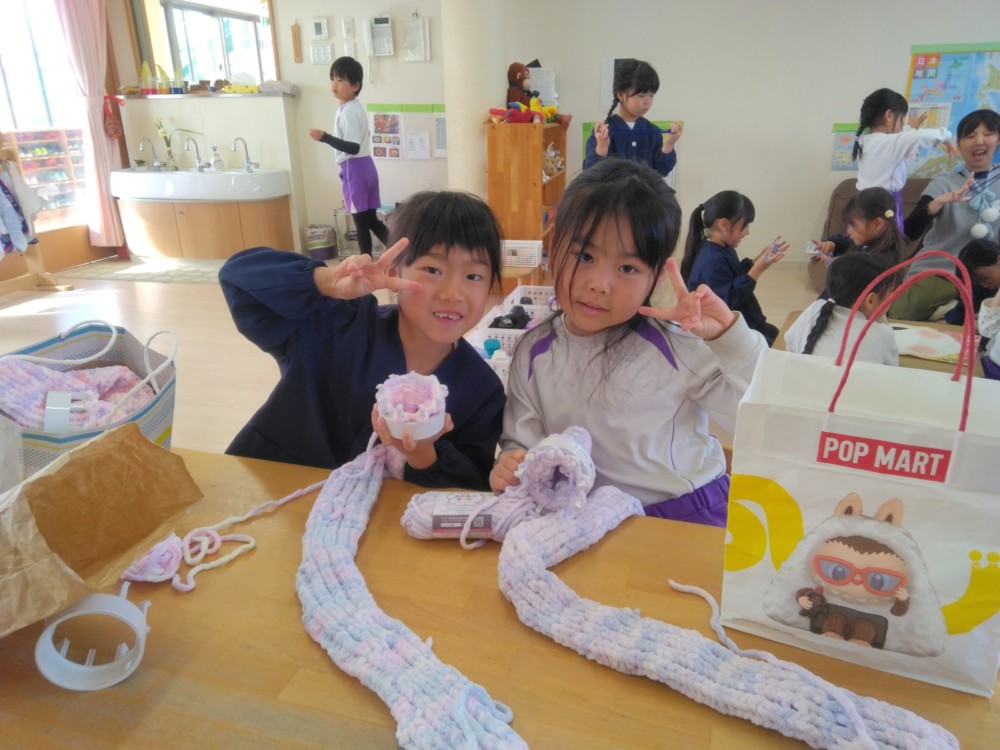 マフラー作り(めろん組) 2026年02月06日 冬休み明けより、コマ回しと同じく、マフラー作りも楽しんでいます。1月下旬からの最強寒波の襲来も、首元はあったか~いですね。 マフラーが完成すると、毛糸を使ってあやとりで遊んだり、糸電話で実験をしたり。 これだけ上手にできれば指先の発達もバッチリ!もう、お箸、鉛筆の持ち方も上手にできるはずですね。