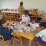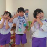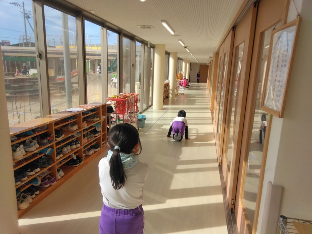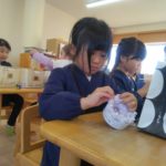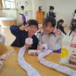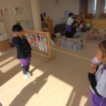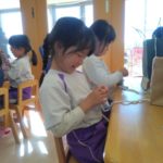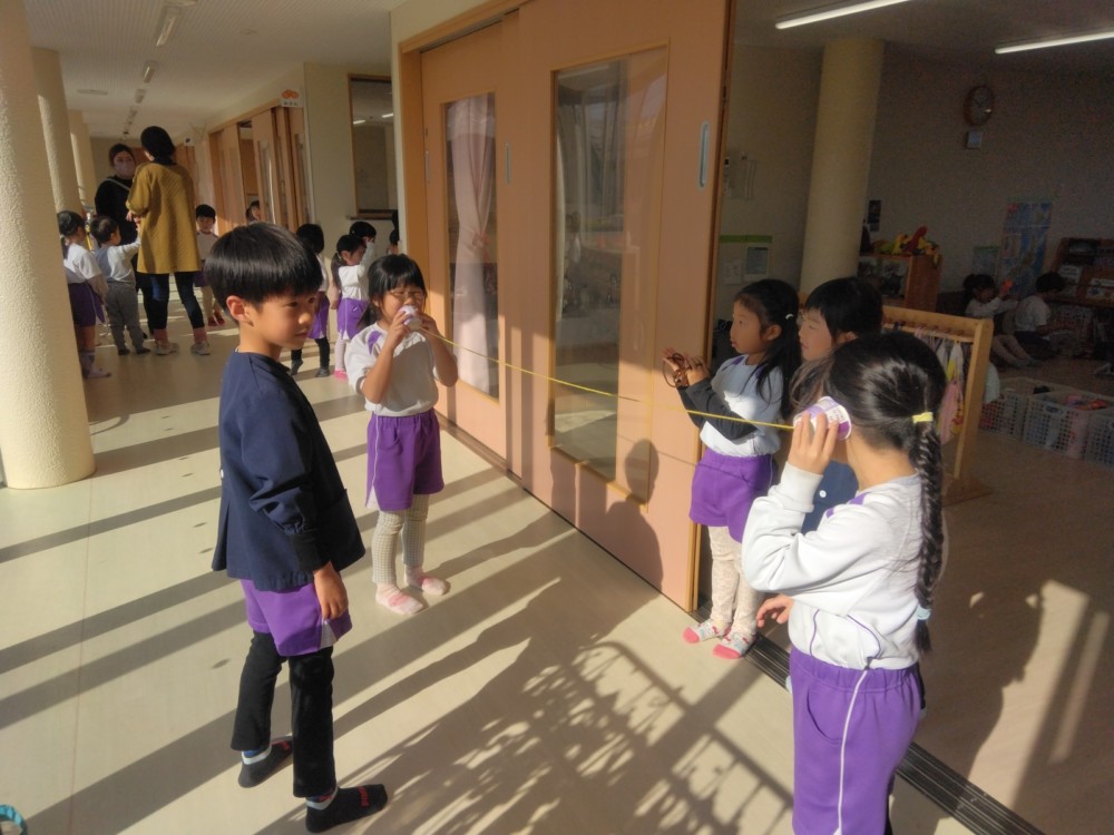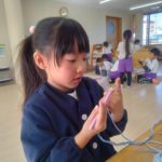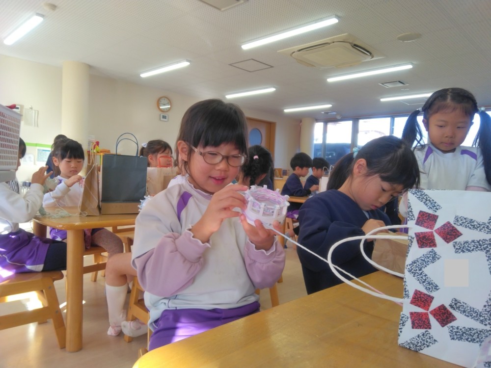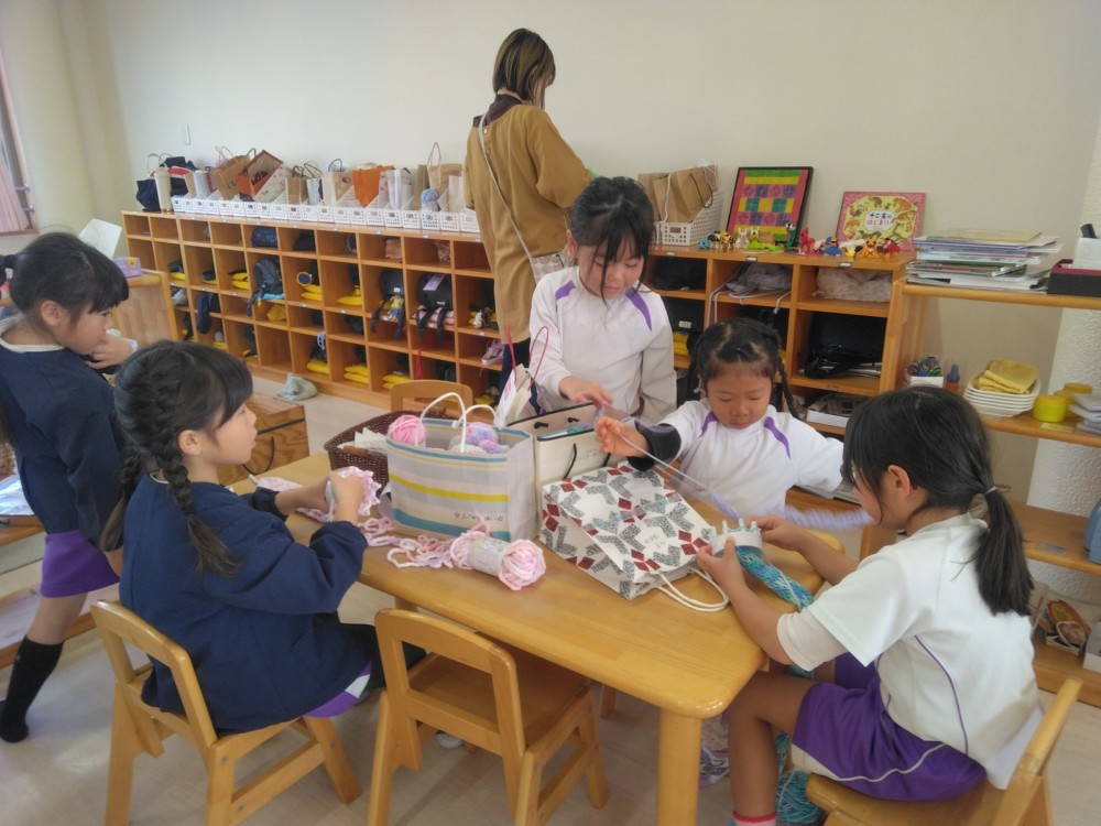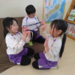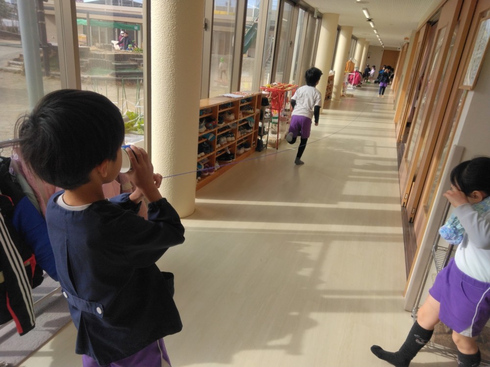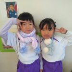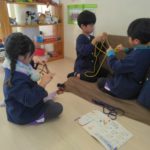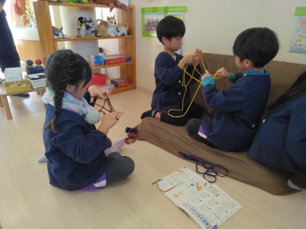 マフラー作り(めろん組) 2026年02月06日 冬休み明けより、コマ回しと同じく、マフラー作りも楽しんでいます。1月下旬からの最強寒波の襲来も、首元はあったか~いですね。 マフラーが完成すると、毛糸を使ってあやとりで遊んだり、糸電話で実験をしたり。 これだけ上手にできれば指先の発達もバッチリ!もう、お箸、鉛筆の持ち方も上手にできるはずですね。