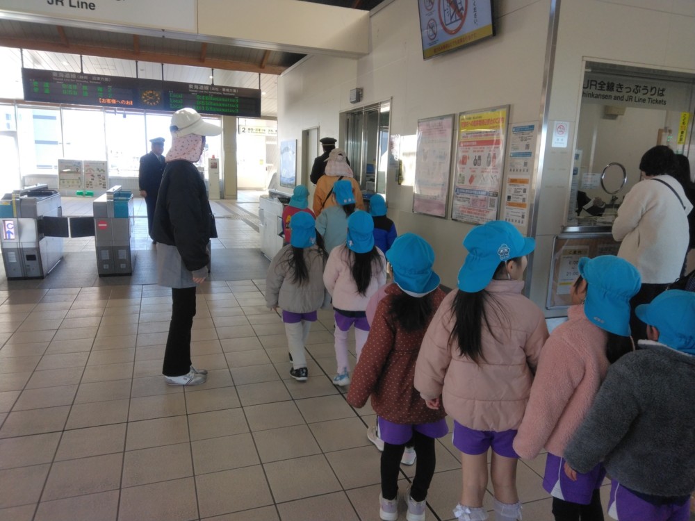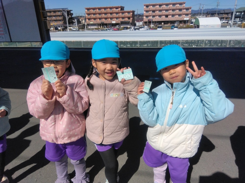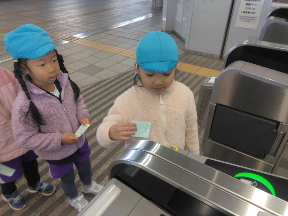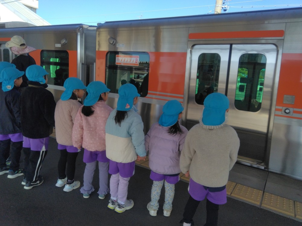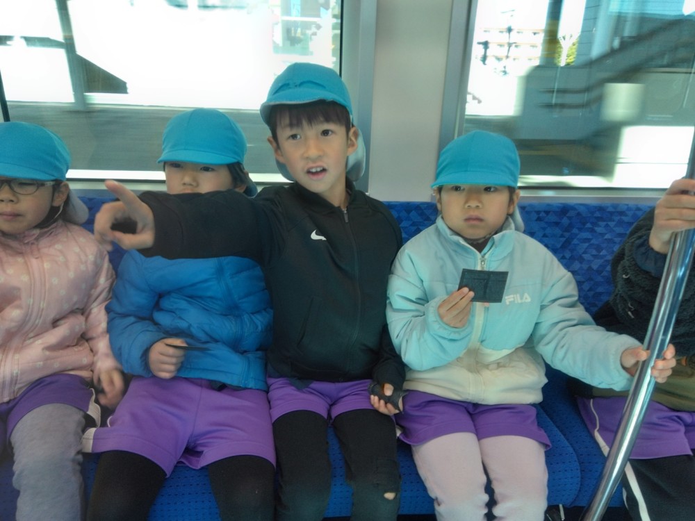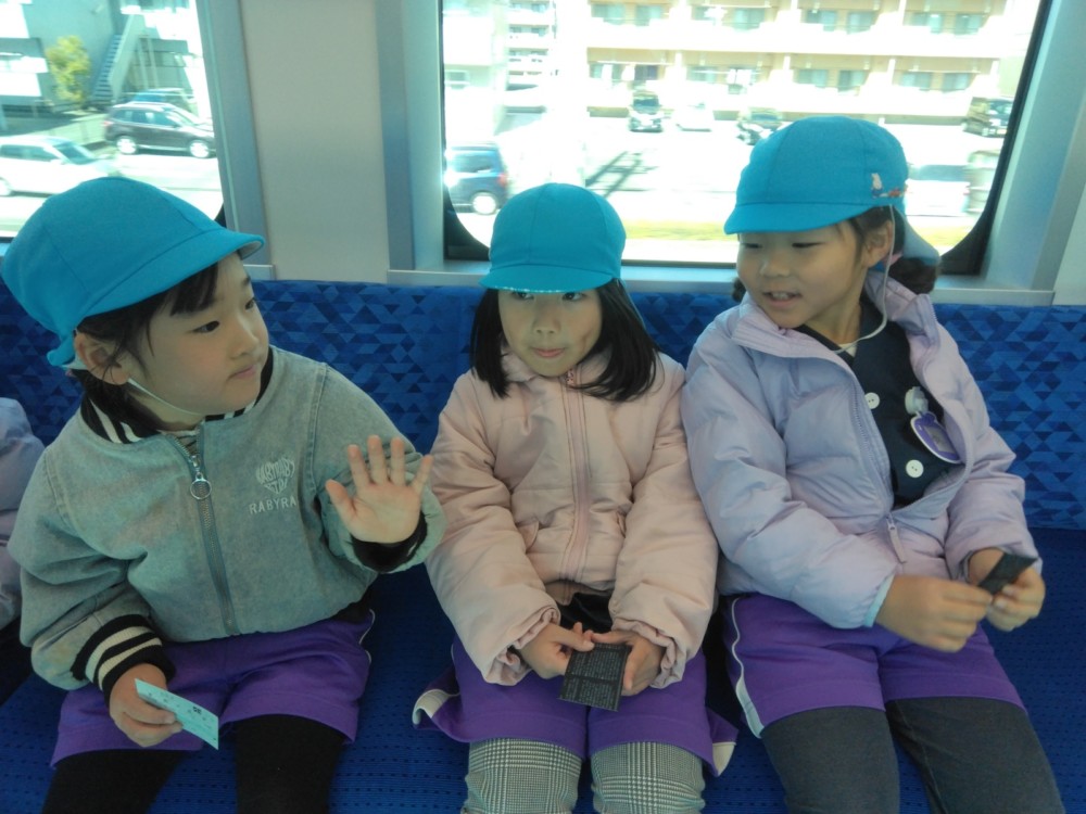 19日(木)めろん組さんは、山名幼稚園の年長児みず組さん、あお組さん、愛野こども園の年長児あお1組さん、あお2組さん、愛ノ宮保育園の年長児らいおん組さんと一緒に愛野こども園で交流保育をおこないました。120名近くの年長児さんが集まりました。そして、なんと今回は、電車に乗って愛野駅を往復です。一区間ですが、ドキドキ、ワクワク嬉しいですね。
