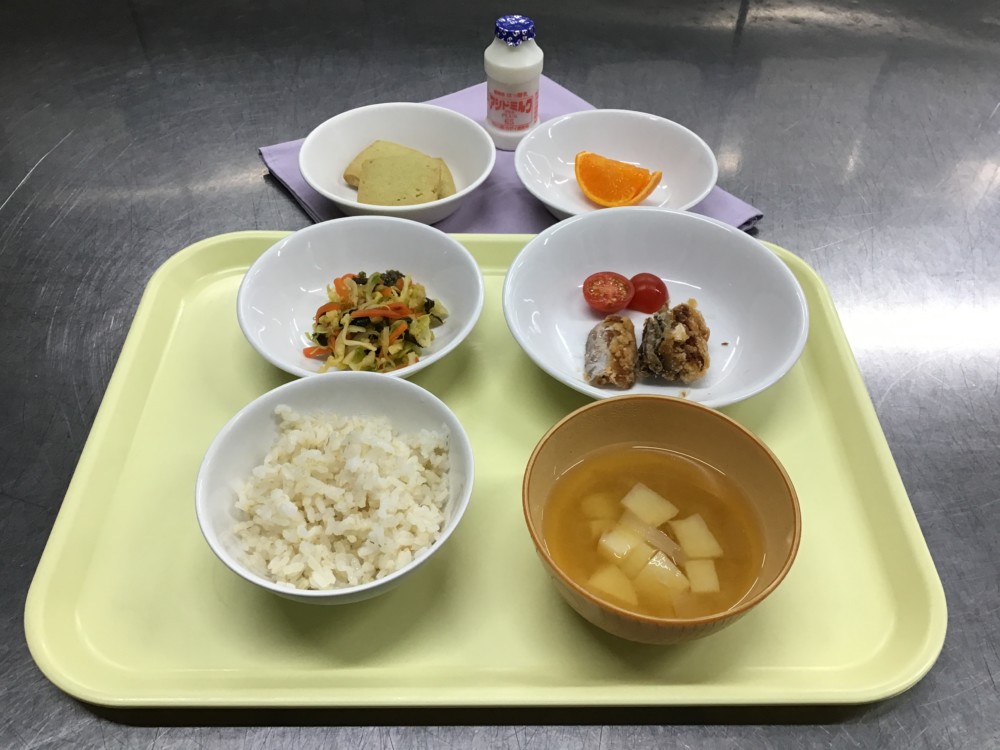 3月13日の給食 2026年03月13日 3月13日(金) 七分づきごはん みそ汁(じゃがいも) 魚の竜田揚げ キャベツの磯和え おやつ アシドミルク クッキー(お茶) かんきつ類 写真は3歳児の分量です。