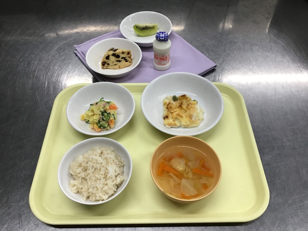 3月27日の給食 2026年03月27日 3月27日(金) 【※は年長リクエスト献立】 麦ごはん ※コンソメスープ ※グラタン さつまいものサラダ おやつ アシドミルク スコーン(レーズン) キウイフルーツ 写真は3歳児の分量ですくたx。