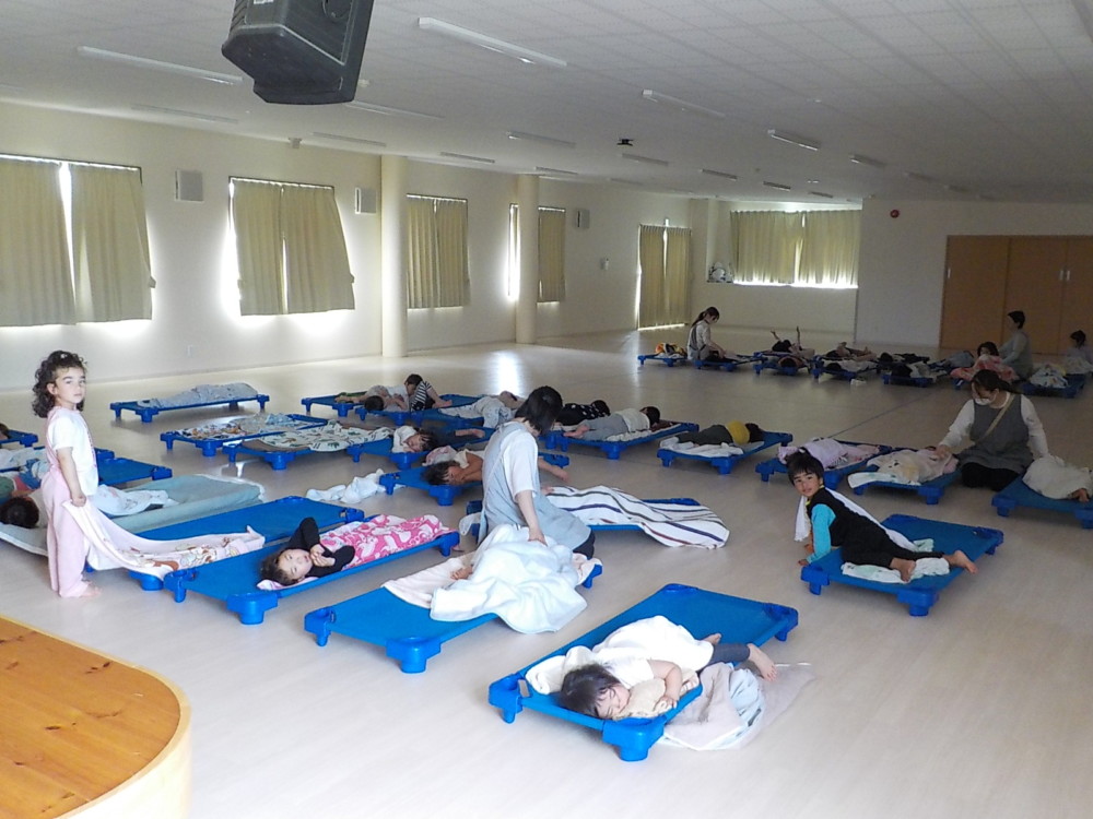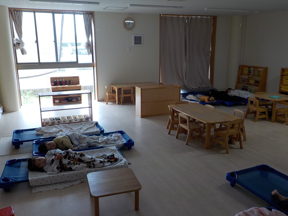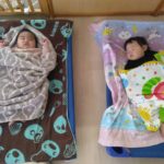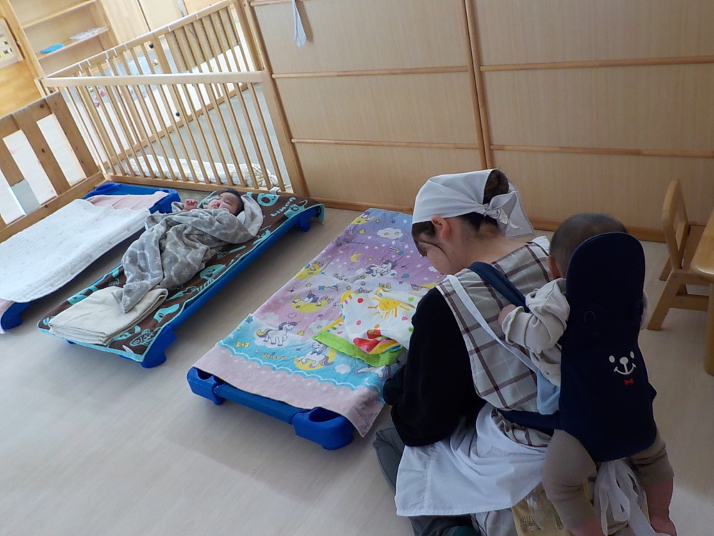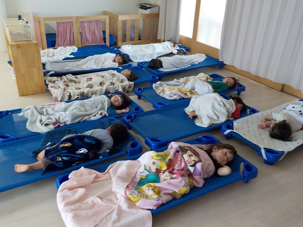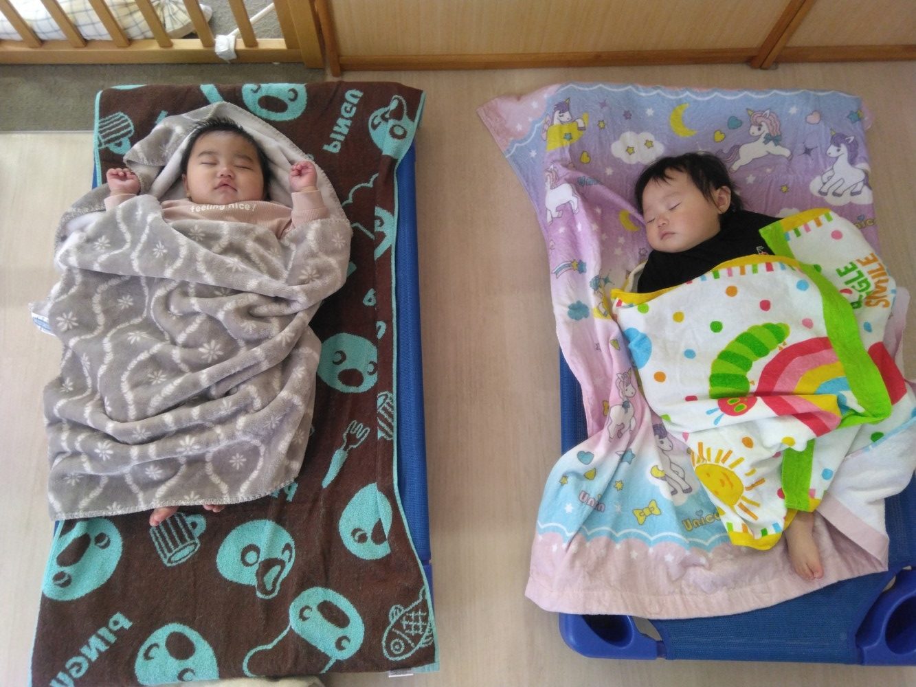 睡眠 2026年04月14日 4月14日(火)より、新入園児のお昼寝が始まりました。食後の様子です。 新年度が始まり2週間が経ちました。泣いている時間が少しずつ減ってきましたね。遊んで、食べて、眠れるようになれば、子どもさんにとって安心できる場所になった証拠です。お昼寝から早く起きてしまう子も多く、ぐっすり眠れるのは、まだしばらくかかりそうですね。