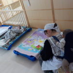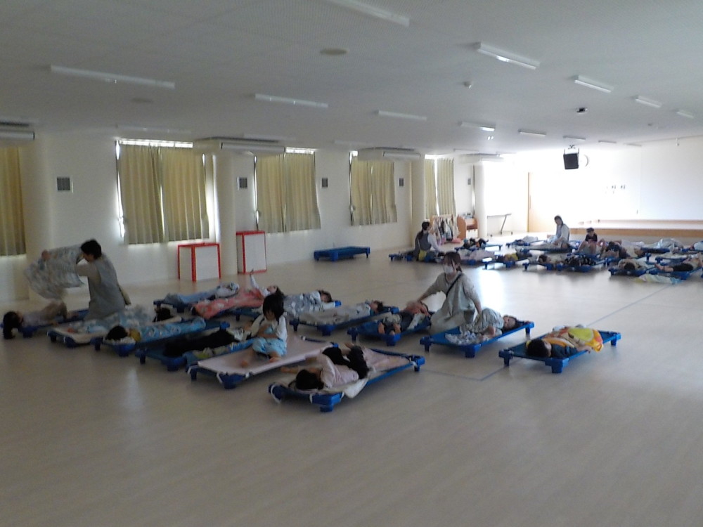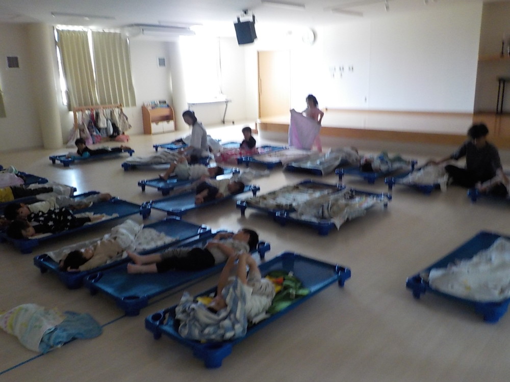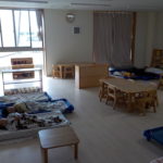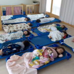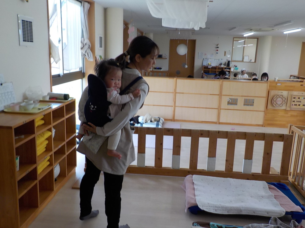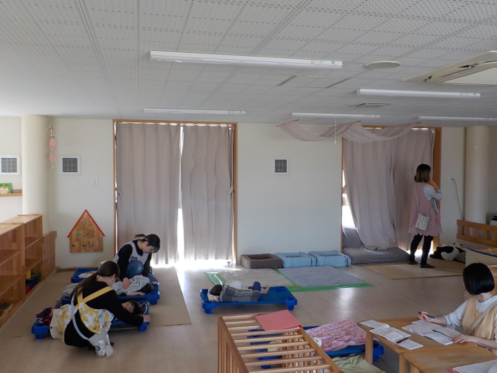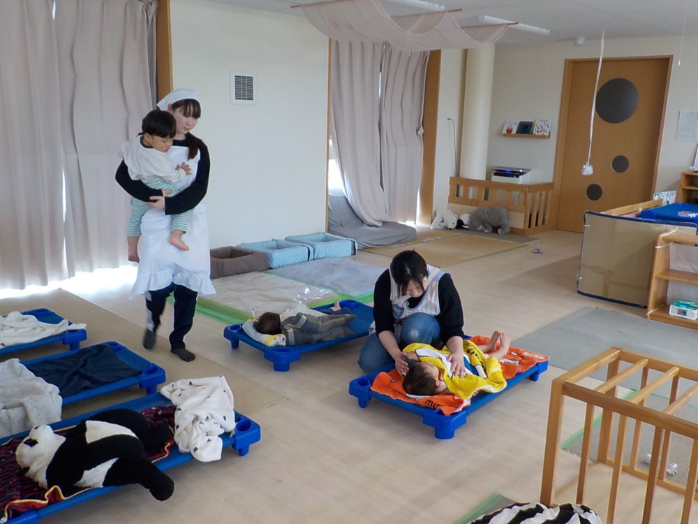 睡眠 2026年04月14日 4月14日(火)より、新入園児のお昼寝が始まりました。食後の様子です。 新年度が始まり2週間が経ちました。泣いている時間が少しずつ減ってきましたね。遊んで、食べて、眠れるようになれば、子どもさんにとって安心できる場所になった証拠です。お昼寝から早く起きてしまう子も多く、ぐっすり眠れるのは、まだしばらくかかりそうですね。