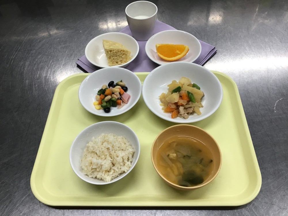 4月28日の給食 2026年04月28日 4月28日(火) 七分づきごはん みそ汁(玉ねぎ) 肉じゃが(豚肉) コロコロサラダ(黒豆) おやつ 牛乳 みそ蒸しパン オレンジ 写真は3歳児の分量ですくたx。